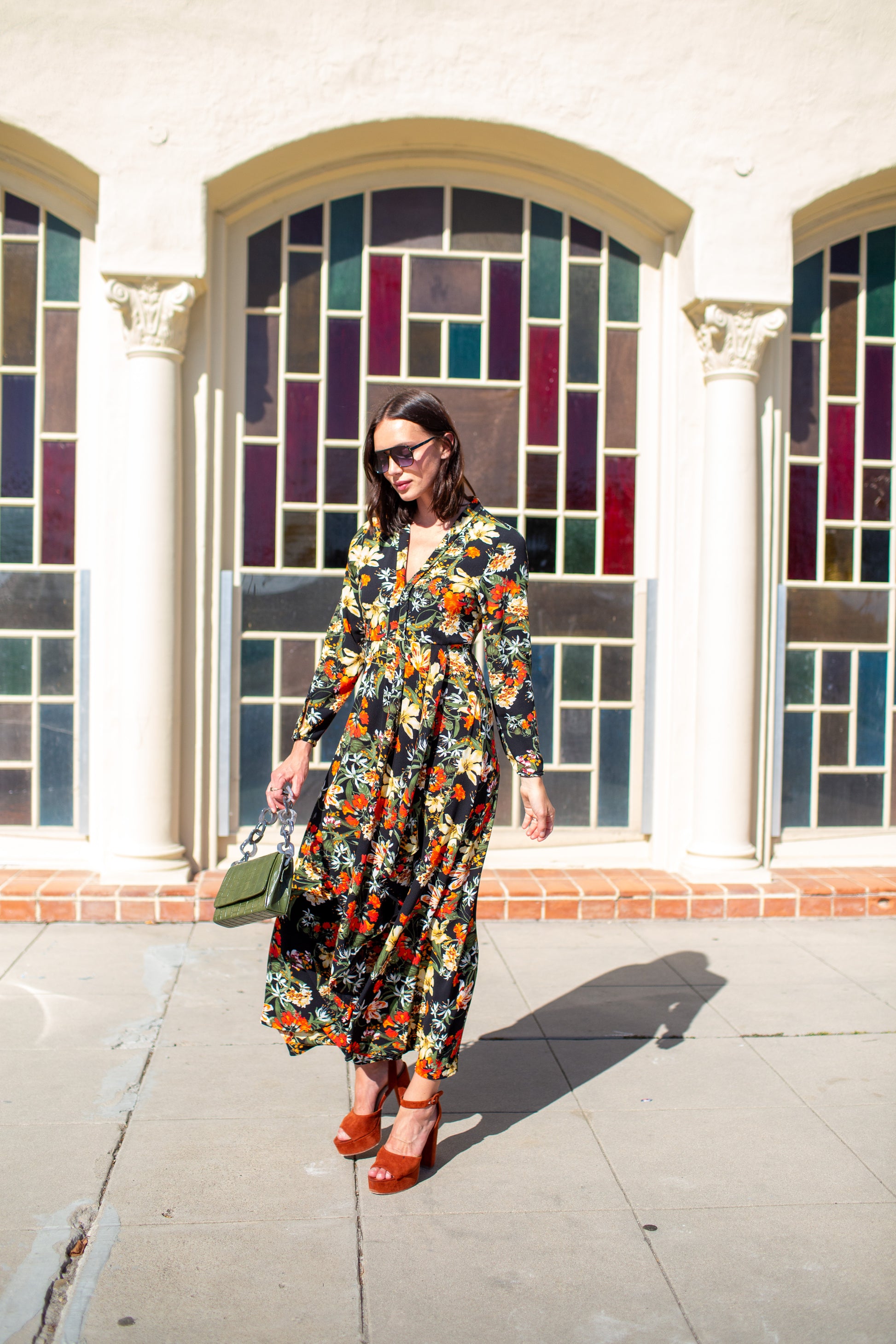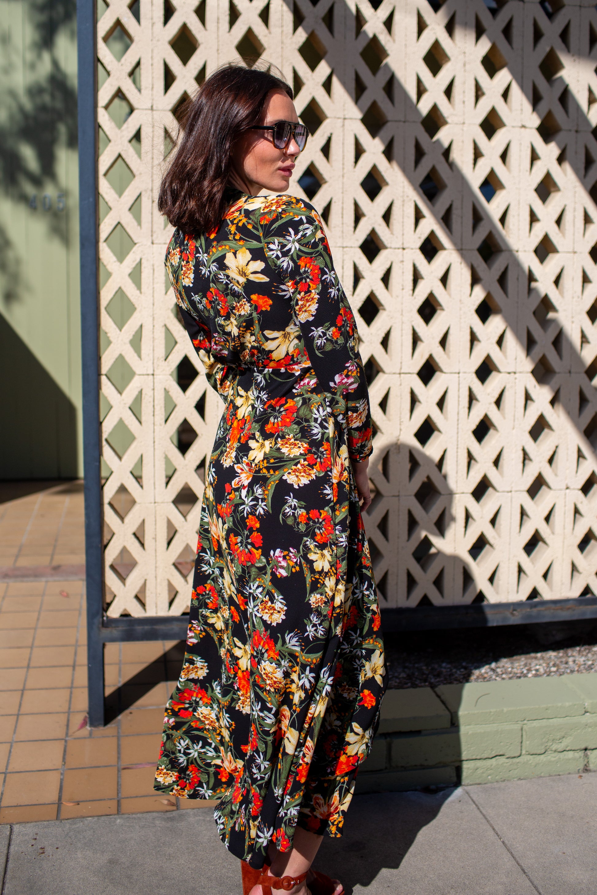 This shawl collar, boho maxi dress is our new favorite silhouette. Featuring a soft cross ruffle skirt, button sleeve and invisible zipper at side, this piece is perfect for desk to dinner styling. Made with a front hook & eye closure and an airy bubble crepe georgette. Bohemian splendor; handmade in California.