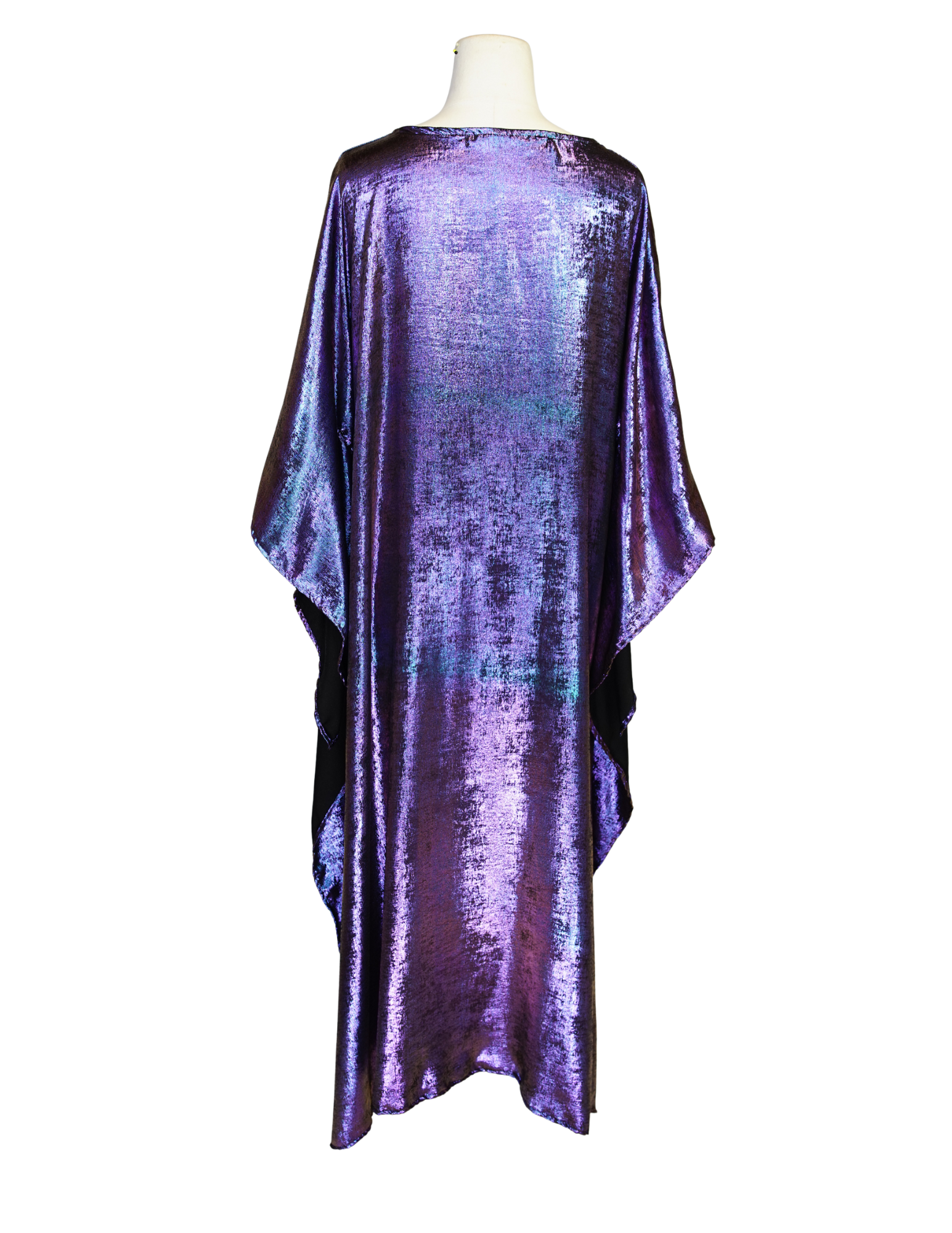 Indulge in the art of self-expression in this decadent metallic caftan. This exquisite garment is more than just a piece of clothing; it's a celebration of fabric in all its glory. This piece offers an airy fit designed to drape beautifully on all body types. The cape back floats behind for a dramatic effect and the slinky micro velvet with a iridescent amethyst and blue shimmering foil carries this top from opera to dinner... The newest shape on the JG menu and is sure to be a collectors item.