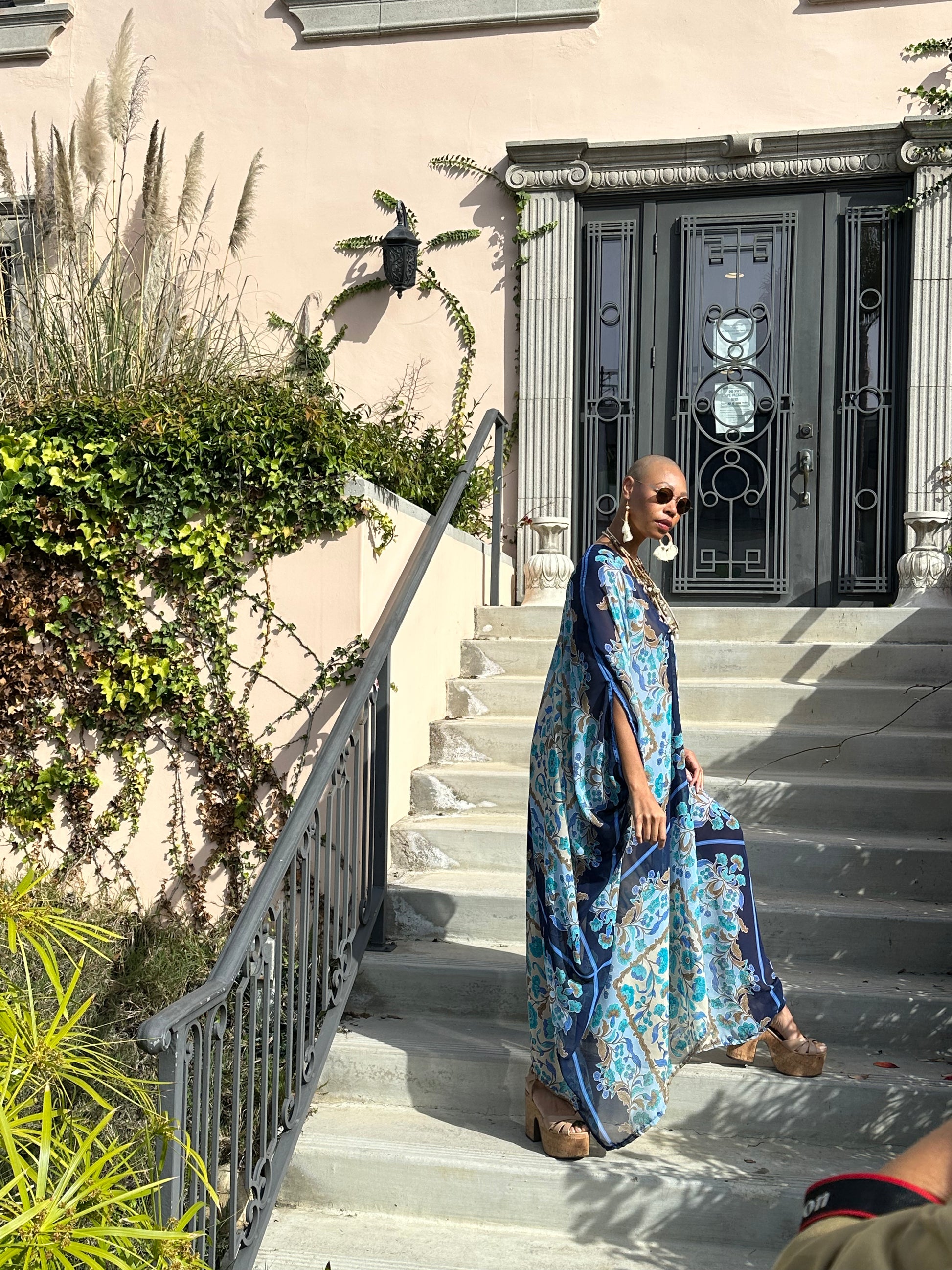 Introducing the Billie Jean Scarf Print Caftan, a must-have for every season! This unique caftan is hand-cut and handmade in San Diego, featuring a blue floral scarf print with a navy border. Perfect for adding a touch of quirky charm to any outfit. Don't miss out - pre-order now!