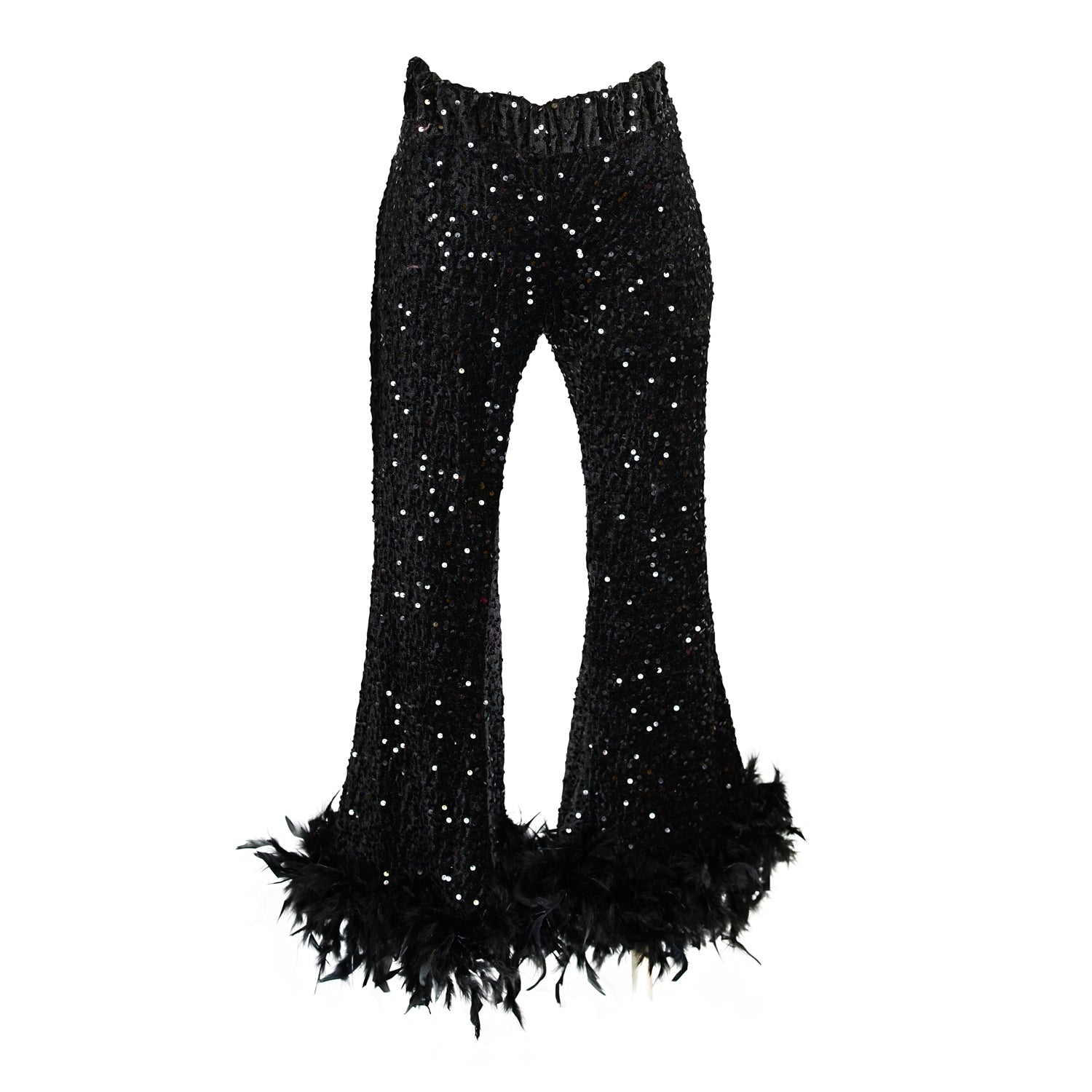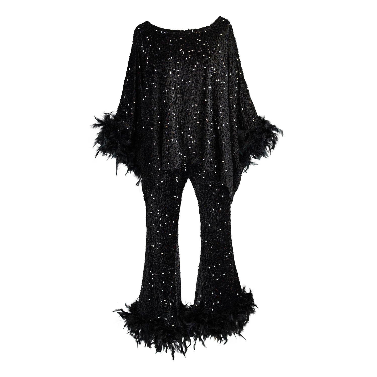 The Cara Disco Set is pure Studio 54 energy with a modern goddess twist! Made from a one size fits all scarf top and matching cropped bell bottoms both covered in sparkling black sequins and trimmed in flirty, dramatic feathers.