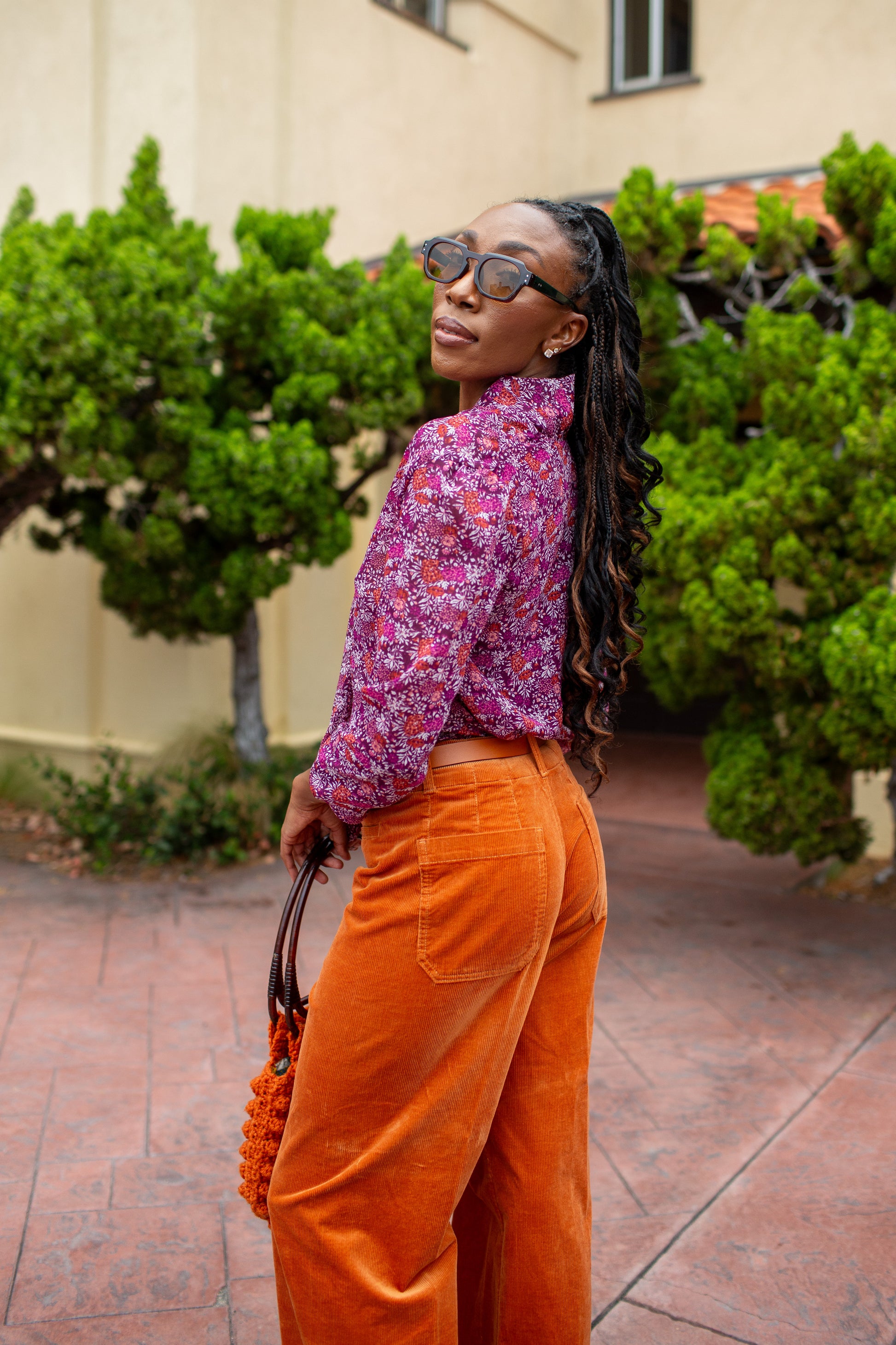 This limited edition glam rock inspired blouse is perfect from desk to dinner. Featuring a versatile bow front and sheer crimson floral fabric.
