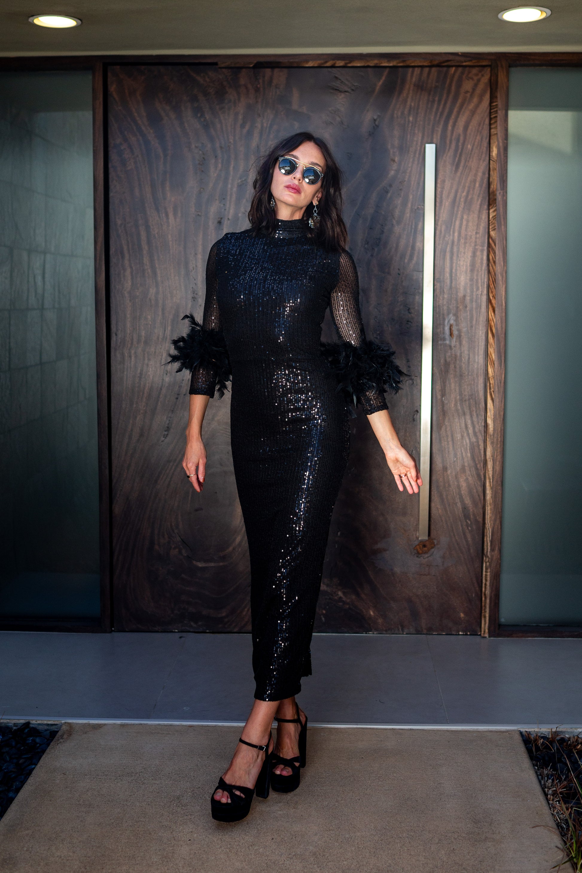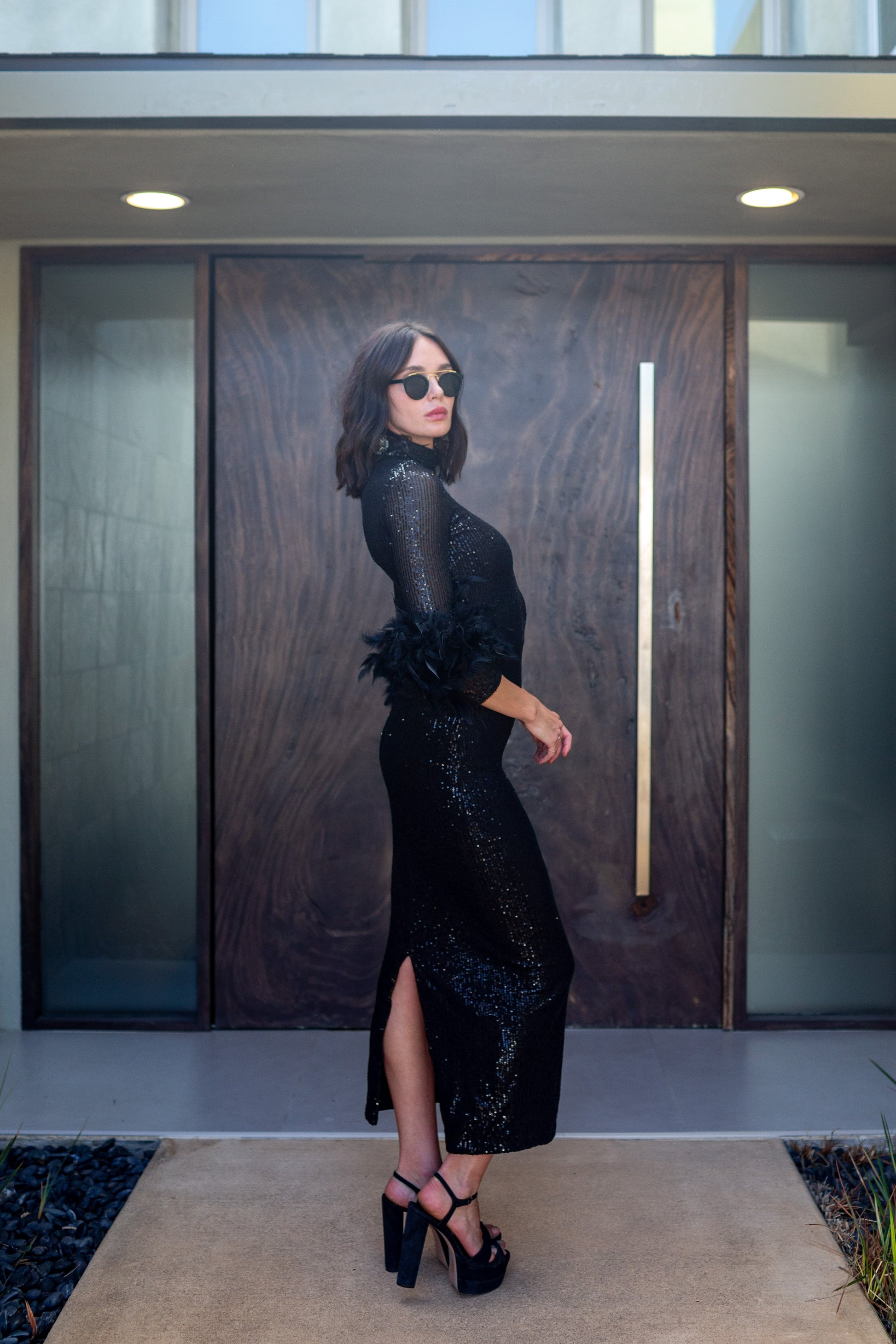 Unleash your bold and daring side with the Catroux Dress in Darkest Night Onyx. This body-con maxi dress features a classic black sequin base with detachable feather cuffs. This piece will make a statement wherever you go. The comfortable and flattering fit, along with the mock neck and long sleeves, add an extra touch of glamour to this floor length dress. Take risks and stand out in this eye-catching piece!