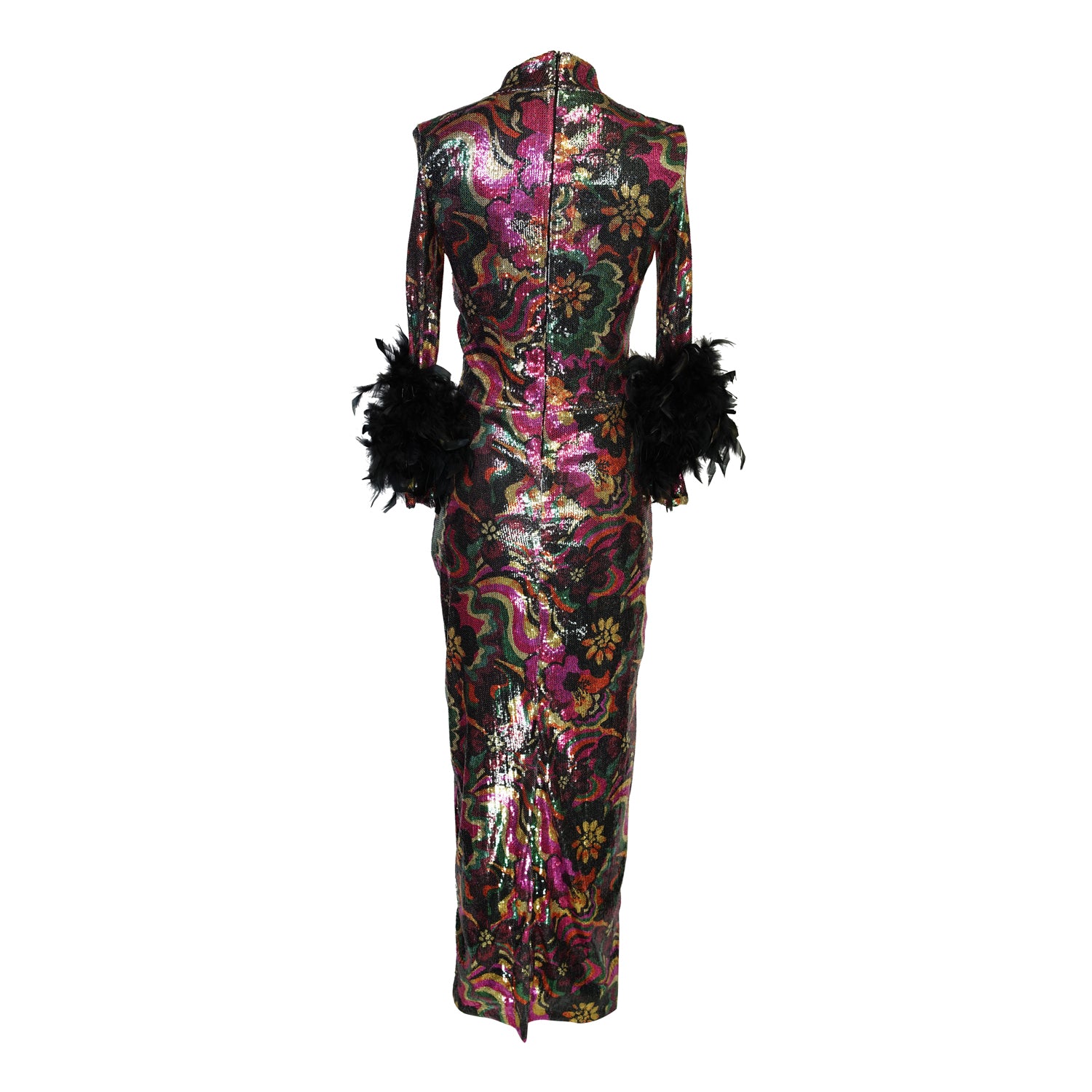 Unleash your bold and daring side with the Catroux Dress in Hysteria. This body-con maxi dress features a dramatic psychedelic printed sequin base with detachable feather cuffs. This piece will make a statement wherever you go. The comfortable and flattering fit, along with the mock neck and long sleeves, add an extra touch of glamour to this floor length dress. Take risks and stand out in this eye-catching piece!