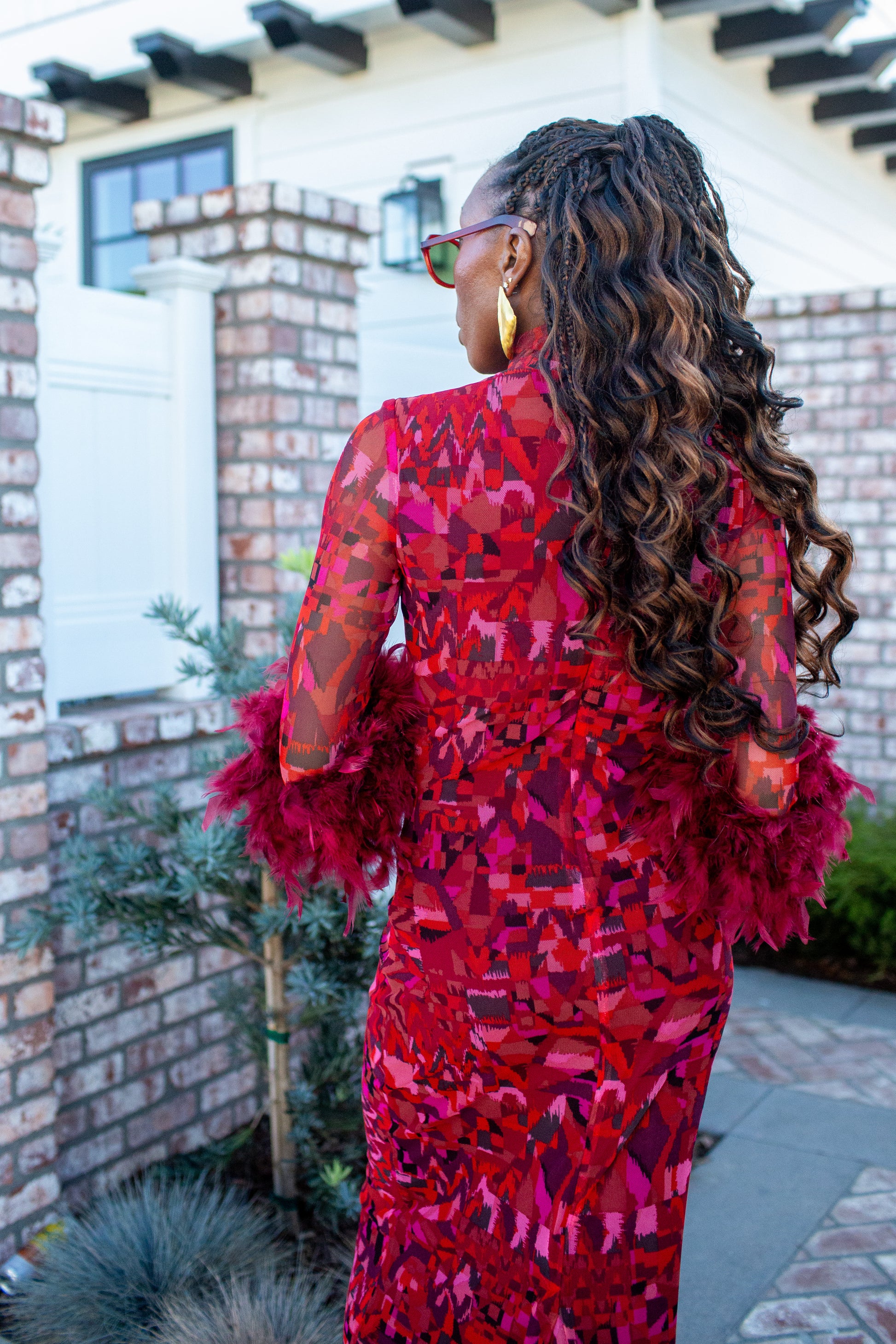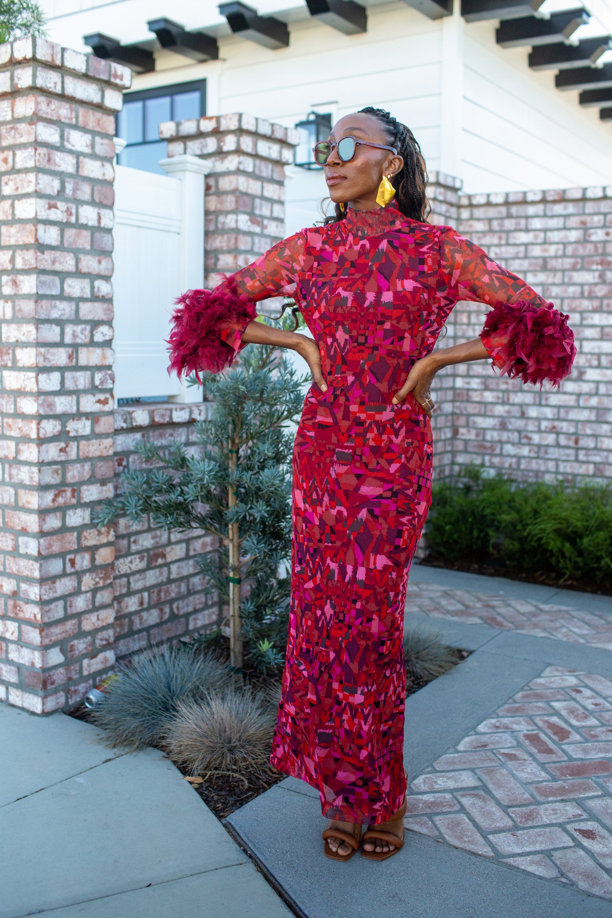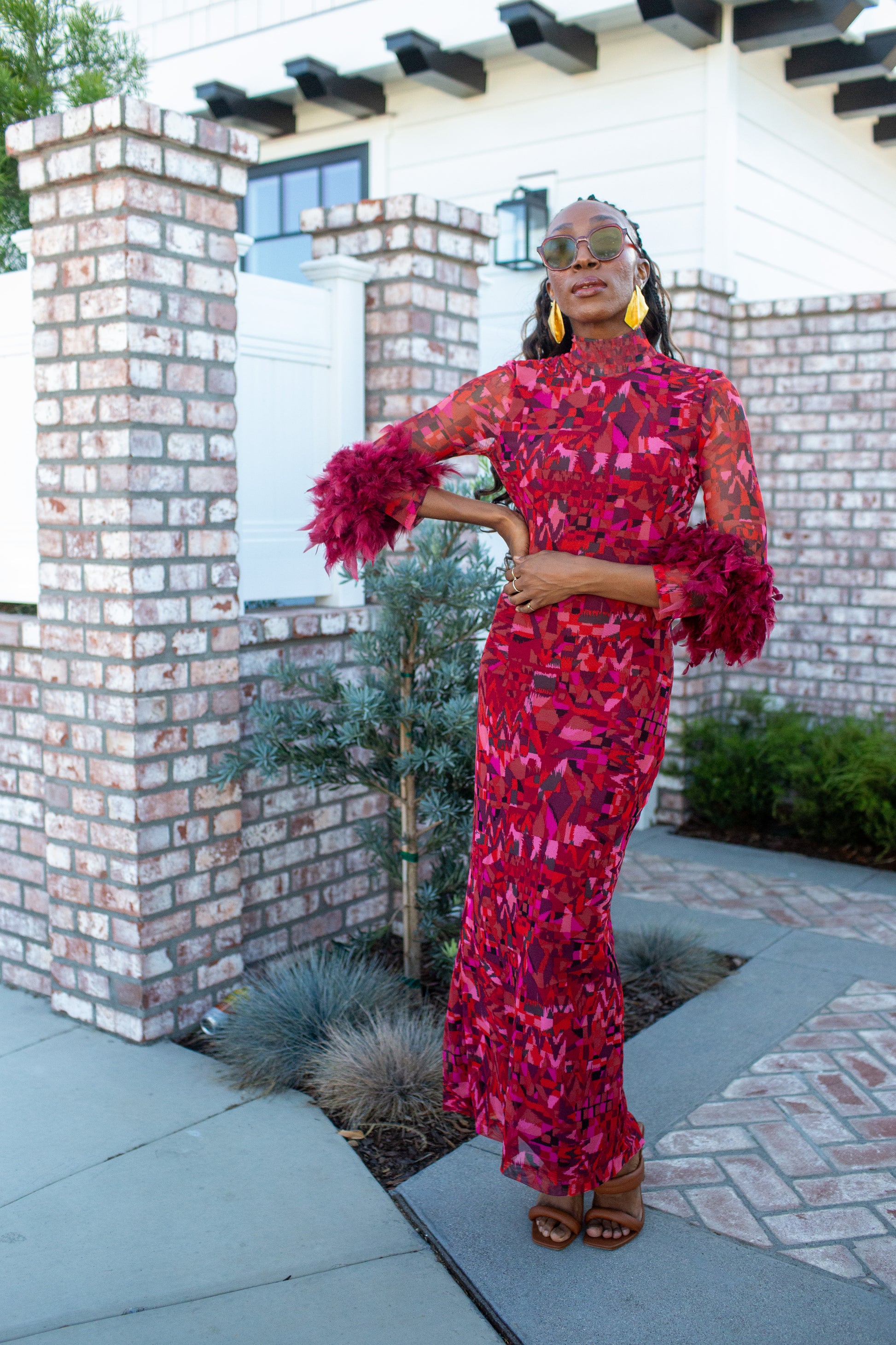 Turn every entrance into a moment in the Catroux in Electric Sangria by Jennafer Grace. She is printed in a vivid red on red modernist printed mesh - a rich collision of fuchsia, ruby and crimson in an abstract art house mosaic, she lined in soft jersey for a fluid body skimming fit, finished with a mock neck and subtle kick slit at the back knee for effortless movement. Her sheer long sleeves end in a dramatic, removable feather cuff -so you can go full glam or keep it sleek depending on the night.
