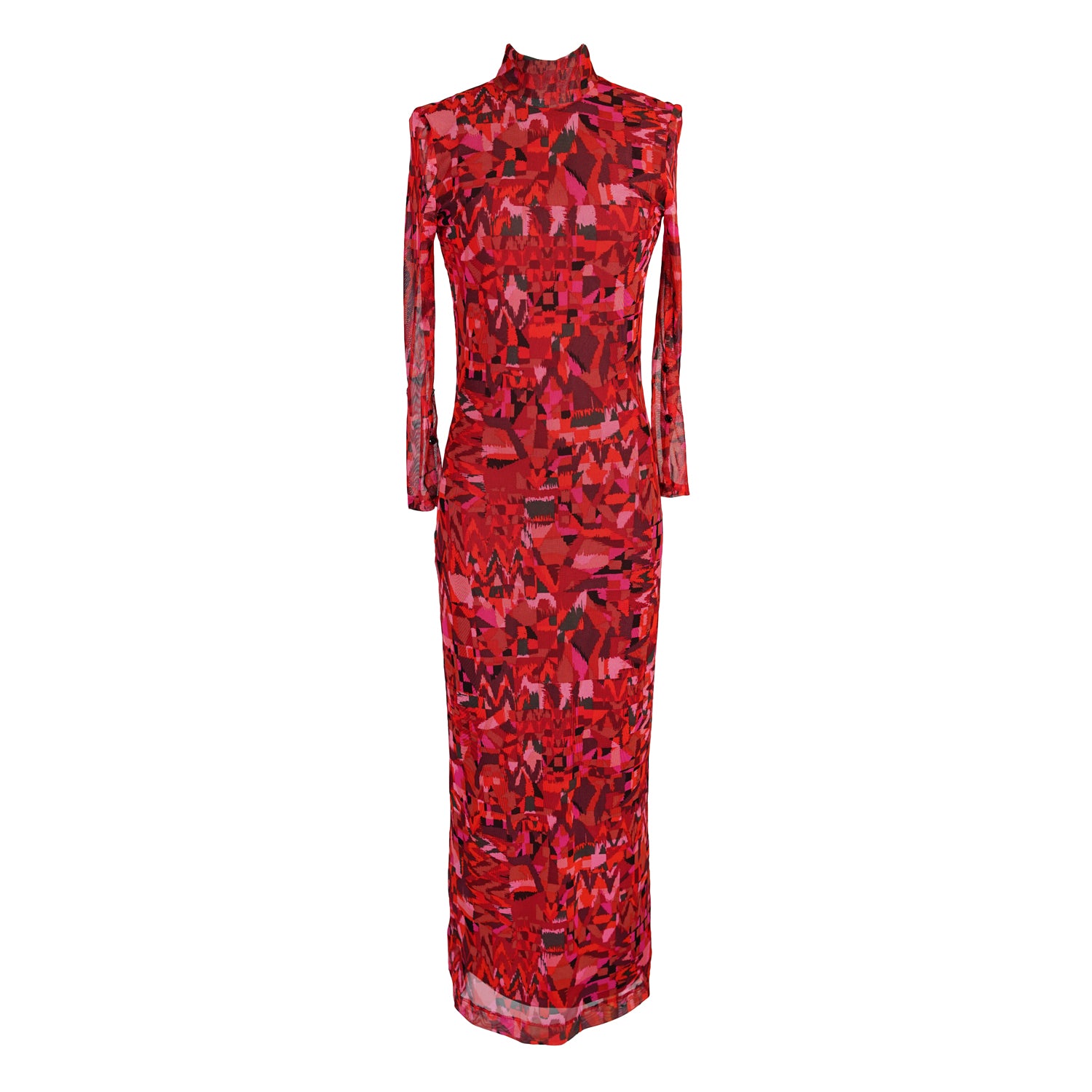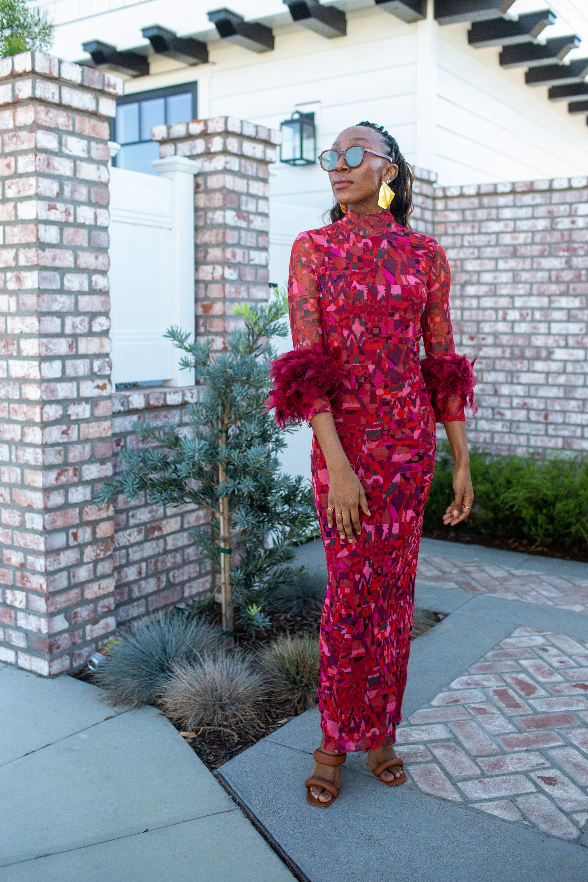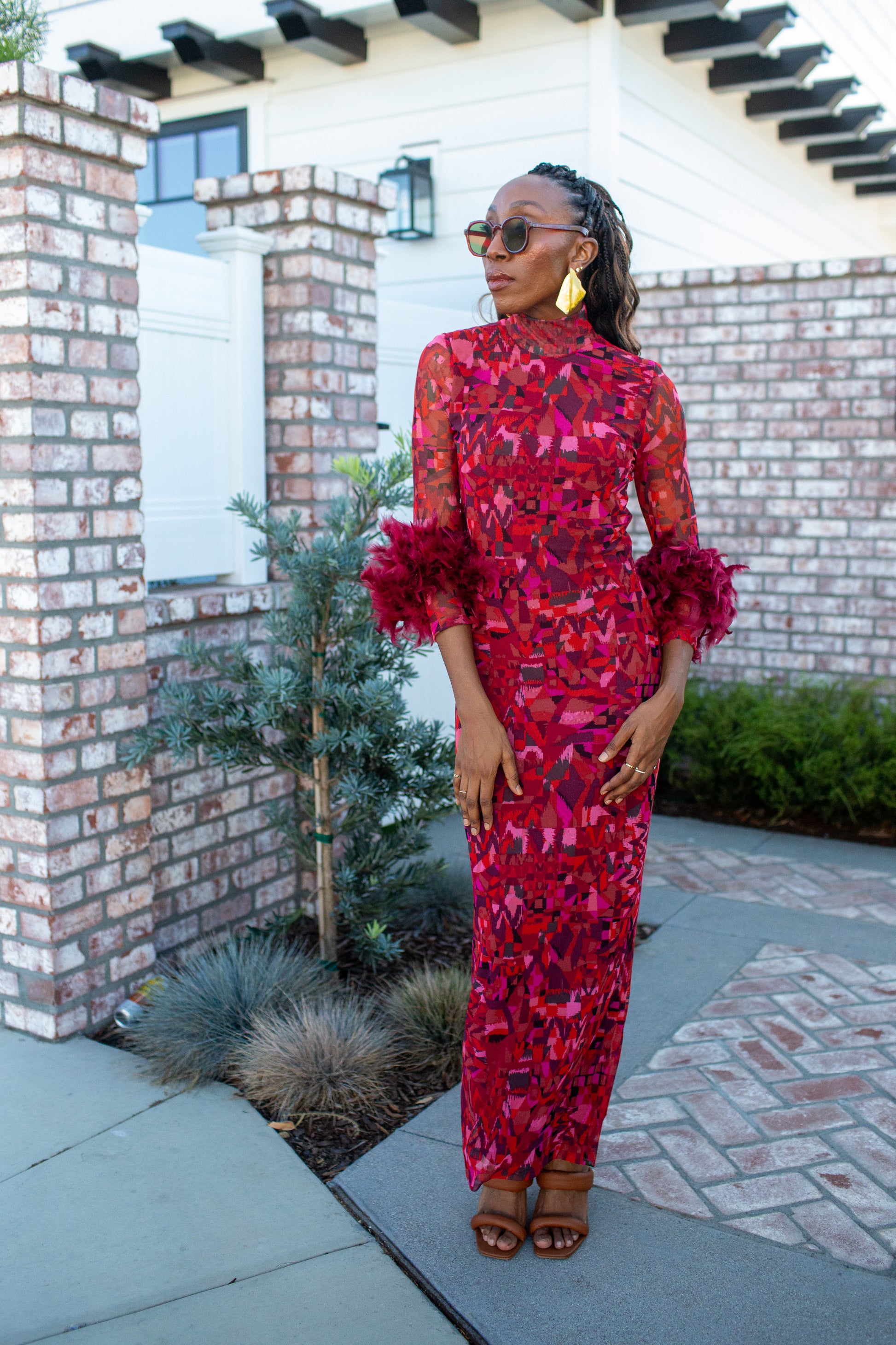 Turn every entrance into a moment in the Catroux in Electric Sangria by Jennafer Grace. She is printed in a vivid red on red modernist printed mesh - a rich collision of fuchsia, ruby and crimson in an abstract art house mosaic, she lined in soft jersey for a fluid body skimming fit, finished with a mock neck and subtle kick slit at the back knee for effortless movement. Her sheer long sleeves end in a dramatic, removable feather cuff -so you can go full glam or keep it sleek depending on the night.