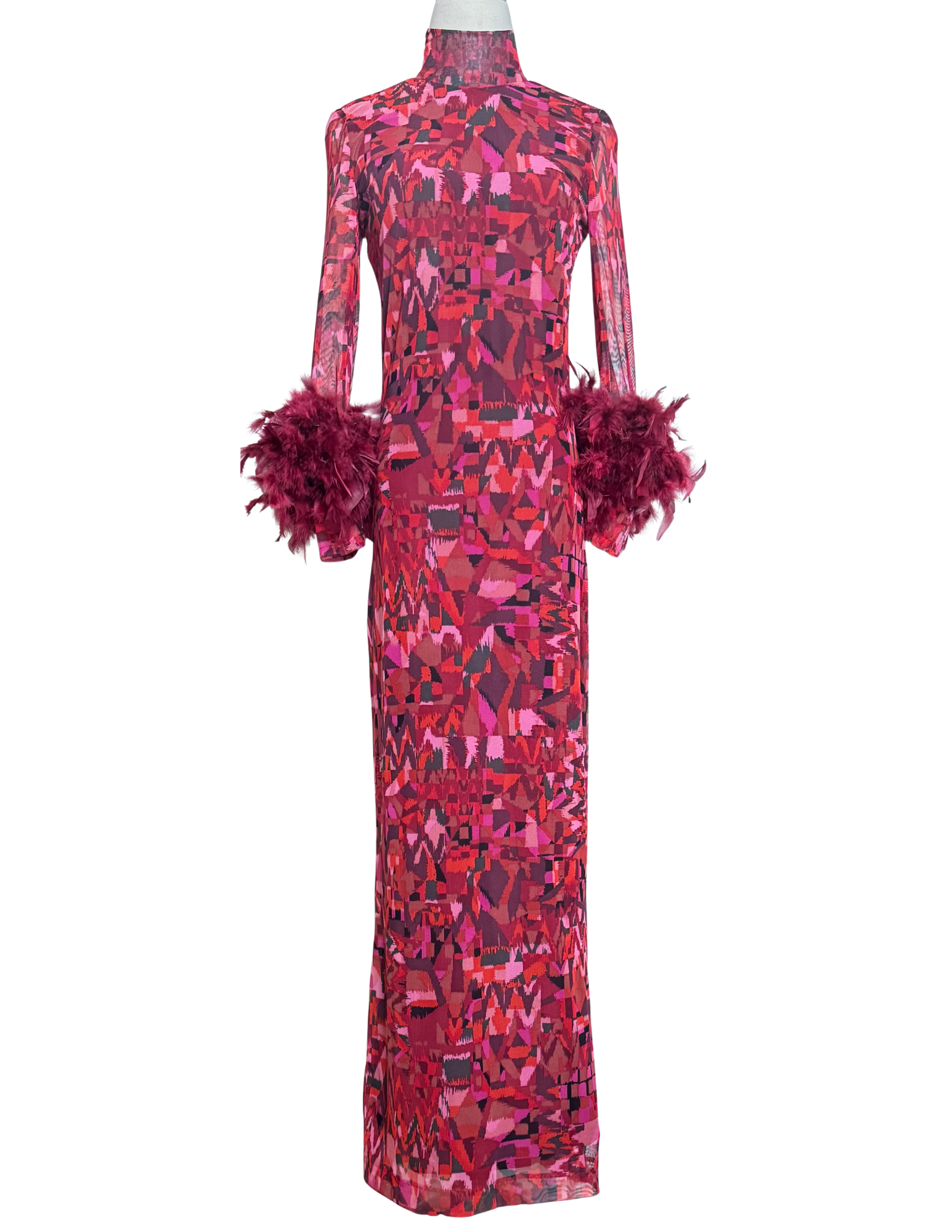 Turn every entrance into a moment in the Catroux in Electric Sangria by Jennafer Grace. She is printed in a vivid red on red modernist printed mesh - a rich collision of fuchsia, ruby and crimson in an abstract art house mosaic, she lined in soft jersey for a fluid body skimming fit, finished with a mock neck and subtle kick slit at the back knee for effortless movement. Her sheer long sleeves end in a dramatic, removable feather cuff -so you can go full glam or keep it sleek depending on the night.