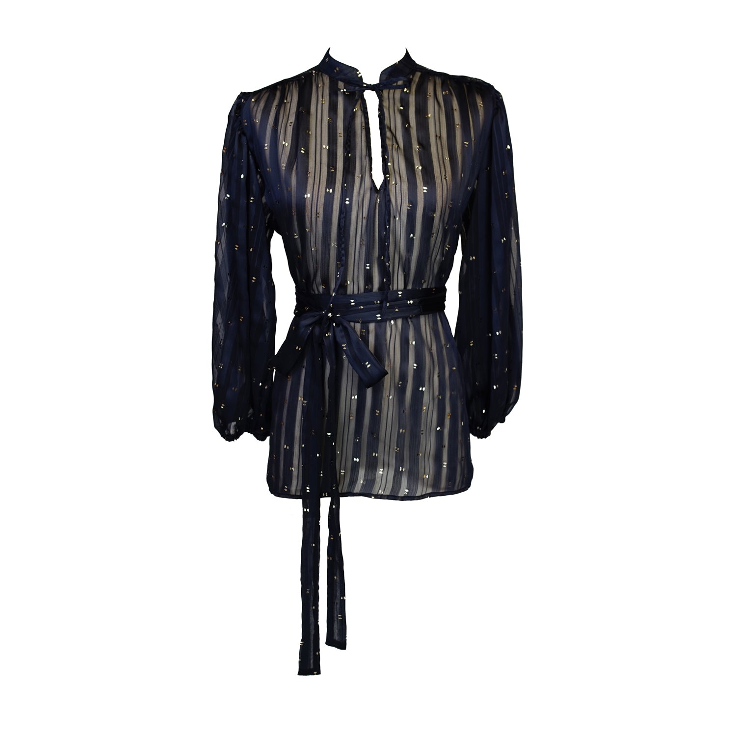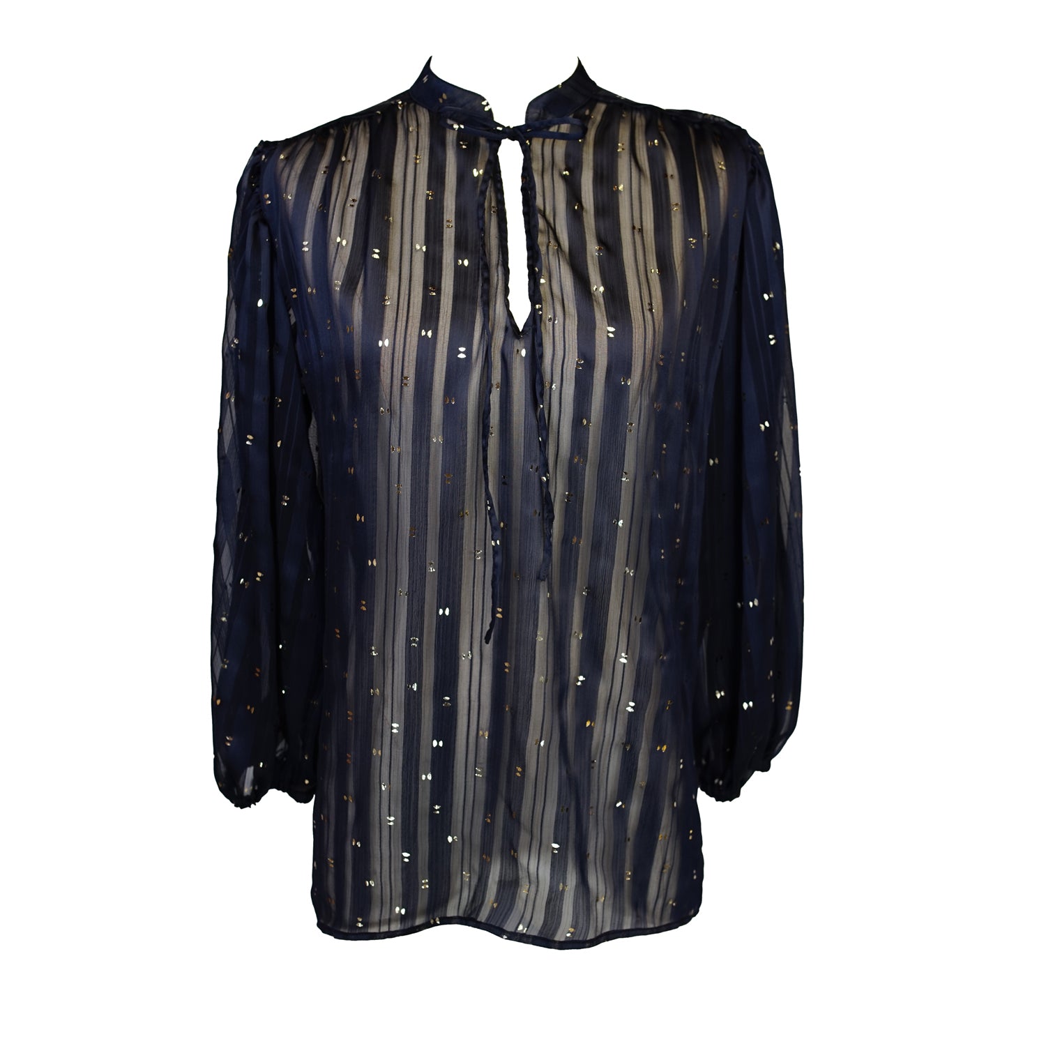 The midnight blue striped chiffon is the prefect base for the reflective silver pattern smattered across the blouse. The perfect topper for any outfit, to the office or the party, she is the perfect topper for any event.