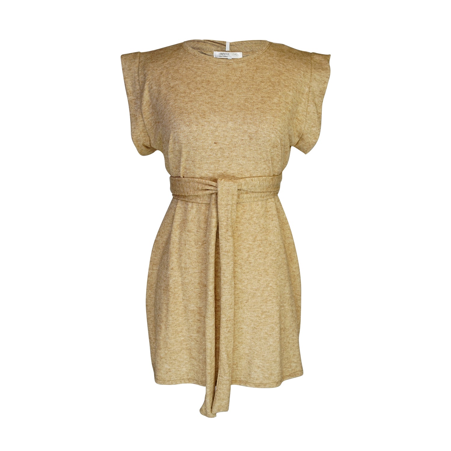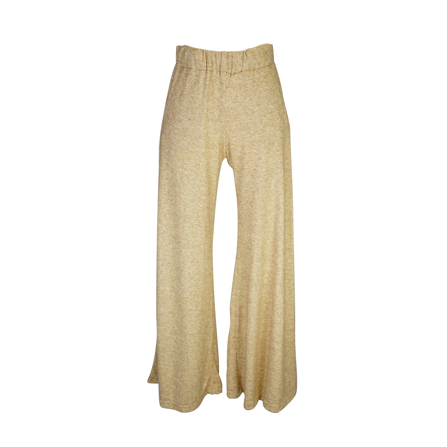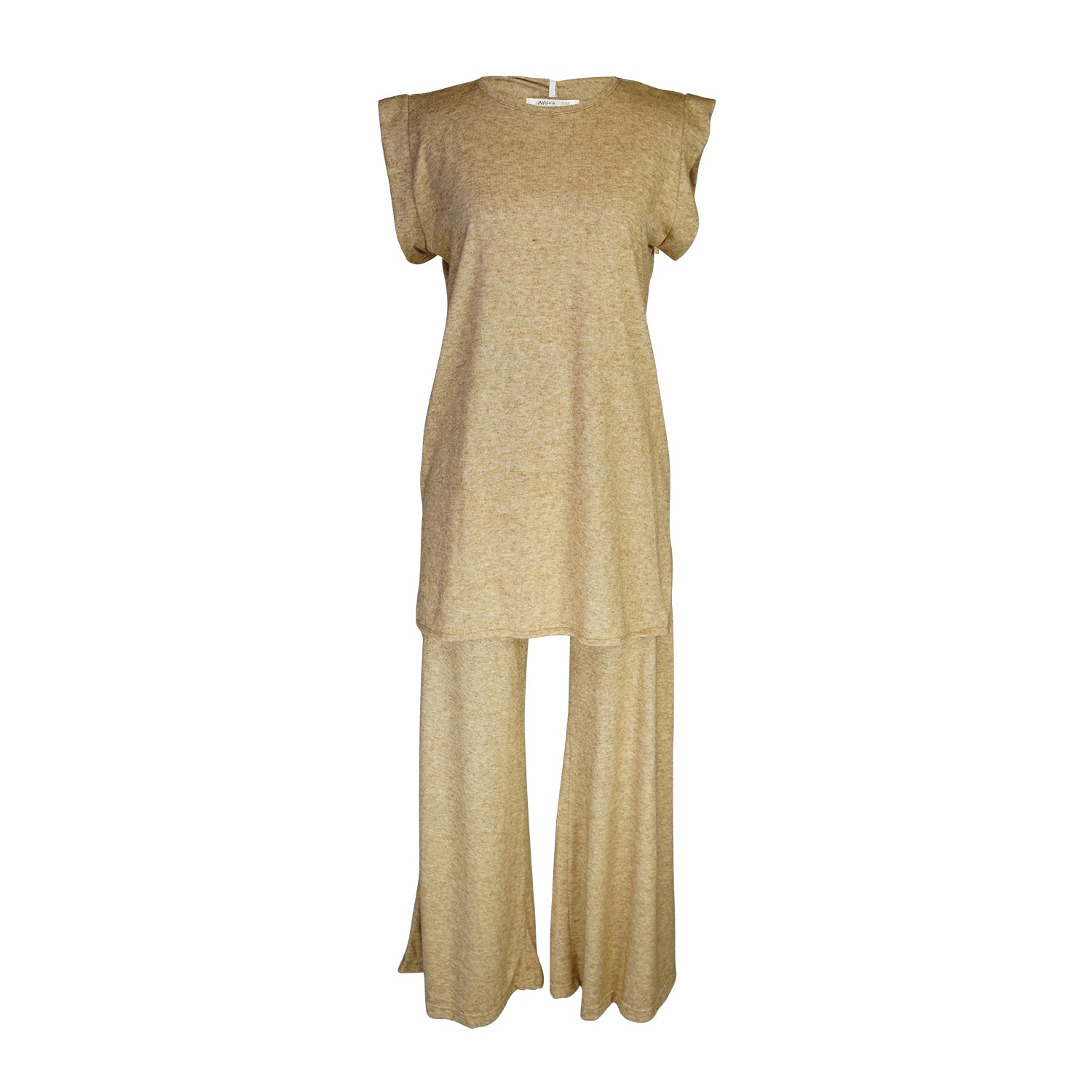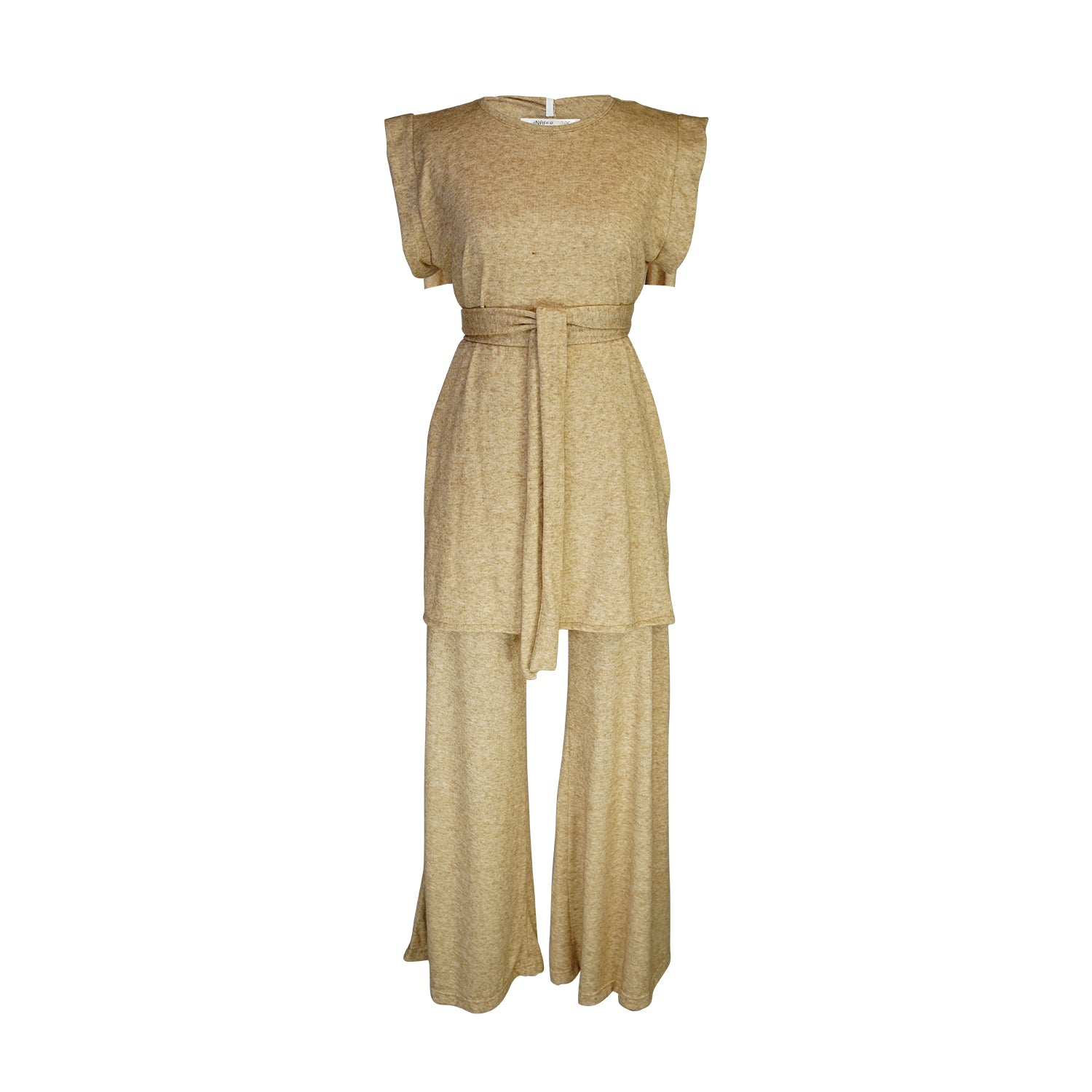 This ultra cozy tunic top and palazzo pant set was made from an ultrasoft deep cream colored brushed bamboo blend jersey. Featuring tab sleeves, side slits and an extended obi-style belt on the top, and pockets, elastic waist and a soft hidden drawstring on the bottoms. Standard inseam 32".