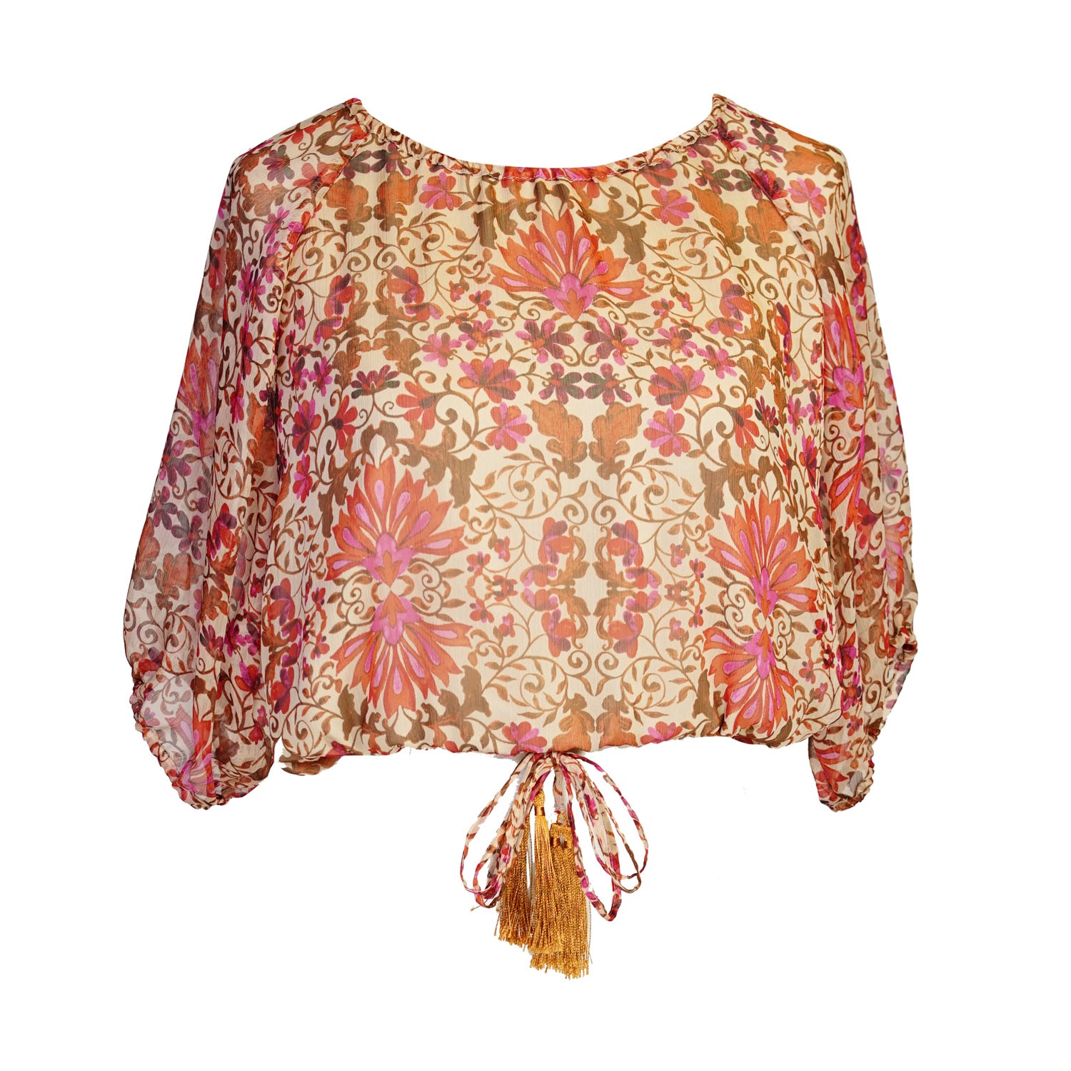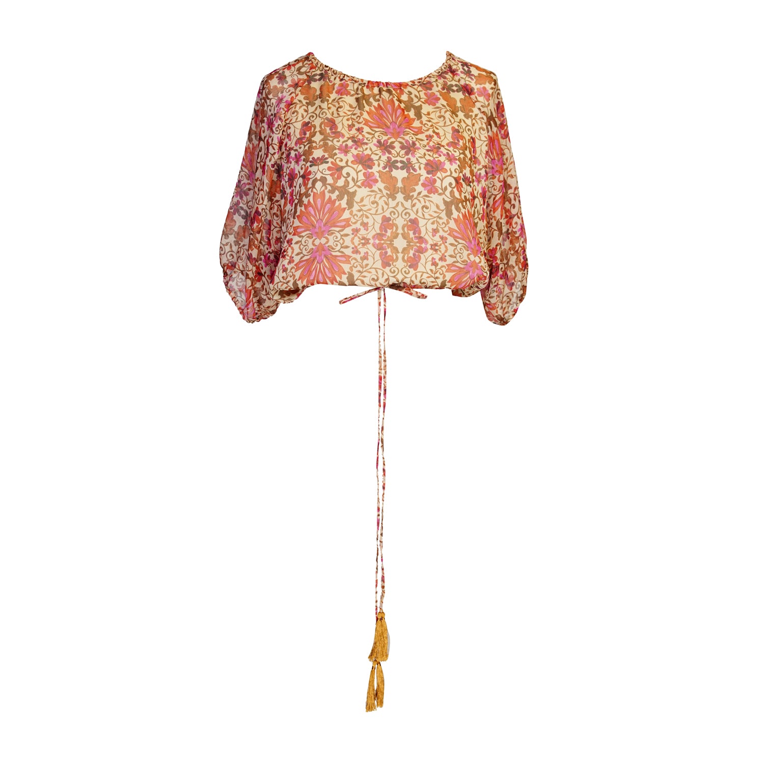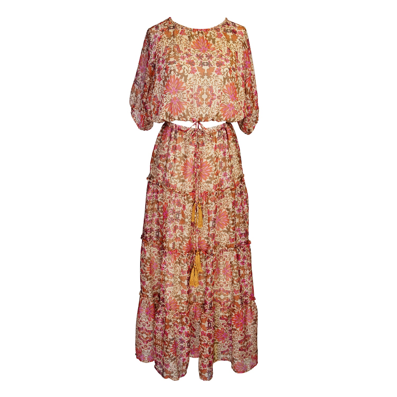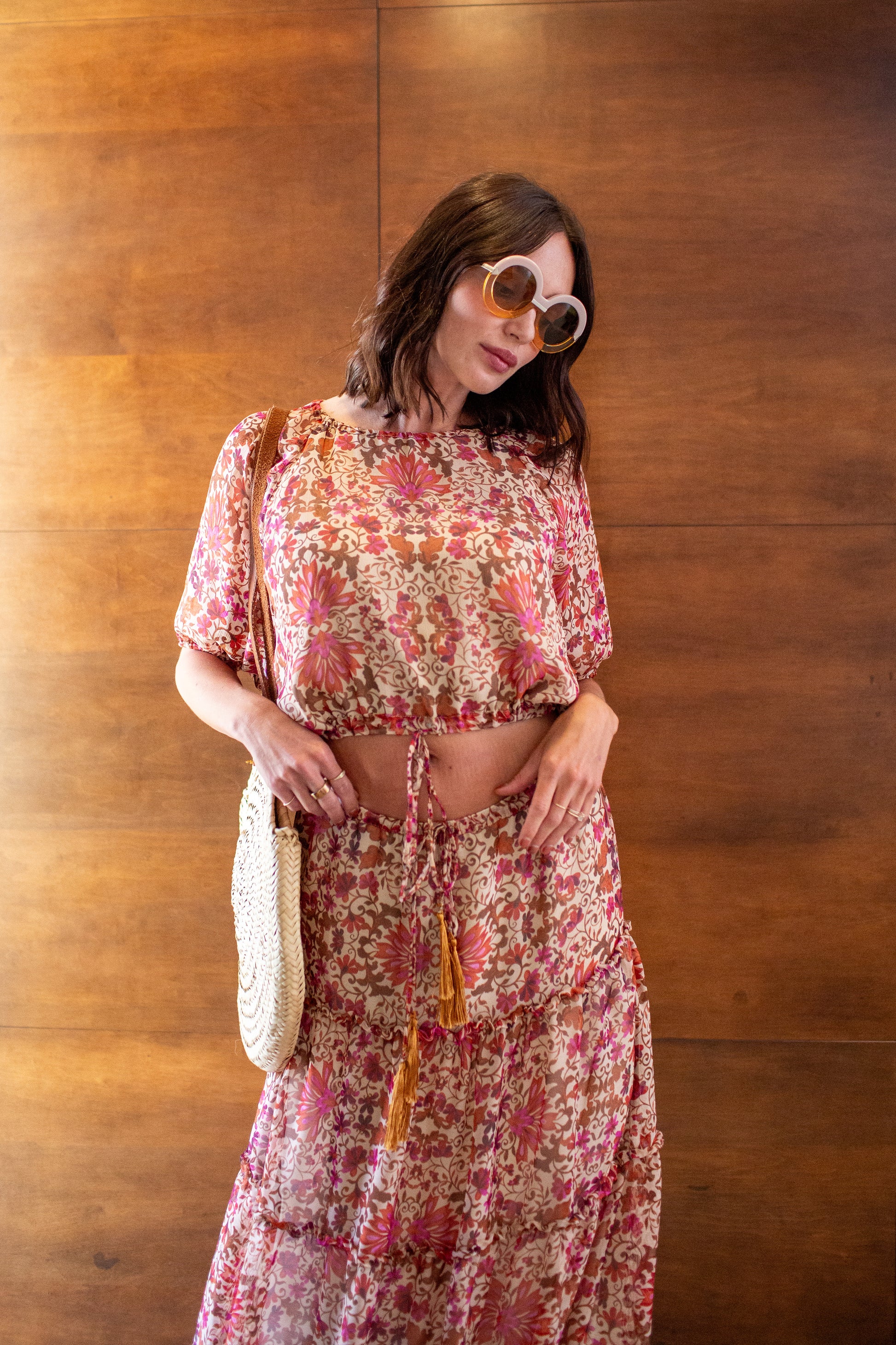 The Delilah Set in Rosewood by Jennafer Grace is a breezy bohemian dream in a sheer floral chiffon with earthy browns, dusty roses and pops of fuchsia. Featuring a relaxed blouse with billowy sleeves paired with a tiered maxi skirt, both cinched with tasseled ties for a touch of golden drama Lightweight, romantic, and effortlessly glam.