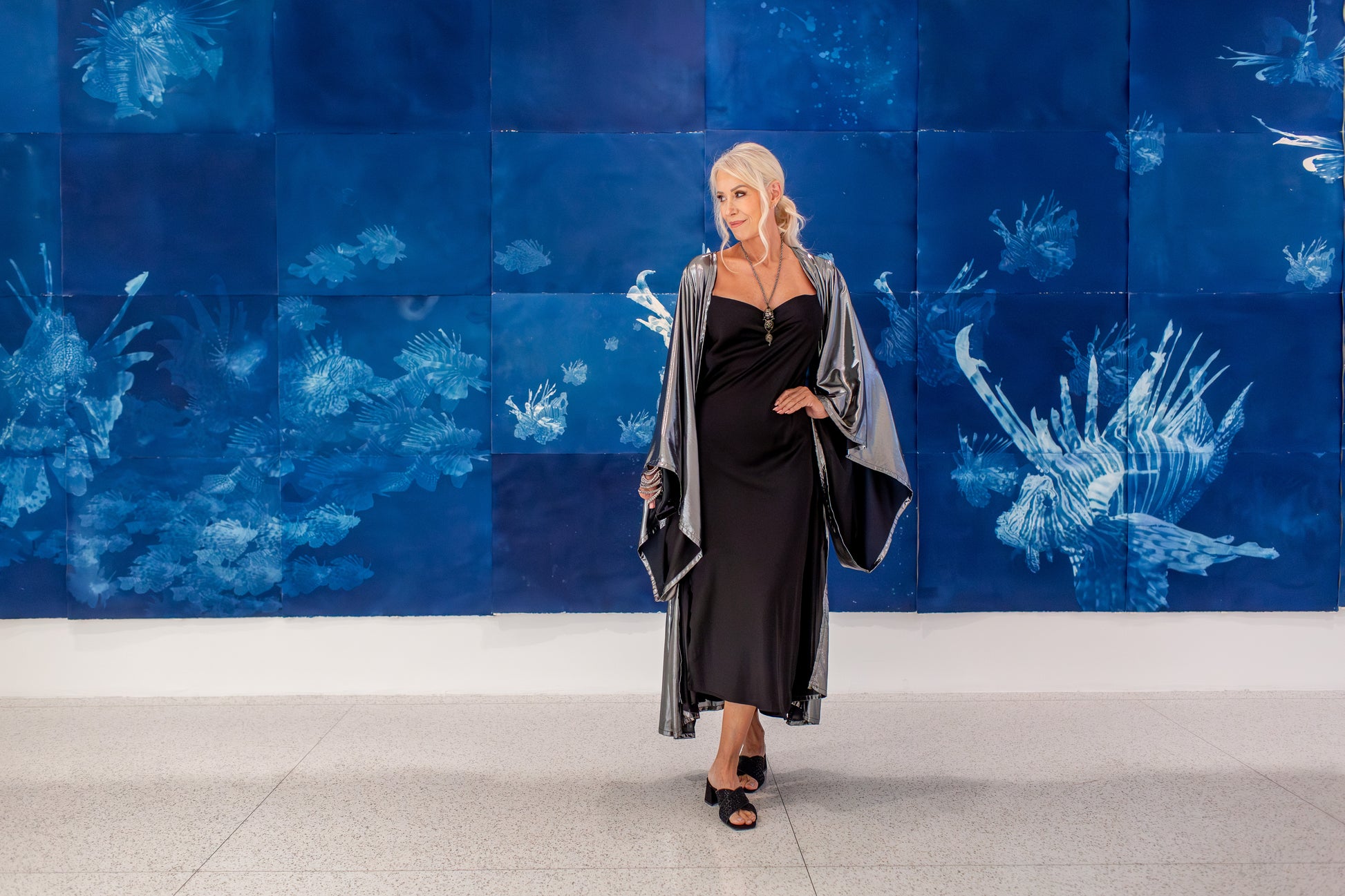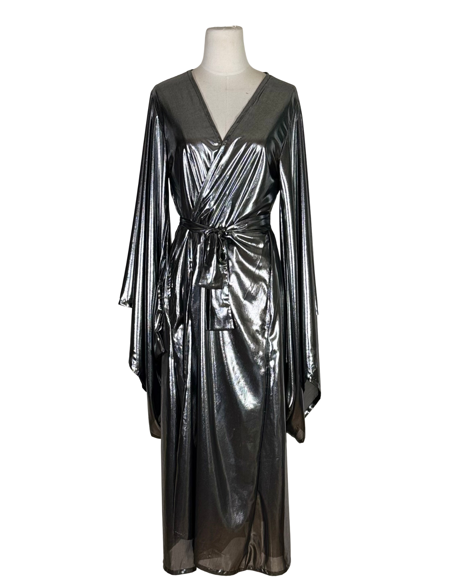 Experience elegance and versatility with the Jennafer Grace Galaxy Shine Kimono. Made from a slinky black jersey coated in a gorgeous mercurial foil. With equal parts space age diva and studio 54 icon. You can wear her as a duster, or closed at the waist with her included belt. And yes, she has pockets... Even celestial beings need a stash for their lipgloss and secrets!