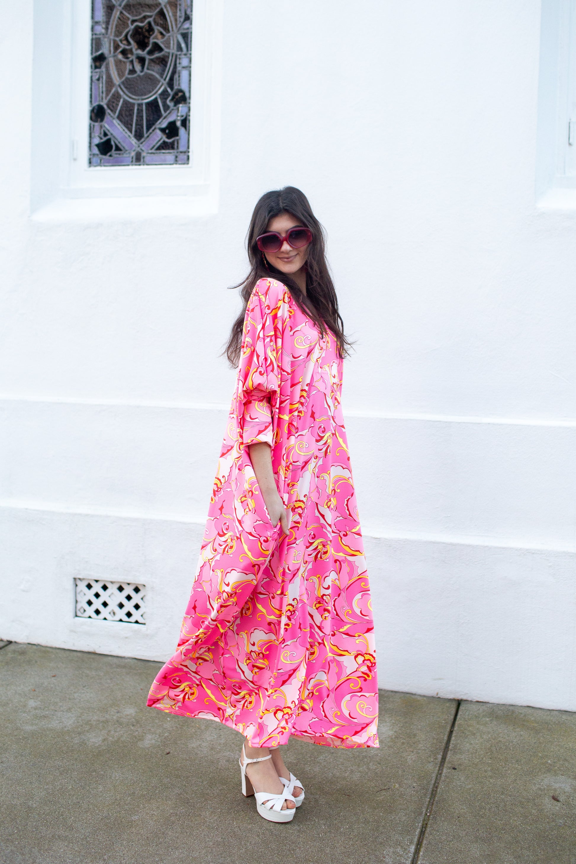 The Gracie Caftan in Pink Pop is an effortlessly chic essential. Designed with relaxed dolman sleeves for beautiful drape and movement, she offers comfort without sacrificing style. An internal waist tie allows you to play with volume and shape, tying in multiple ways to customize the fit—from loose and flowing to softly cinched. A wearable, versatile basic that transitions seamlessly from day to night.