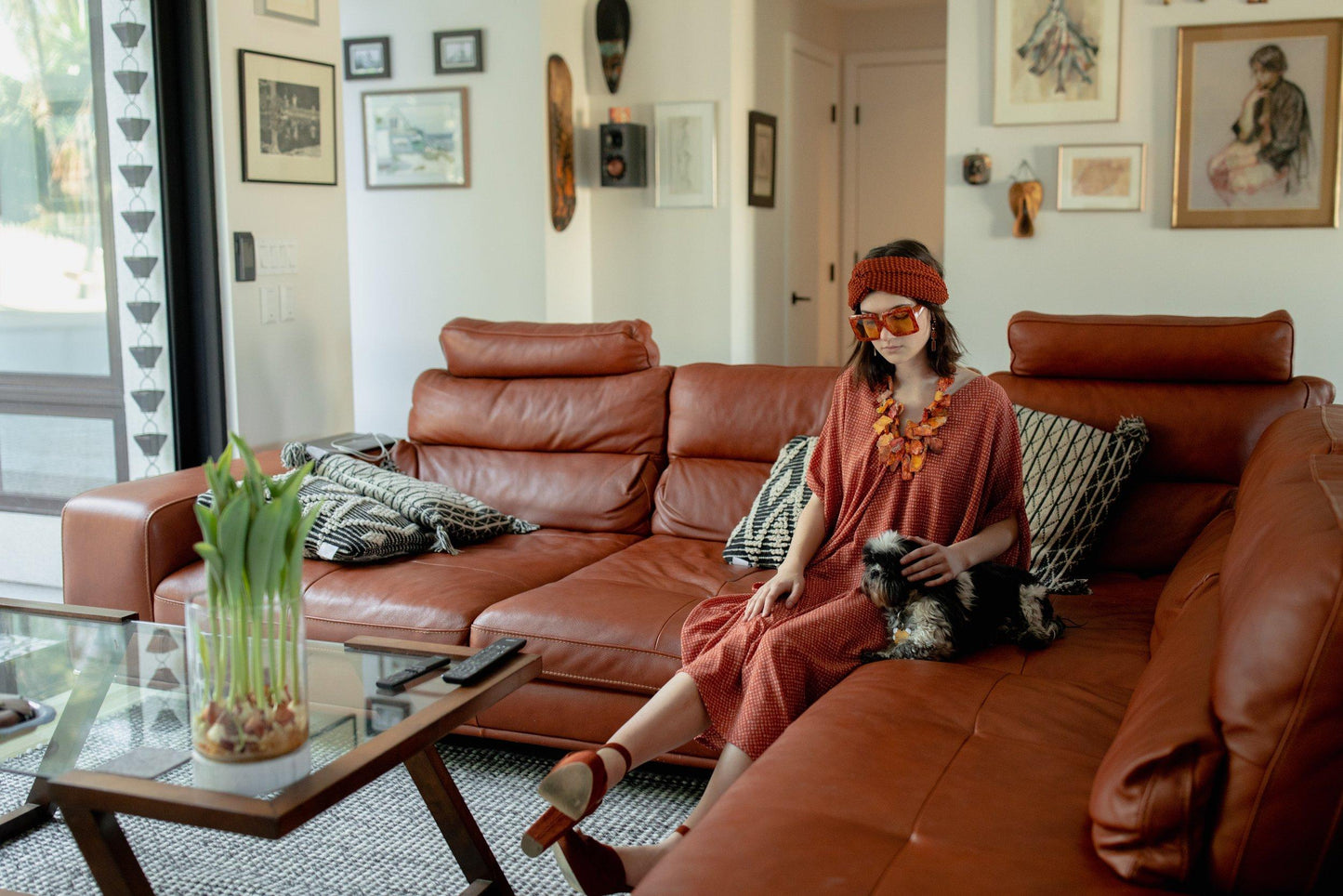 This vibrant caftan is the answer to glam layering. This exquisite garment is more than just a piece of clothing; it's a celebration of fabric in all its glory. Crafted with generous amounts of a earthy brick circle patterned opaque rayon bubble crepe georgette and lots of love, this piece offers an airy fit designed to drape beautifully on all body types. Whether worn poolside for a day at the cabana or layered and adorned with your favorite accessories for a glamorous evening affair, it's a versatile wardrobe staple that effortlessly adapts to your every mood and occasion. Bohemian splendor, handmade in California.