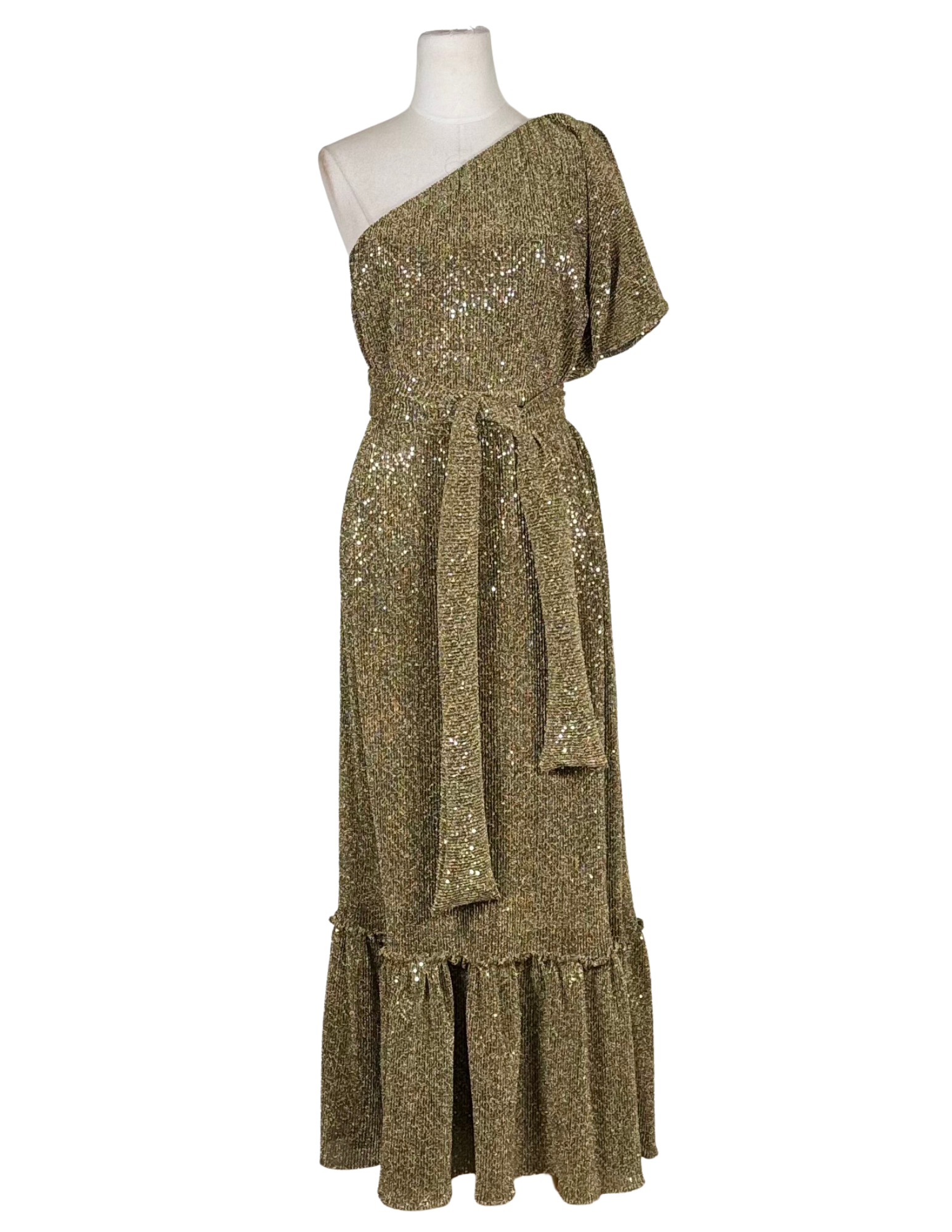 Effortlessly elegant, the Honey Diamond Pleated Maxi Dress features a flattering one shoulder design with a long Obi style belt. The pleated details and shimmering sequins add texture and movement, while the flared silhouette and ruffle hem create a feminine and sophisticated look. Perfect for any occasion, this dress is a must-have for any stylish wardrobe.