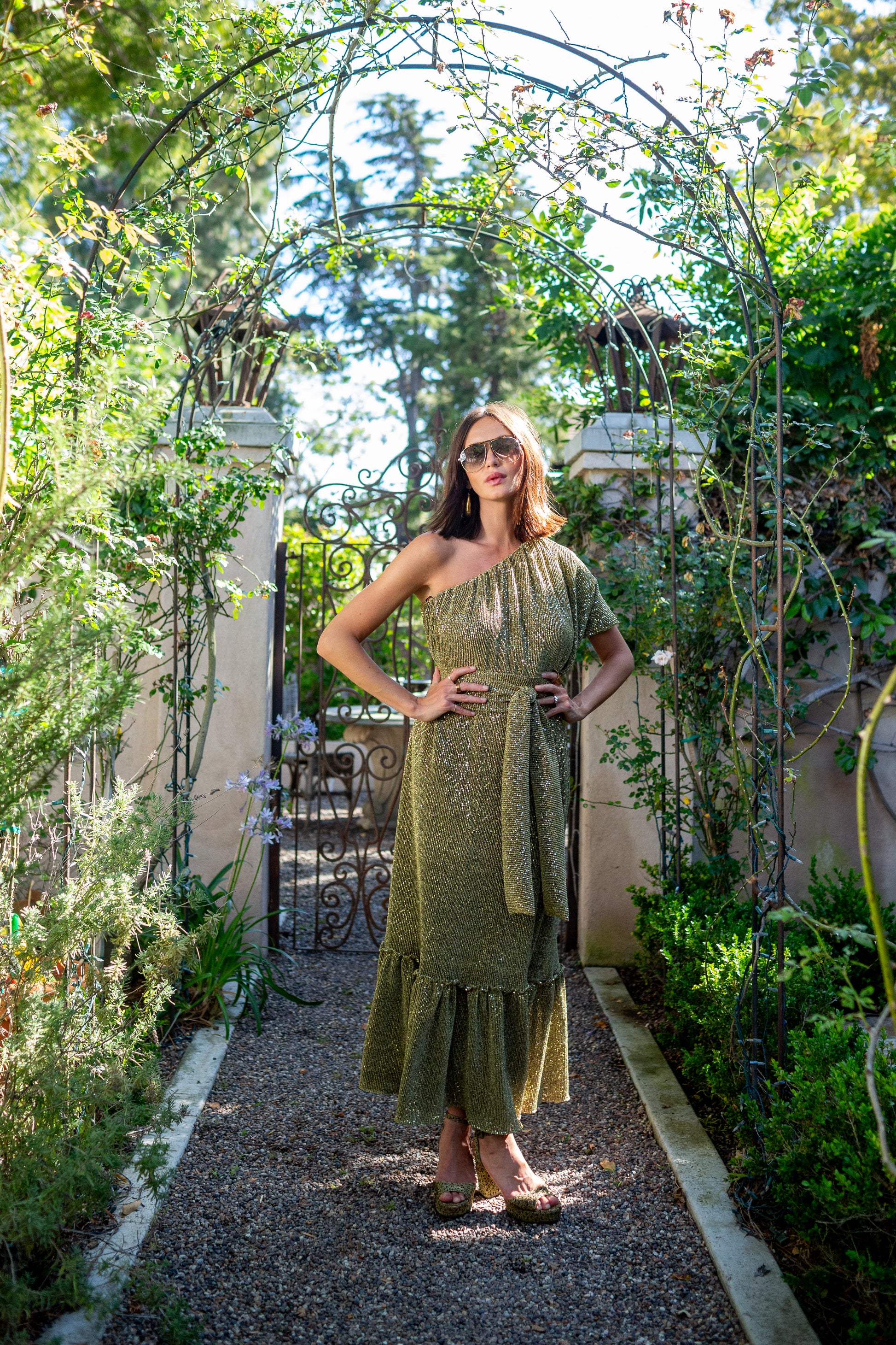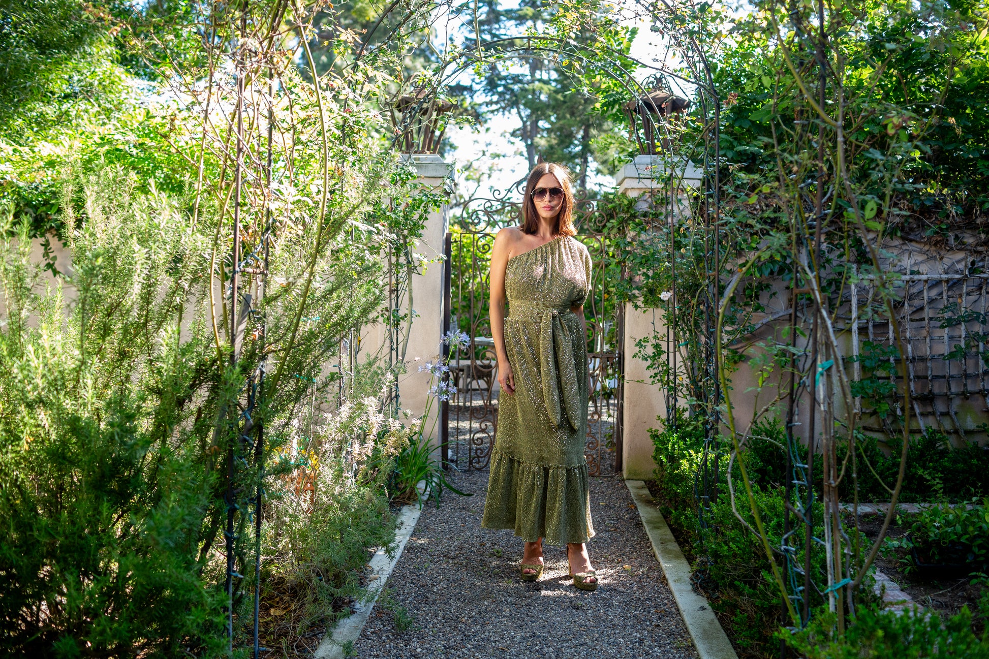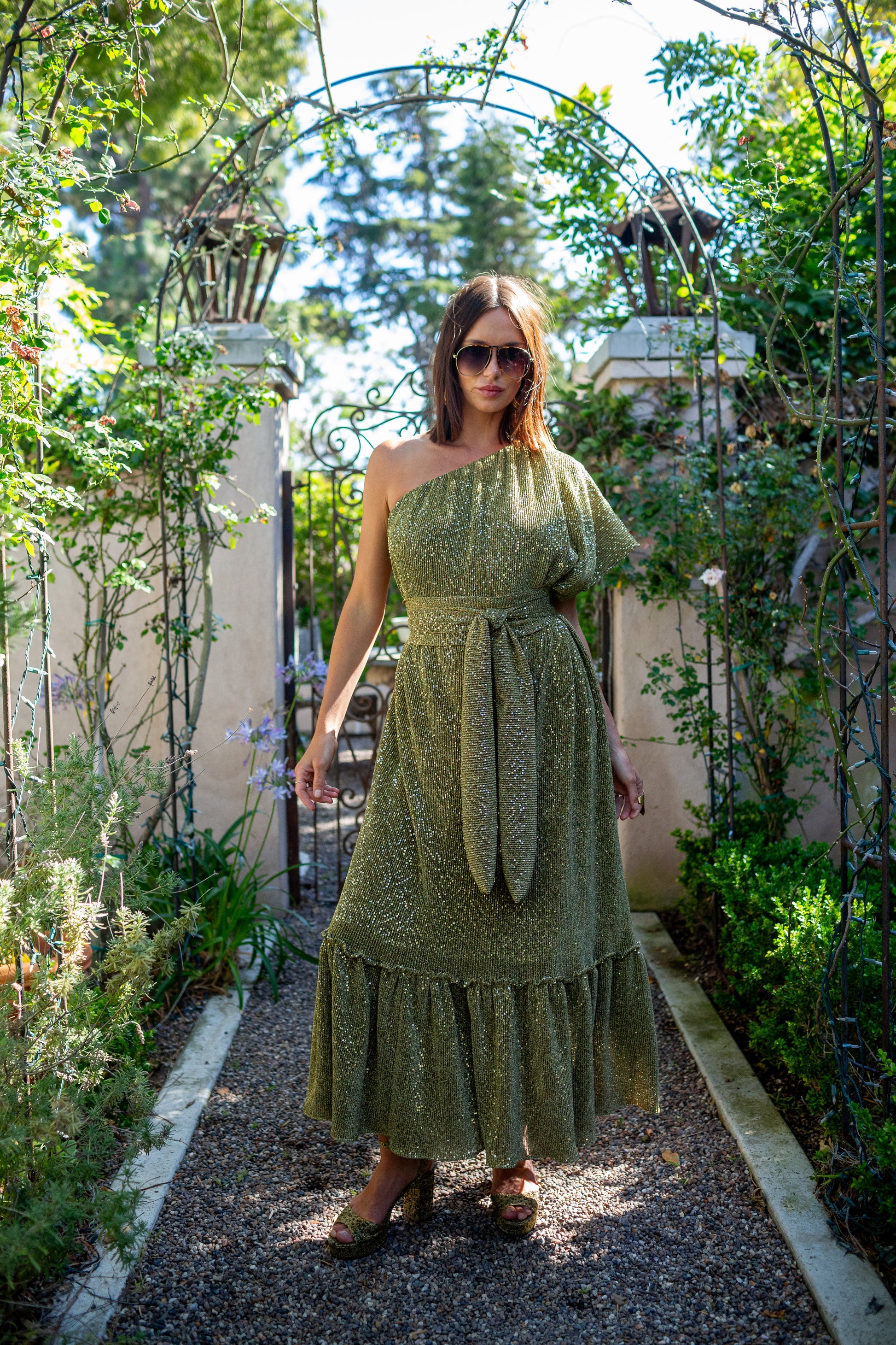 Honey Diamond Pleated One-Shoulder Maxi Dress