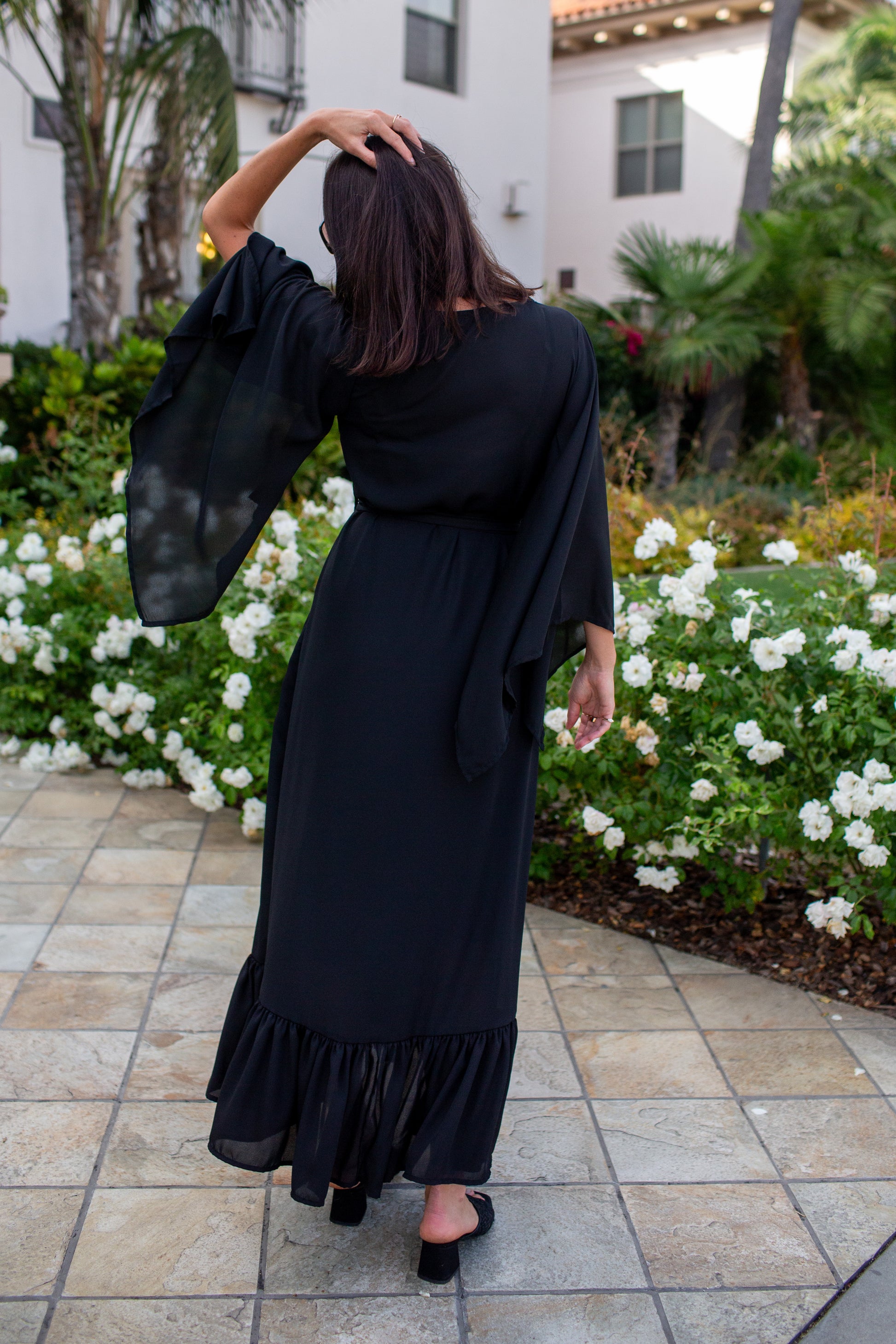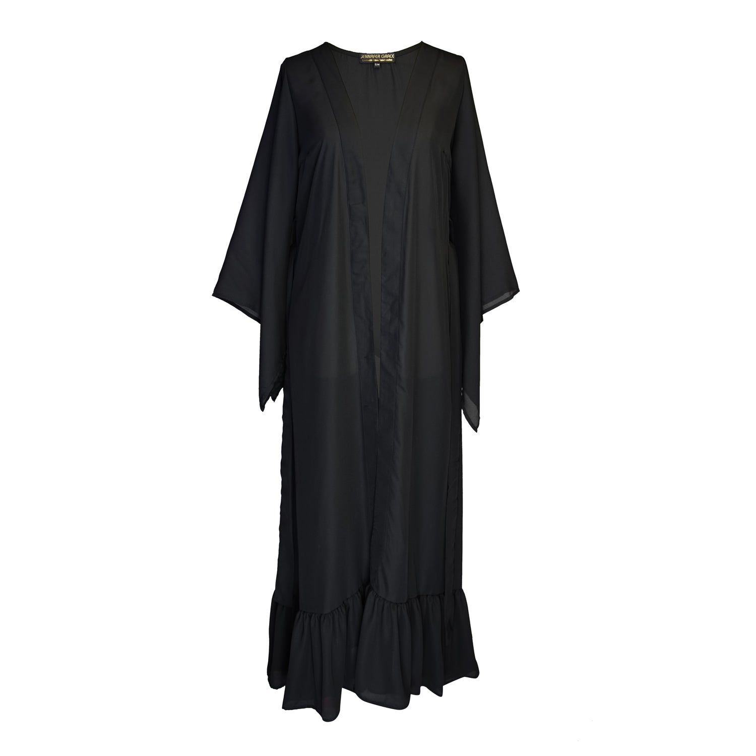 This Janys Scarf Sleeve Kimono in Raven features a floaty wrap dress silhouette with open scarf sleeves and a delicate ruffle hem, combining elegance with comfort. Designed with practical pockets, a waist tie held tight with belt loops, it offers a customizable fit. The raven black crepe fabric adds a natural touch, making it a versatile piece for warm-weather layering or standalone wear. Perfect for those seeking effortless style with expert craftsmanship.