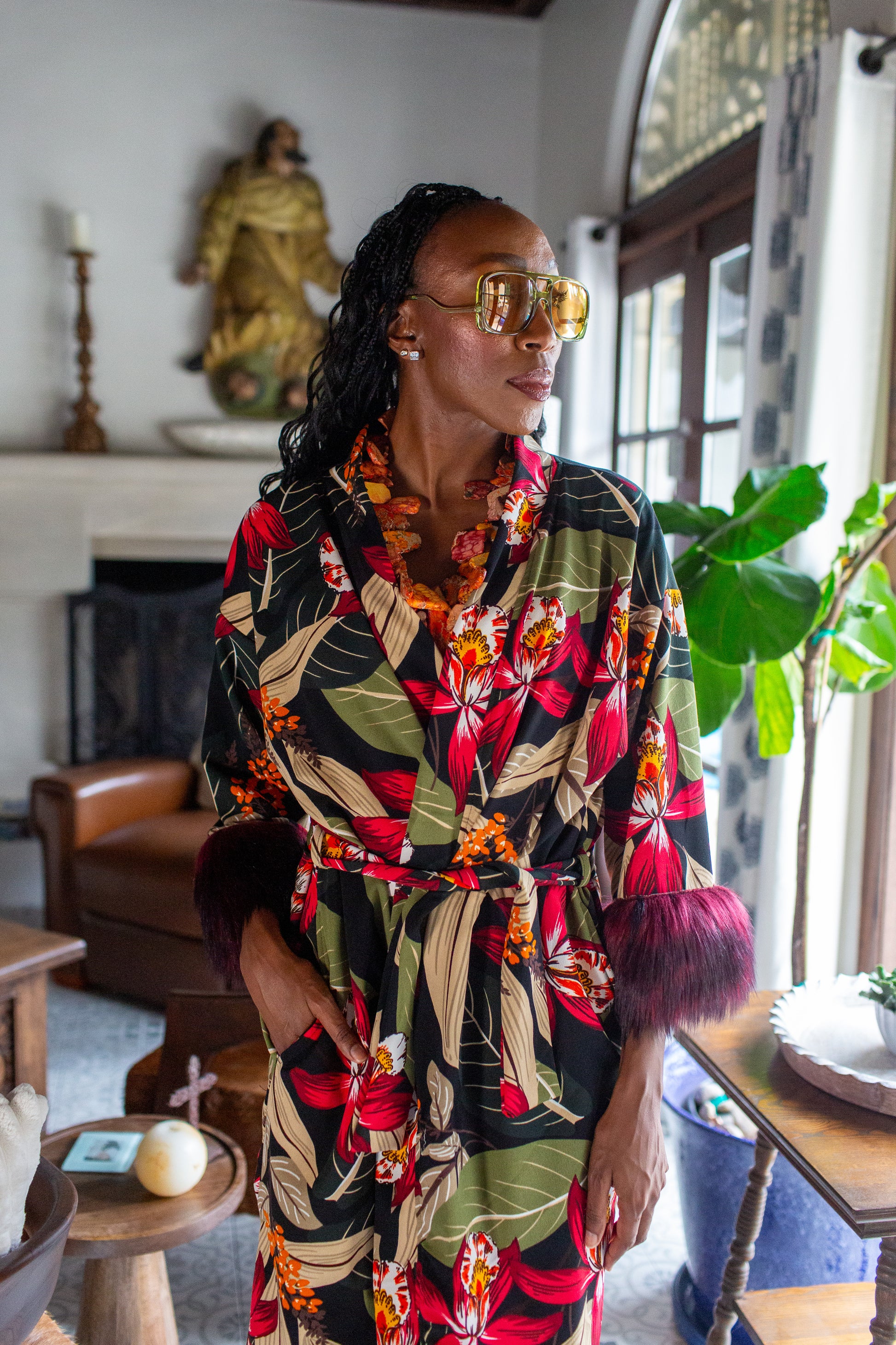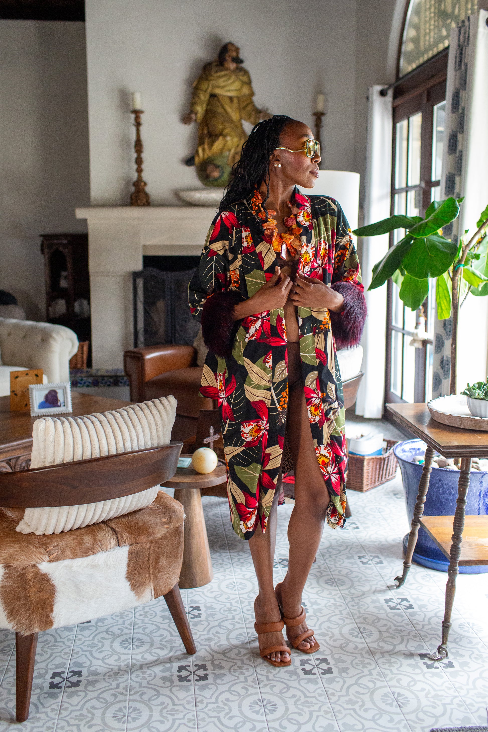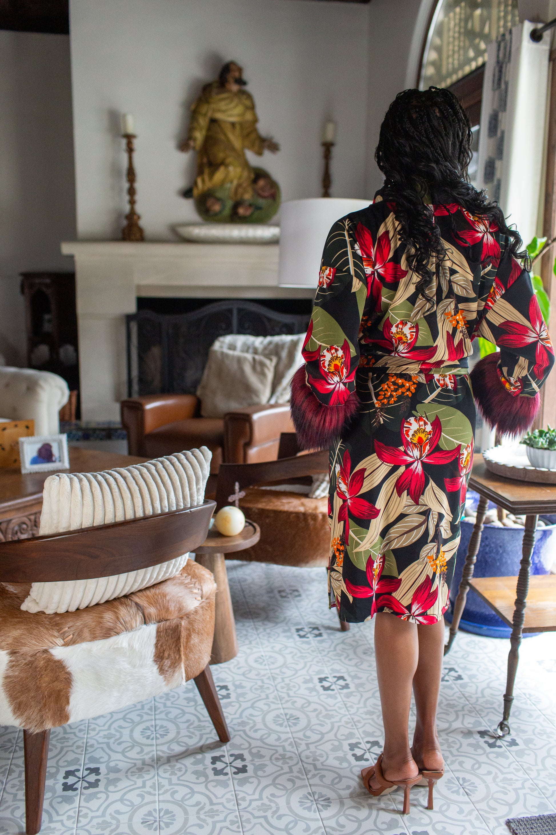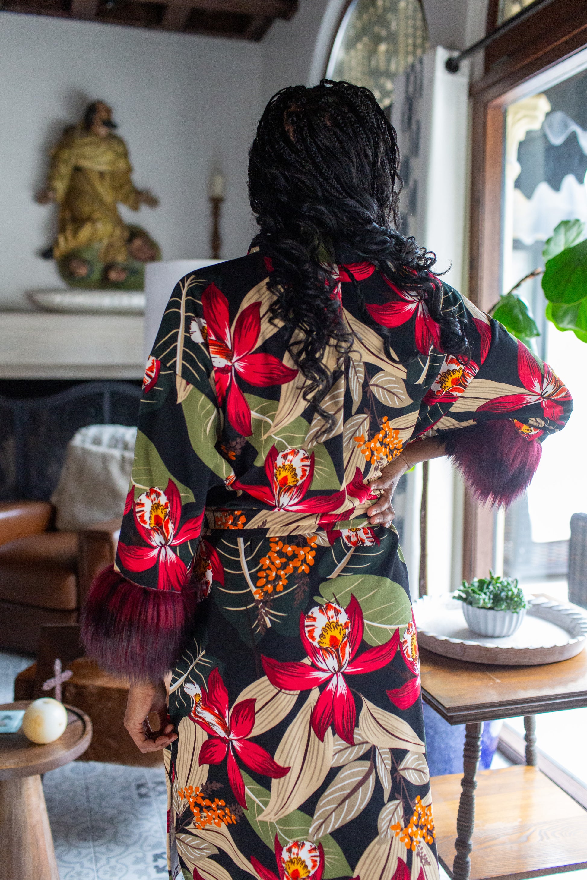 Expertly crafted, this Jardin Nuit Faux Fur Koi Kimono combines luxury and funk with its pop print and unique combination of red flowers, palm fronds, and leopard lining. Make a bold statement with this one-of-a-kind piece that will elevate any outfit with its eye-catching design.