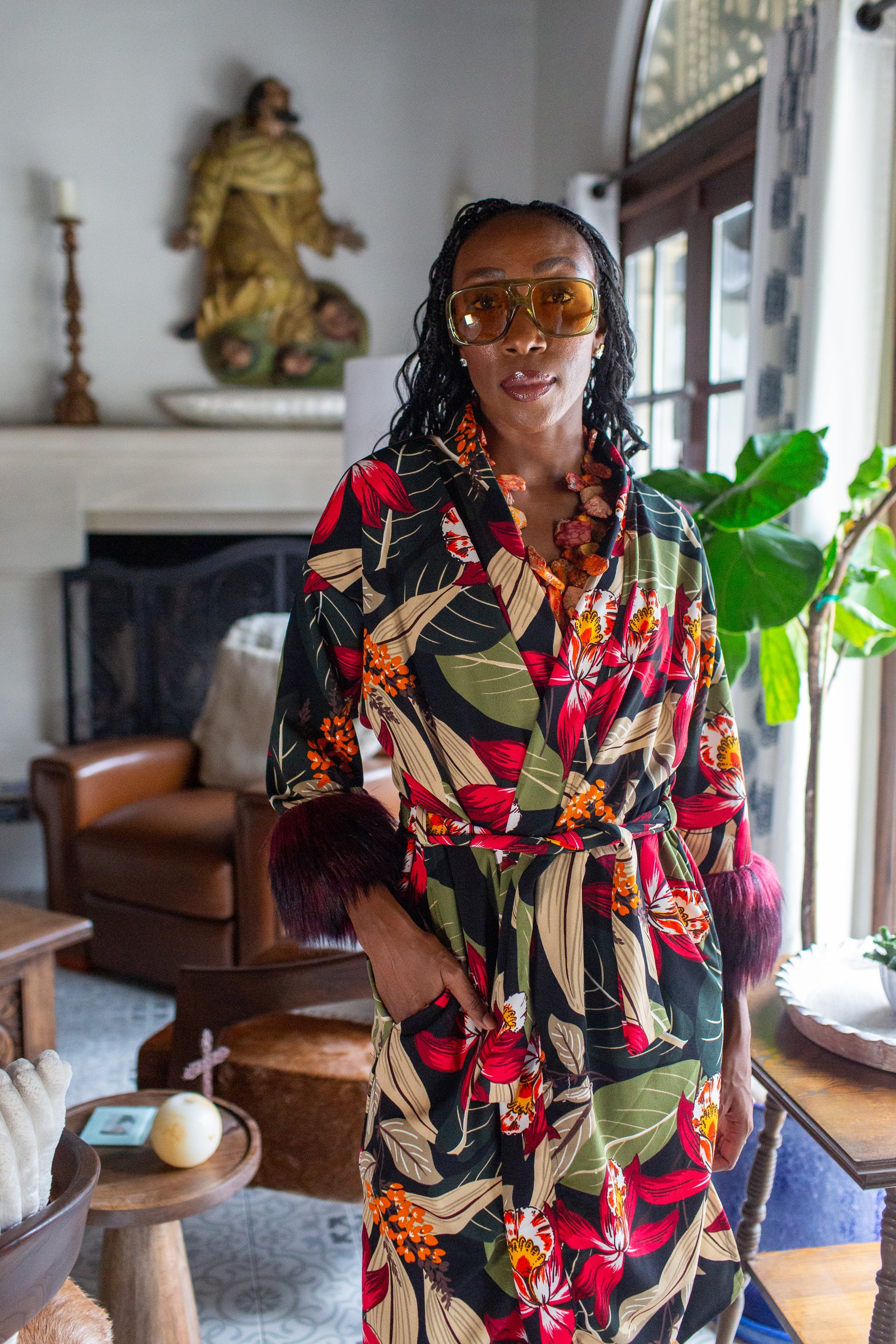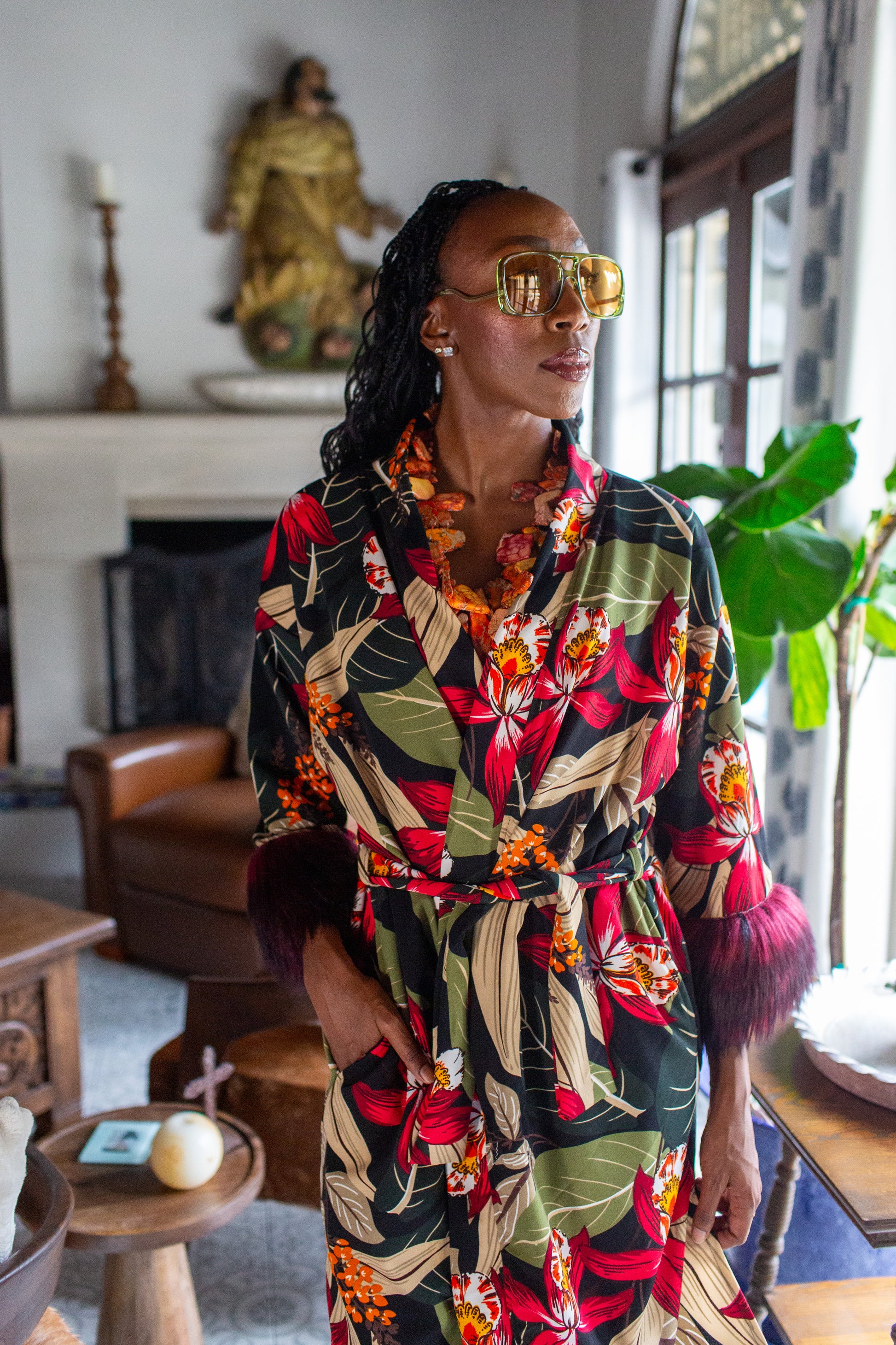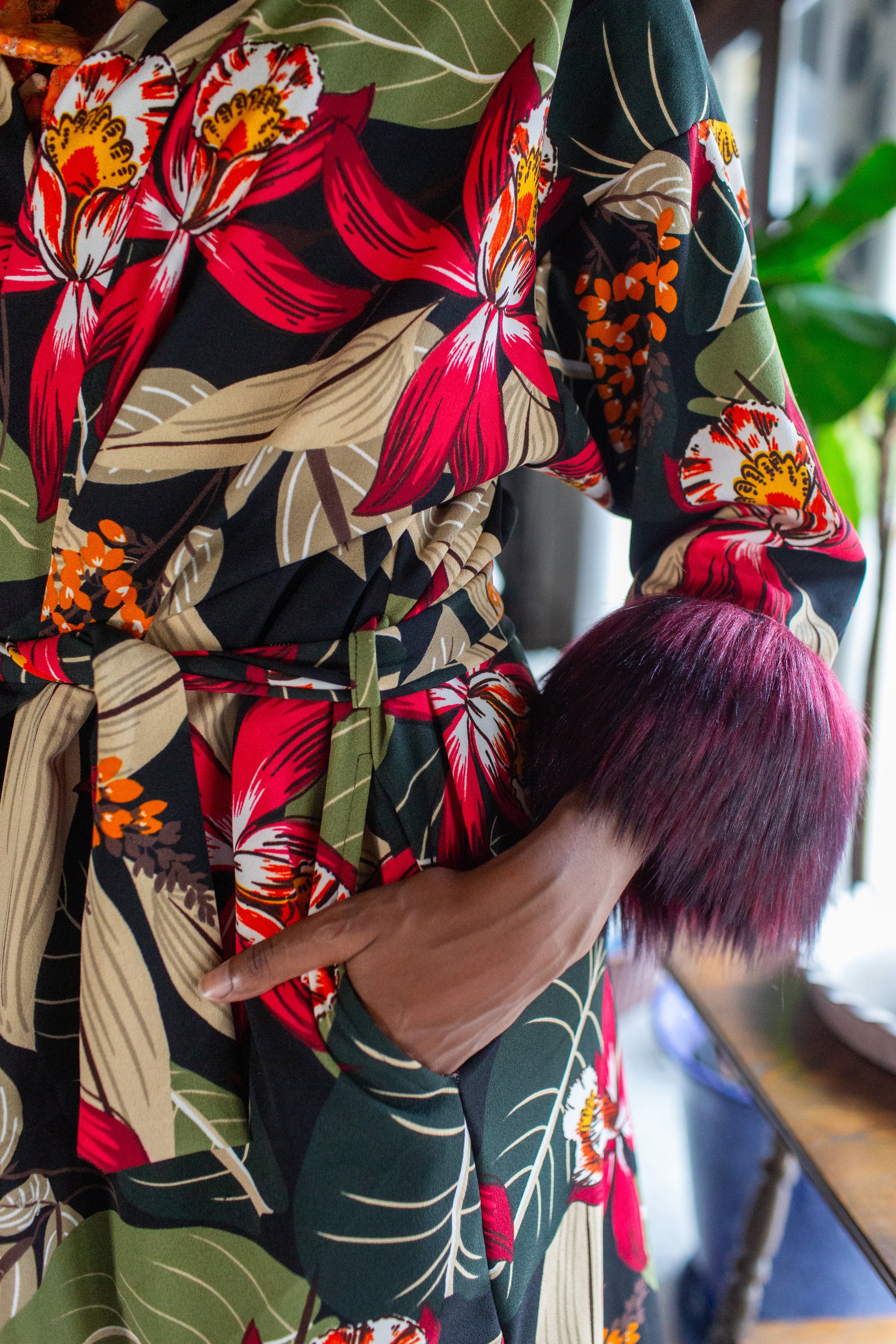 Expertly crafted, this Jardin Nuit Faux Fur Koi Kimono combines luxury and funk with its pop print and unique combination of red flowers, palm fronds, and leopard lining. Make a bold statement with this one-of-a-kind piece that will elevate any outfit with its eye-catching design.