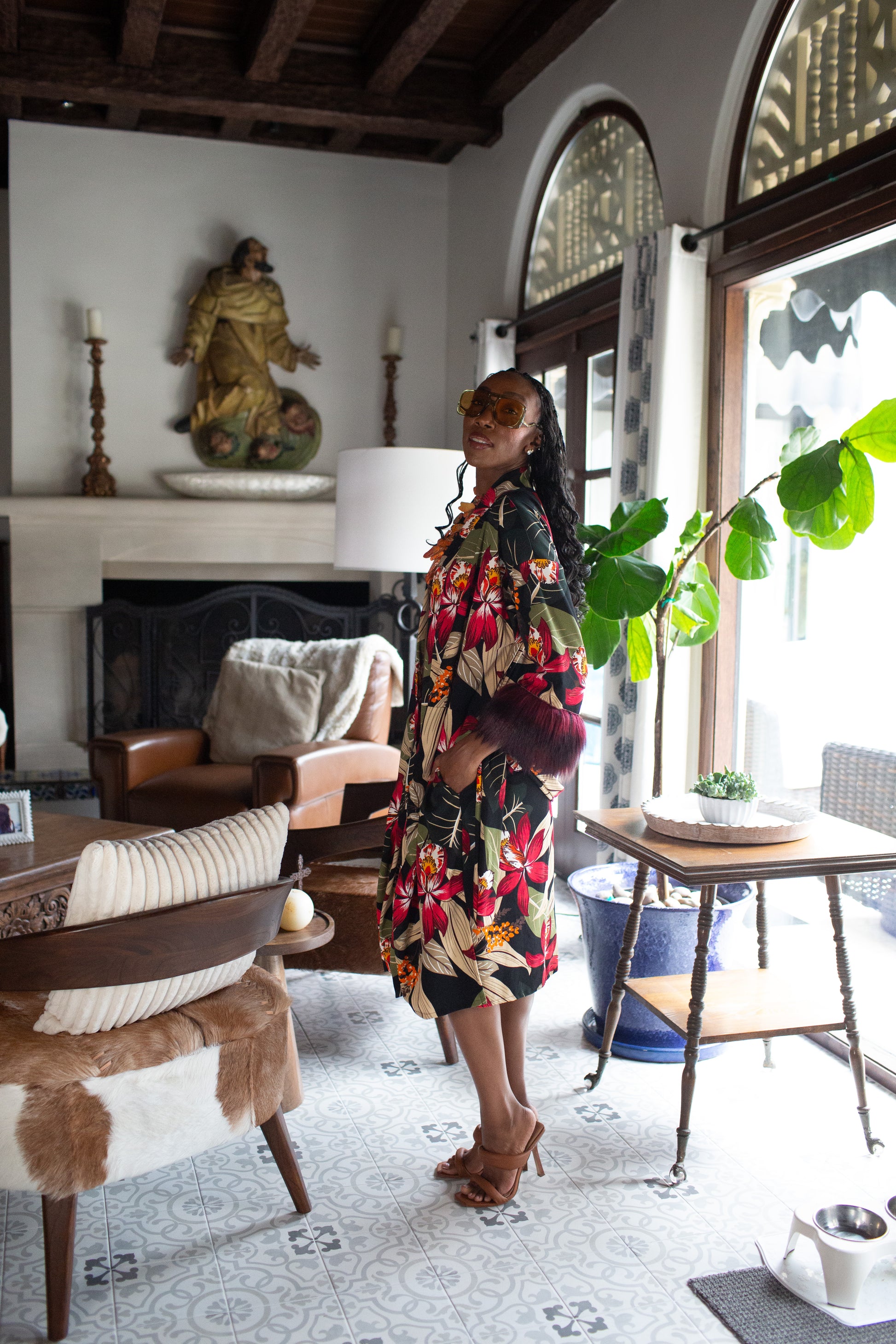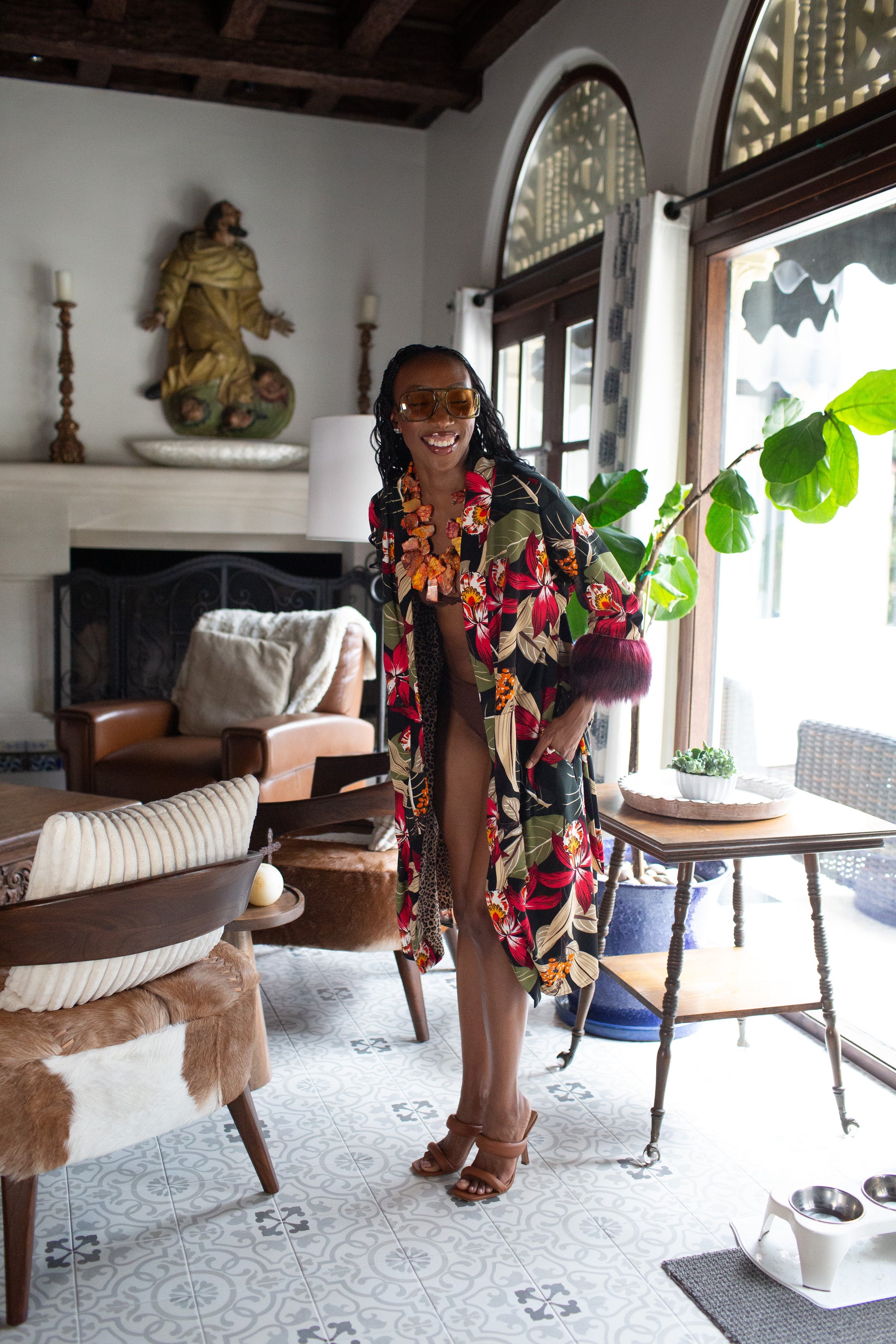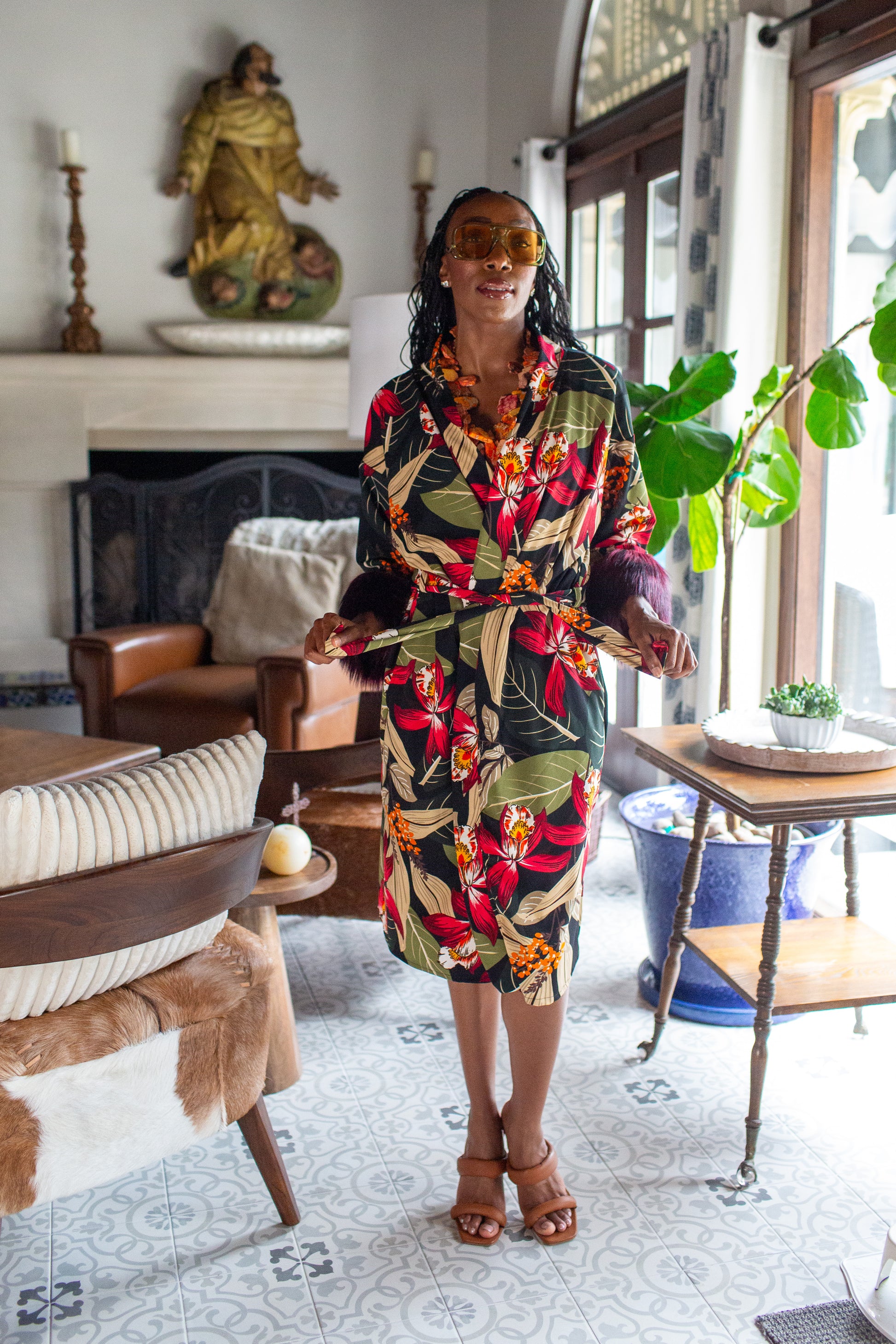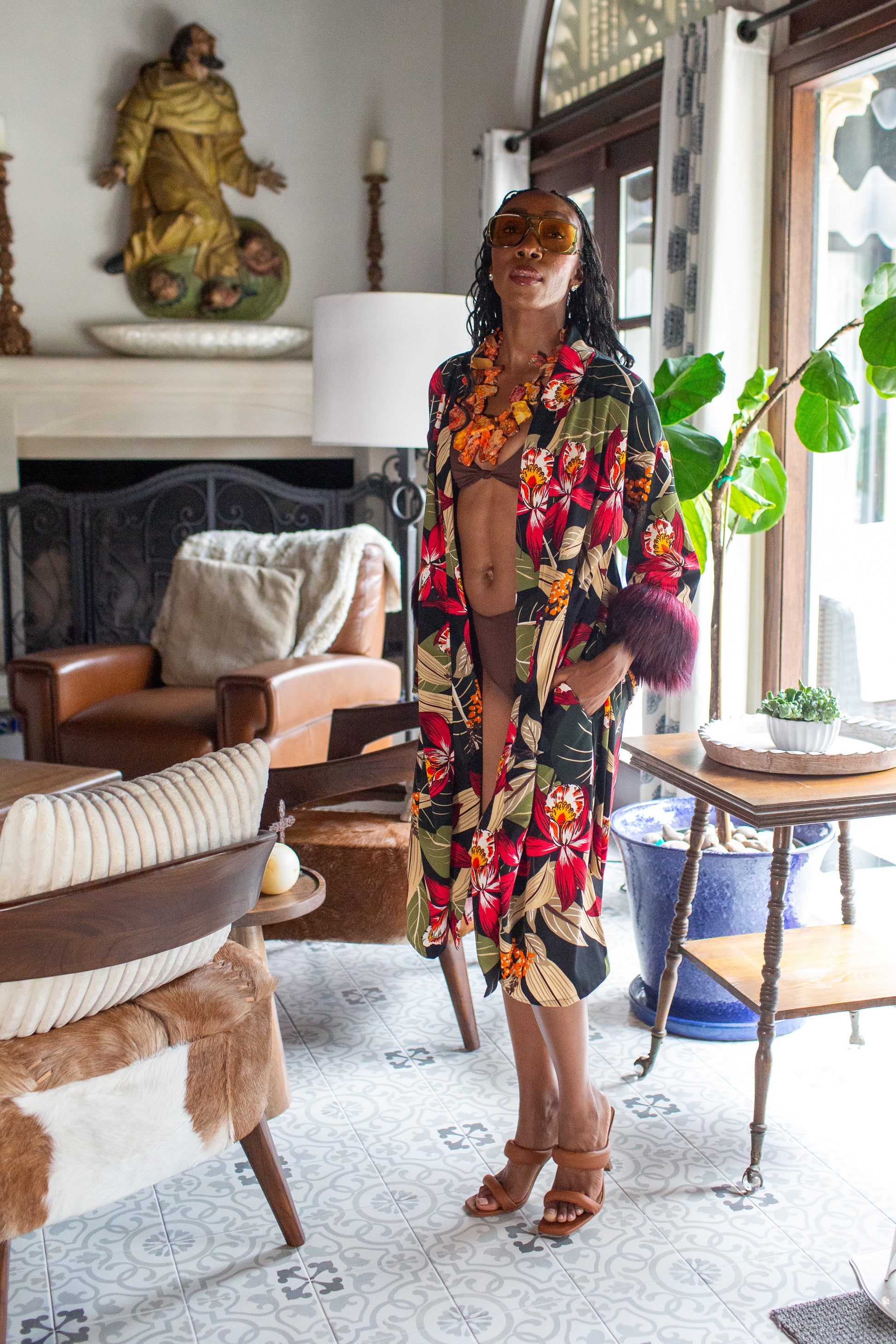 Expertly crafted, this Jardin Nuit Faux Fur Koi Kimono combines luxury and funk with its pop print and unique combination of red flowers, palm fronds, and leopard lining. Make a bold statement with this one-of-a-kind piece that will elevate any outfit with its eye-catching design.