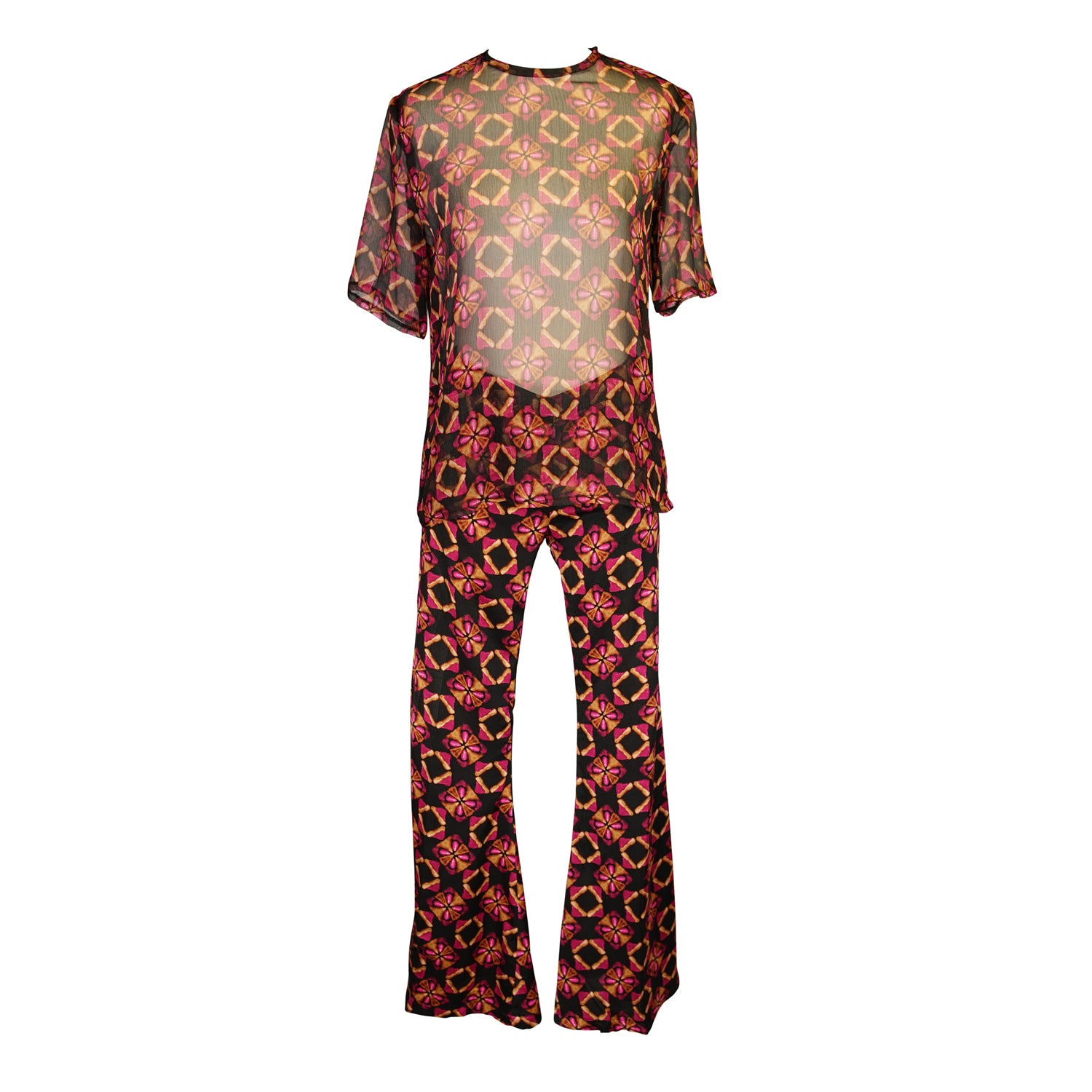 The Mareesa Top floats like a cocktail-fueled dream, cut from an airy chiffon in our tiki inspired Pele Lounge print. A relaxed t-shirt silhouette and sheer sultry drape meet a delicate button closure at the back, for a polished finish. Whether layered over a bikini or tucked into our matching Mareesa Trousers, she is pure glam with a 70's soul.