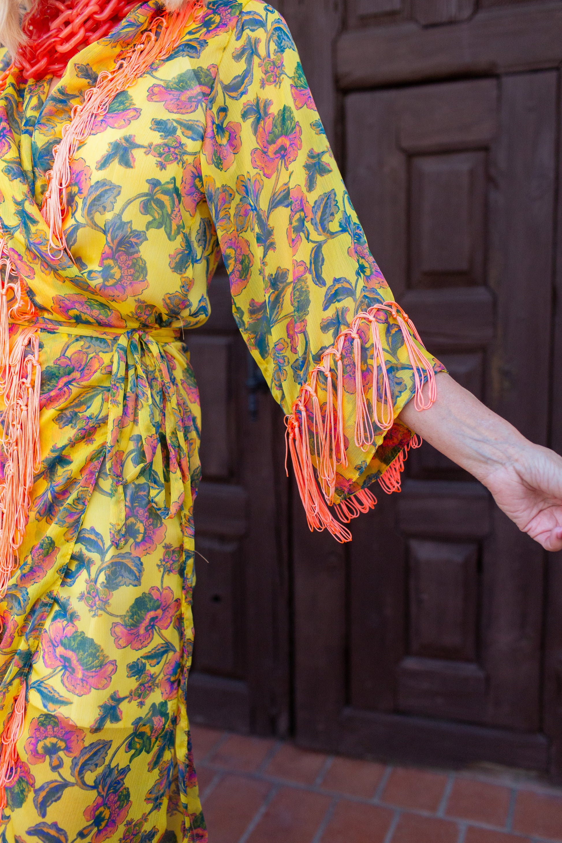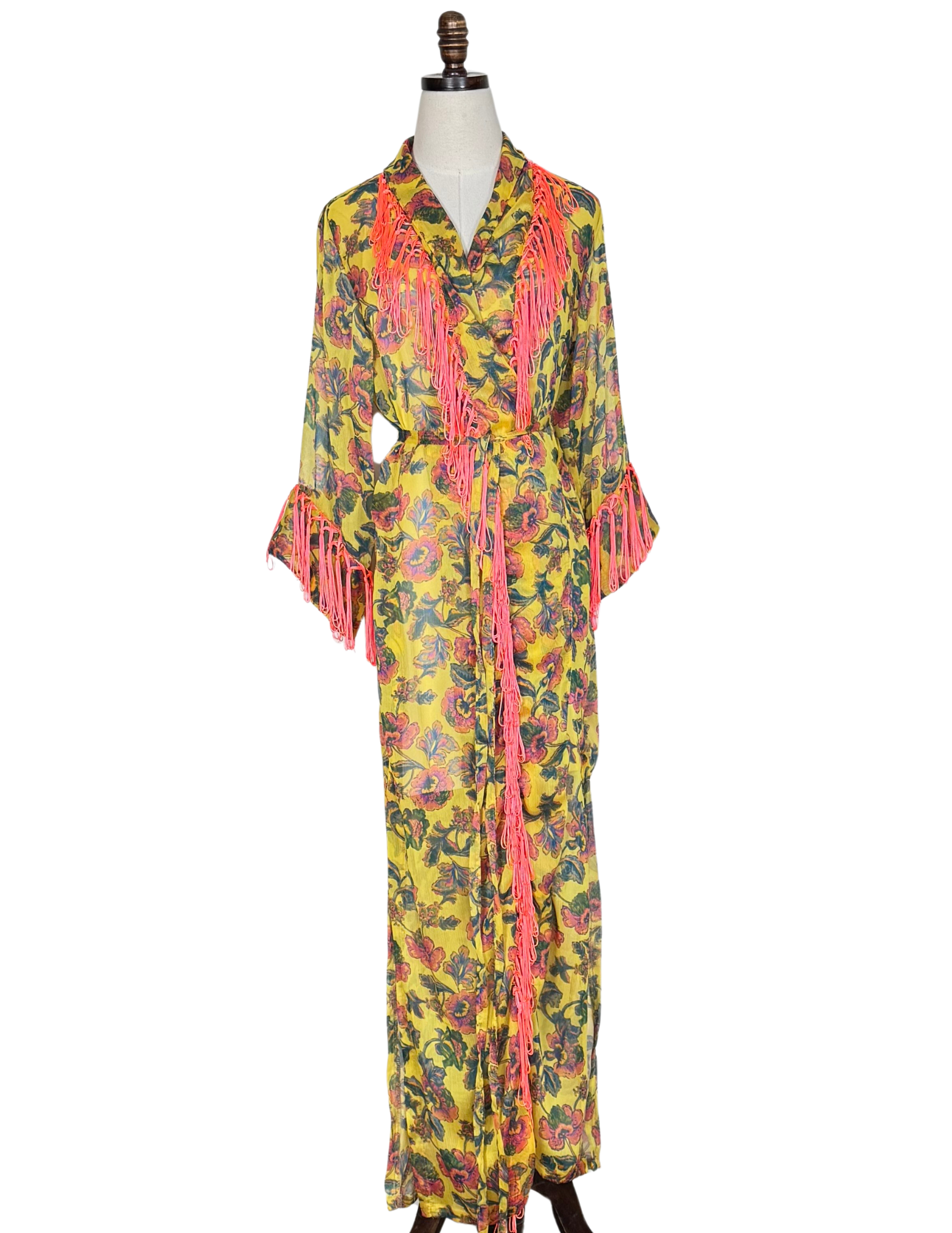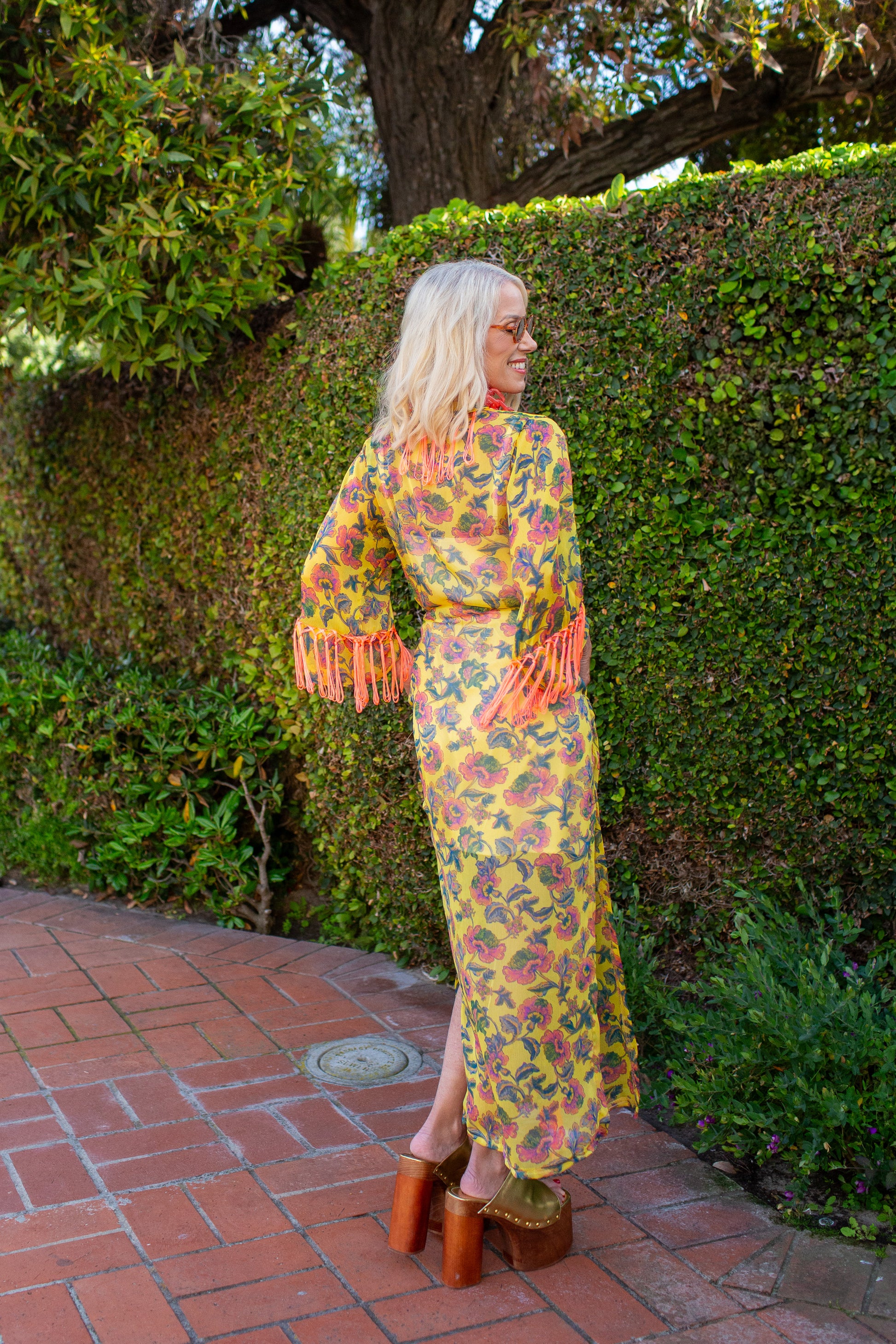 Introducing the Marlene Wrap Dress in Costa Del Sol. This floor length sheer and sunny yellow wrap dress offers a modern take on kimono sleeves and features side splits at the calves. With pockets for convenience and a shockingly fun citrus fringe detail at the cuff, this rayon chiffon dress showcases a vibrant and poppy orange floral print. Elevate your style with this slinky and sophisticated dress, now available.