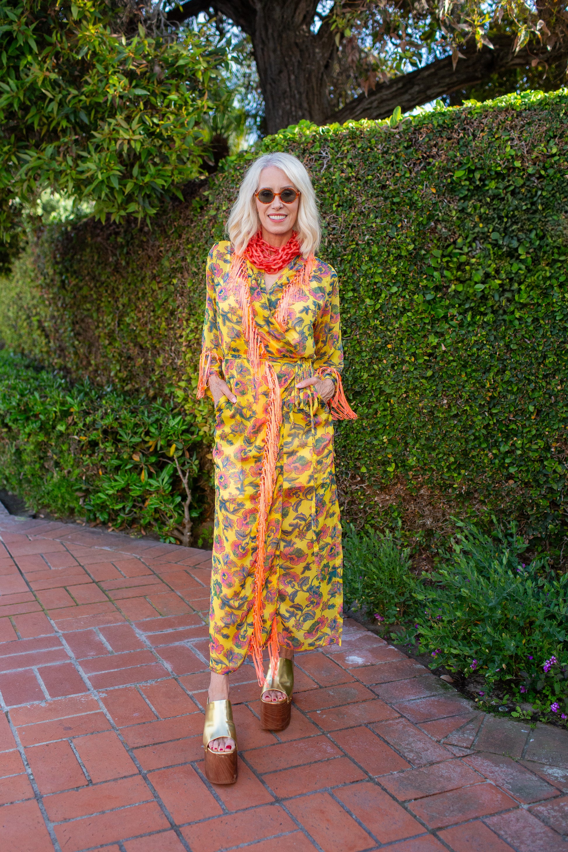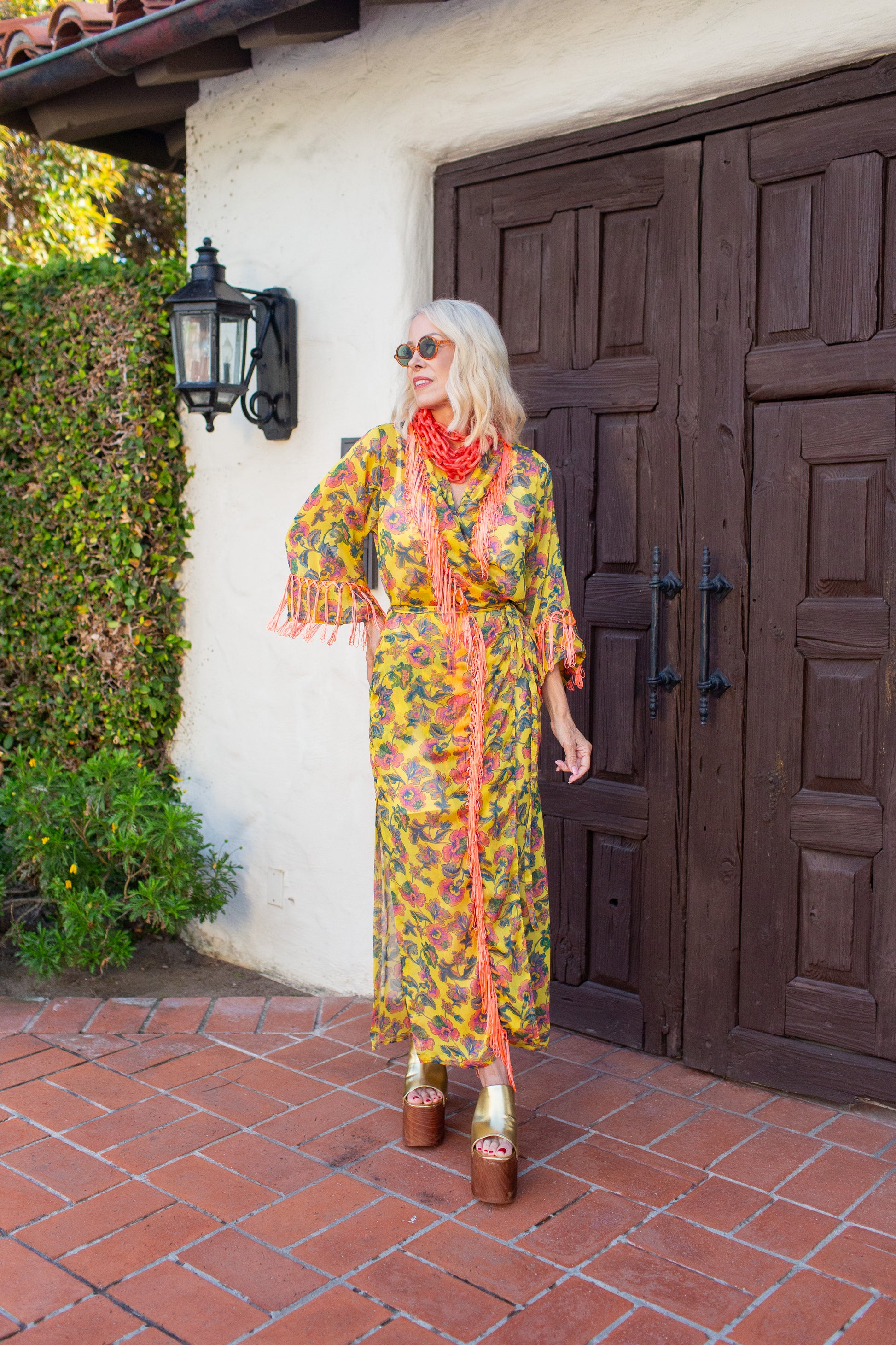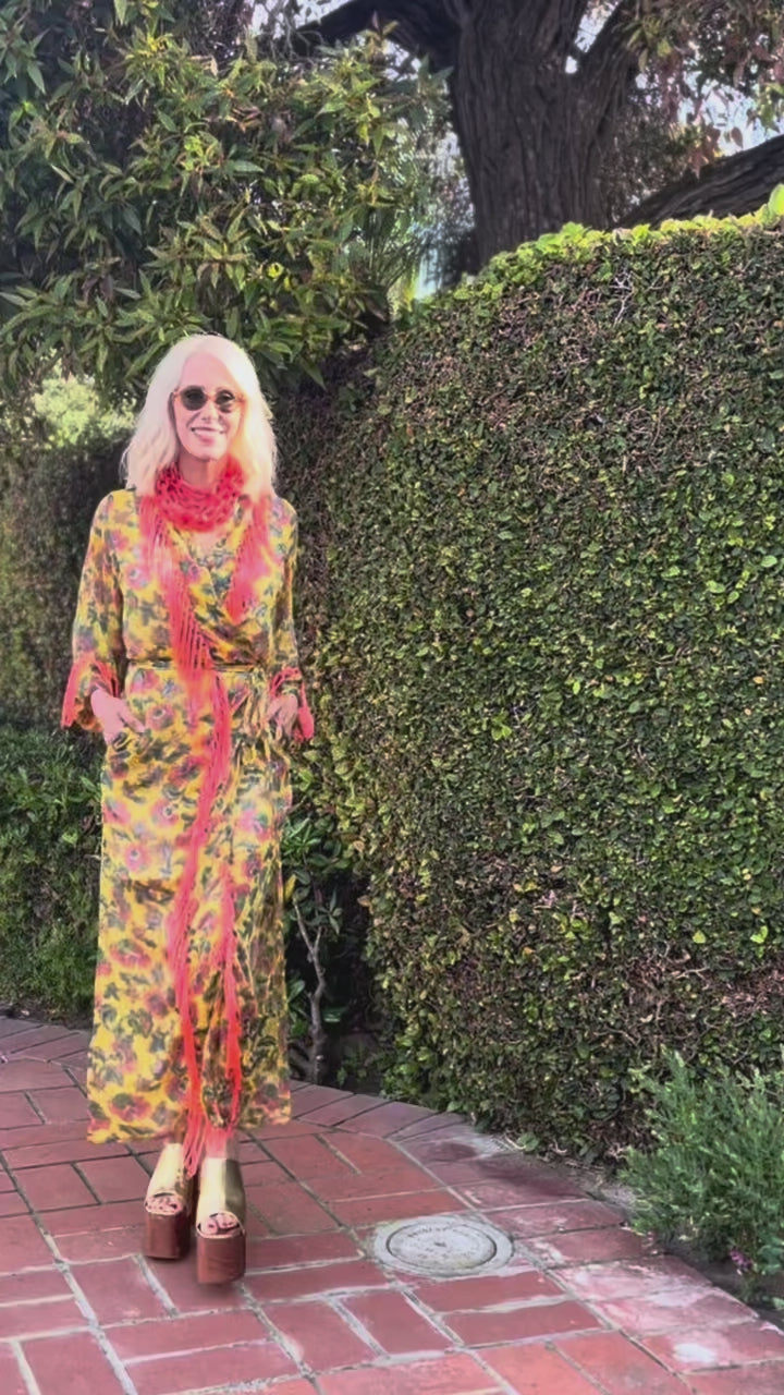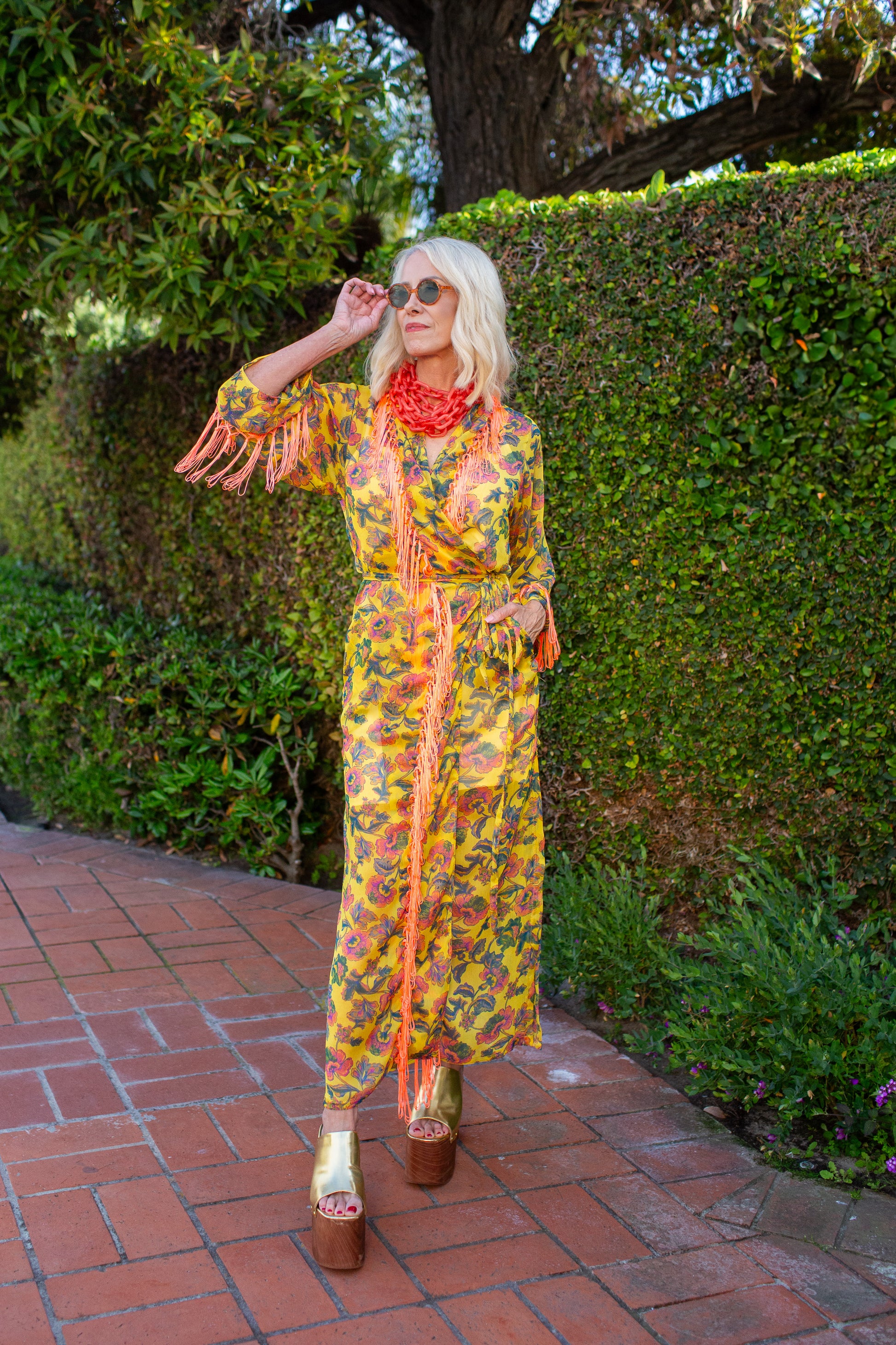 Introducing the Marlene Wrap Dress in Costa Del Sol. This floor length sheer and sunny yellow wrap dress offers a modern take on kimono sleeves and features side splits at the calves. With pockets for convenience and a shockingly fun citrus fringe detail at the cuff, this rayon chiffon dress showcases a vibrant and poppy orange floral print. Elevate your style with this slinky and sophisticated dress, now available.