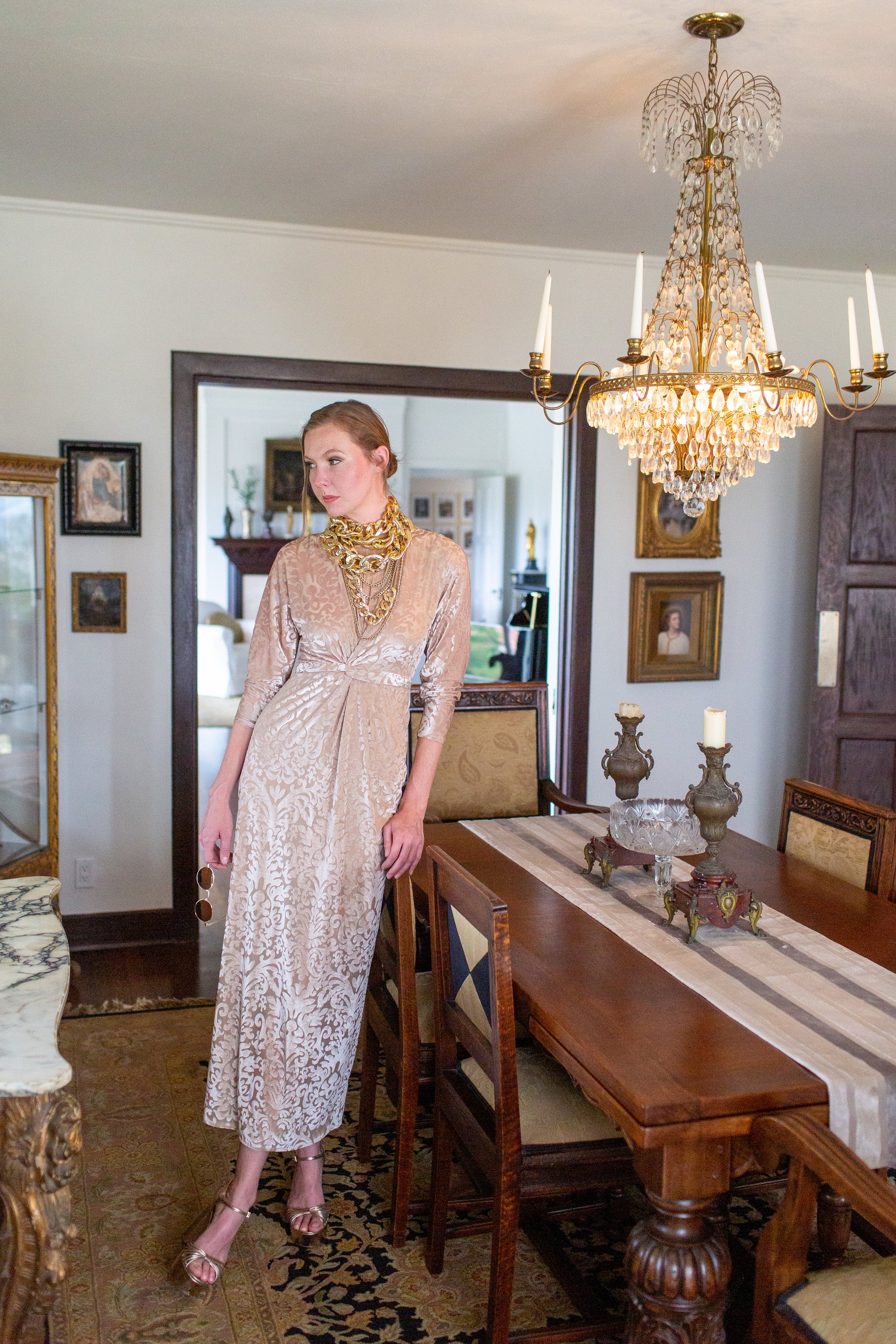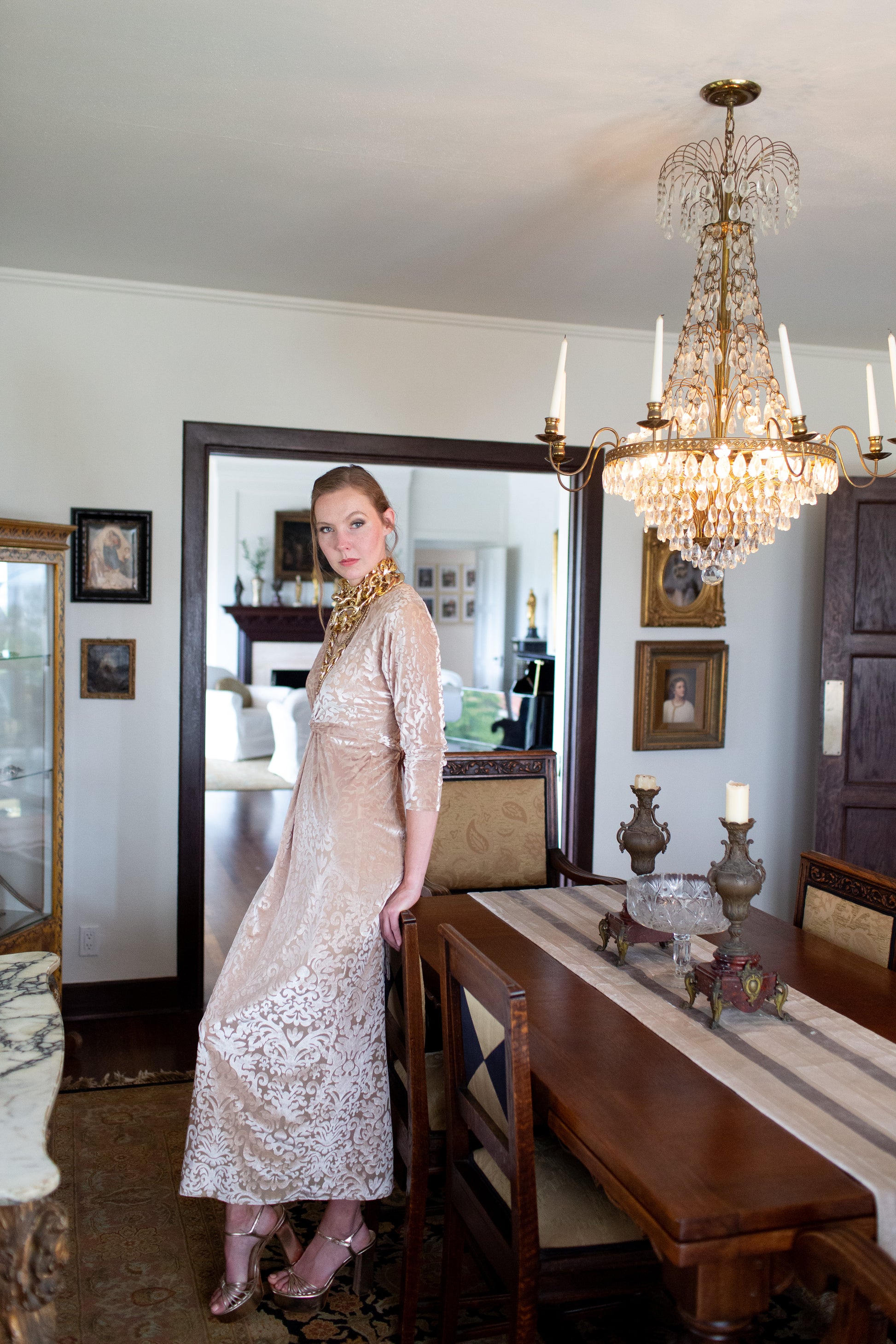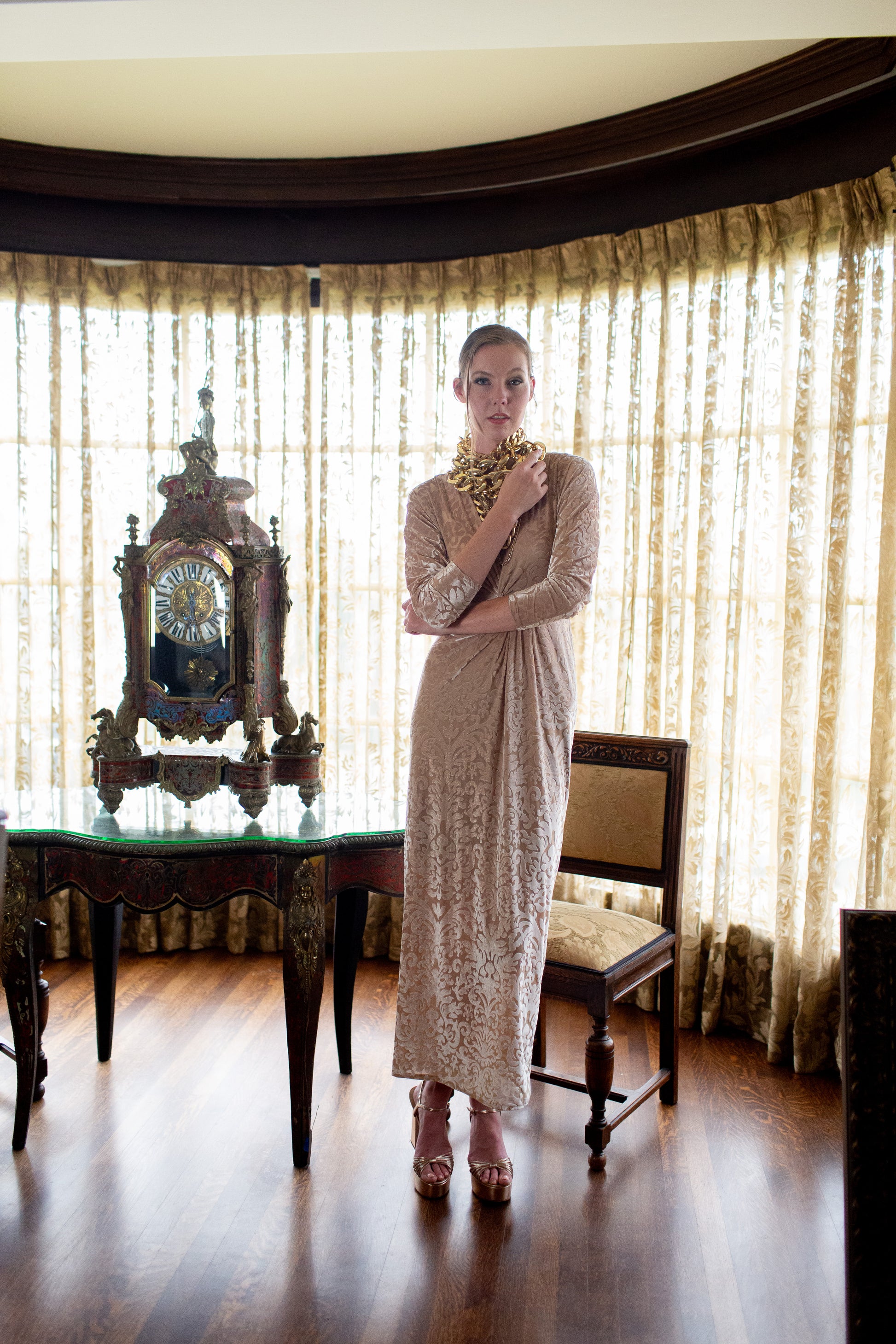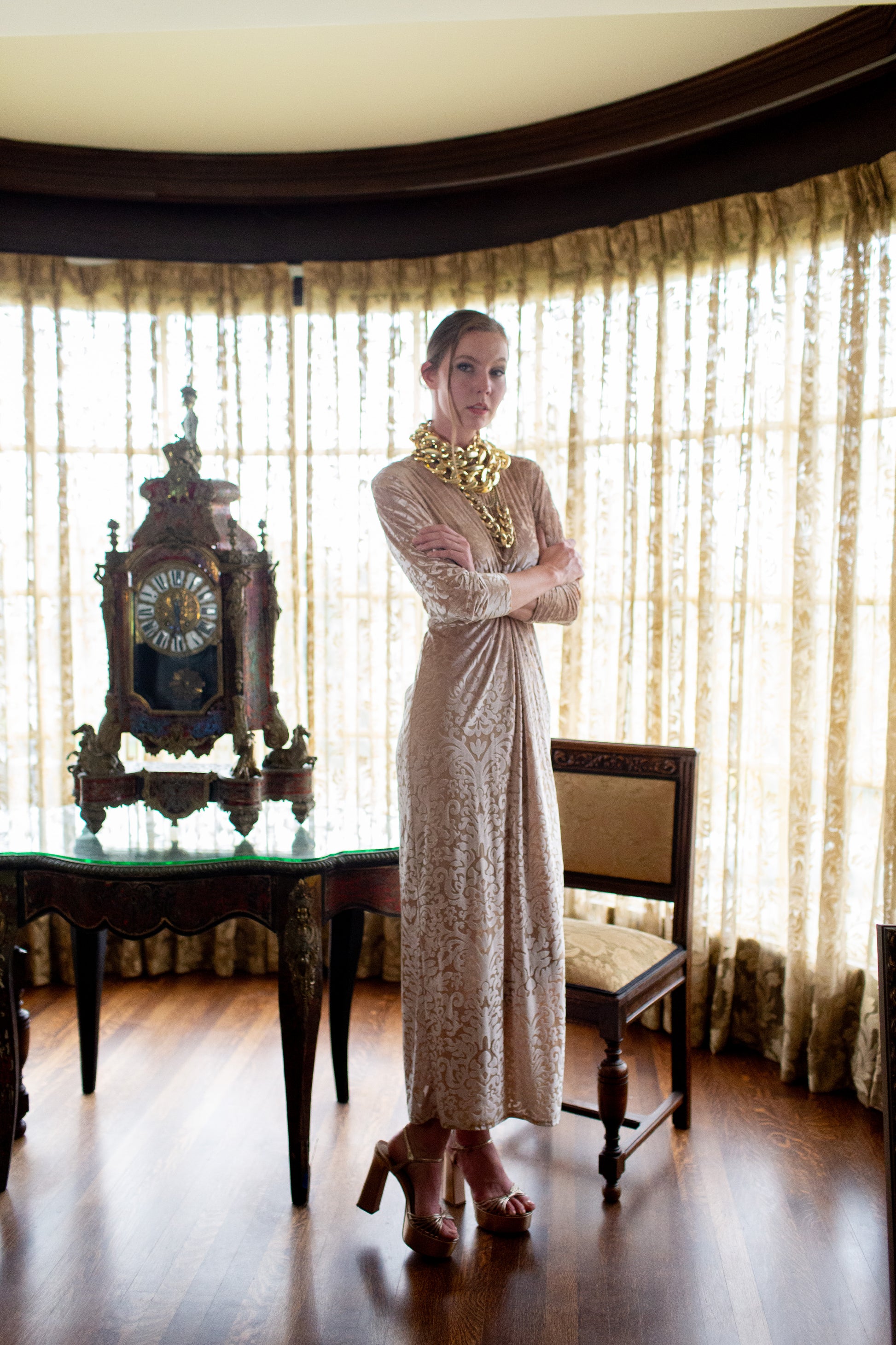 This Old-Hollywood inspired batwing dress is as glamourous as it is comfortable. This dress was made from a baroque velvet burnout and lots of love. Featuring a versatile extra long waist tie and luscious, eye catching twist style at front. Invisible zipper and slit at back for optimal comfort.