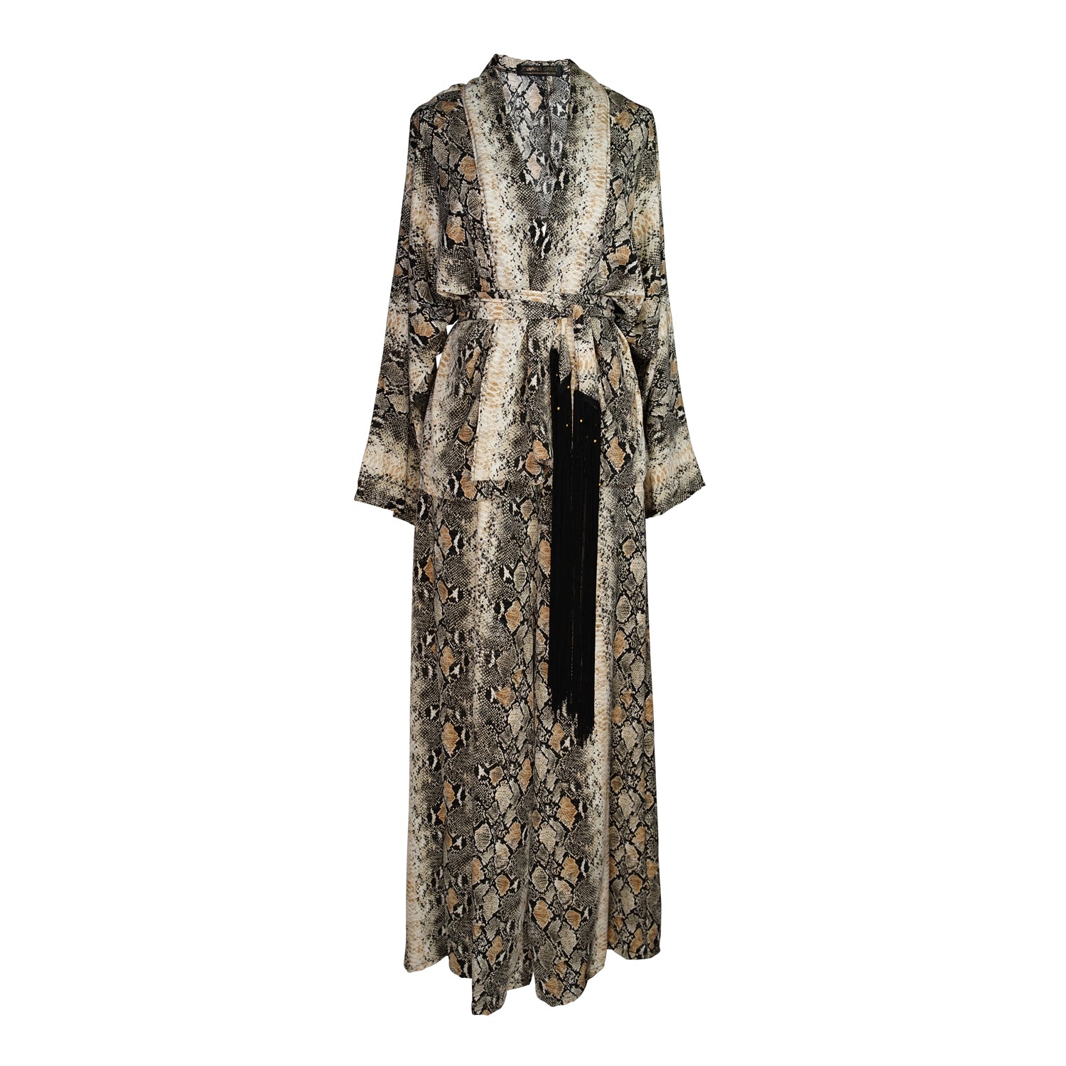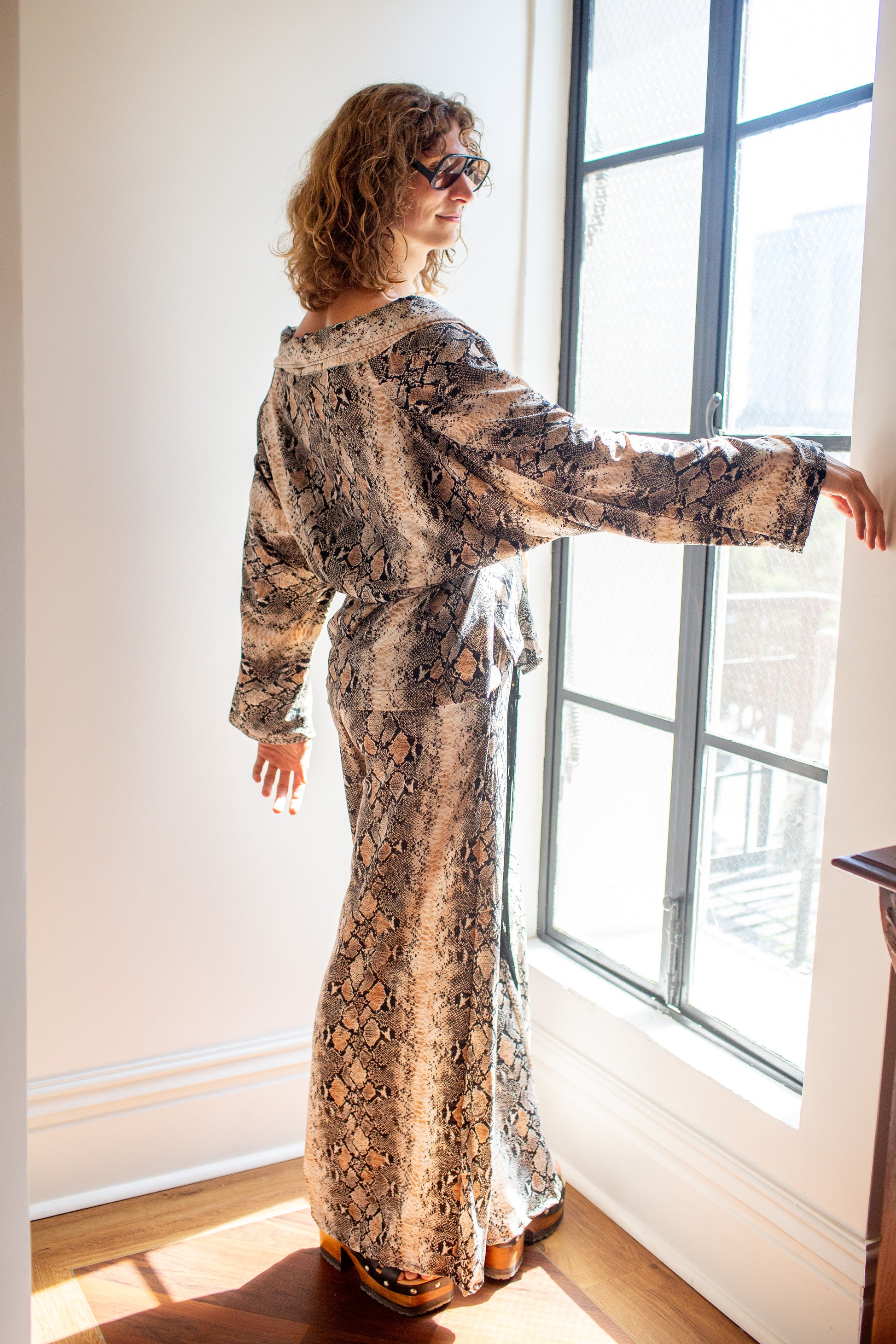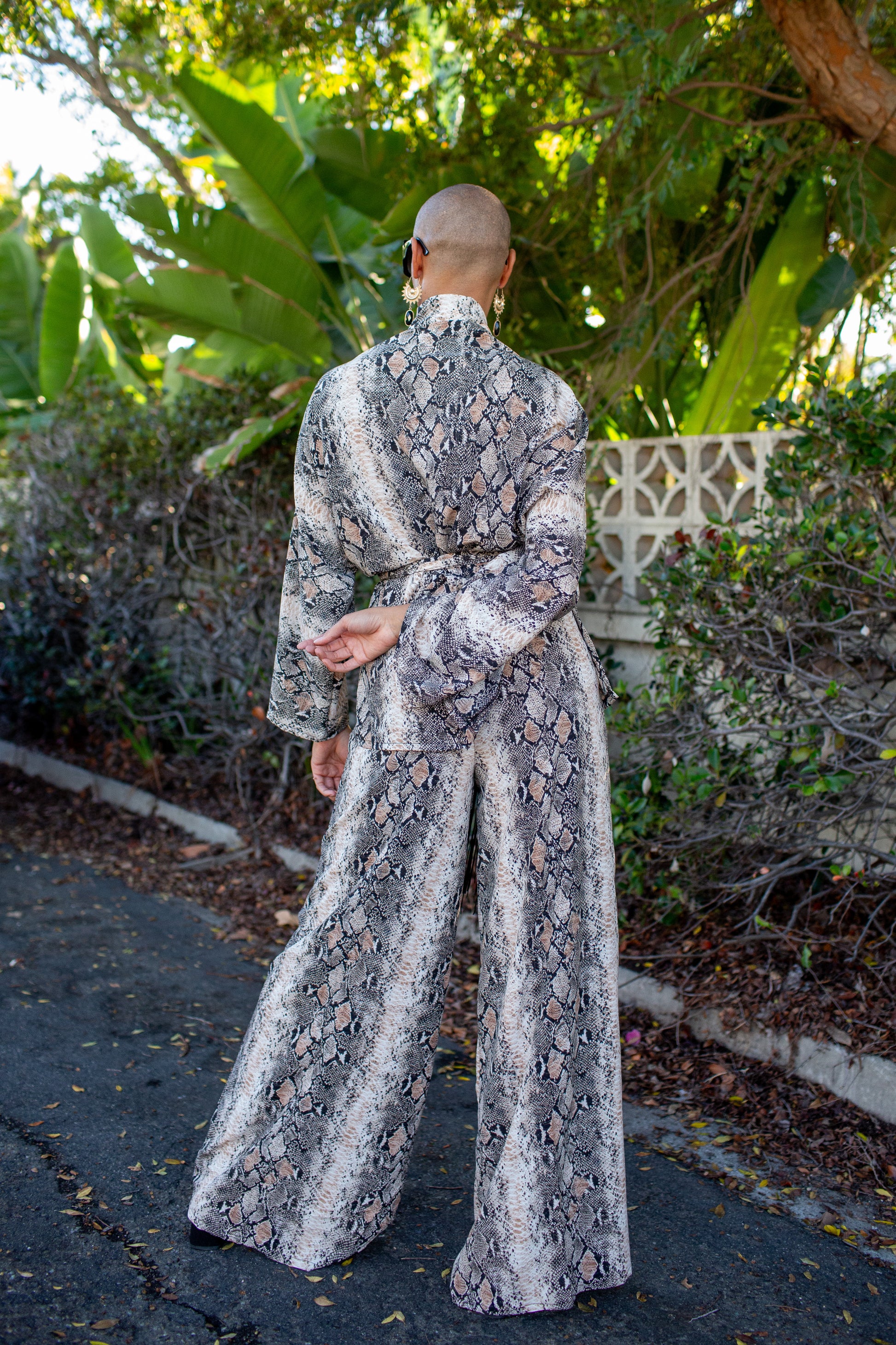 Slip into effortless power dressing with the Monochrome Serpent Dolman Palazzo Set by Jennafer Grace -a striking two piece that pairs our signature dolman sleeve wrap top with flowing palazzo pants. Rendered in a bold python print she's equal parts fierce and fluid, draping the body with dramatic ease. The wrap silhouette lets you cinch the waist with a tasseled belt,  for a sculpted look while the wide leg pant moves with goddess like flow. Whether worn together as a head turning ensemble or styled separately for endless versatility the Monochrome Serpent Set is a statement in motion- wild, unapologetic and undeniably chic.