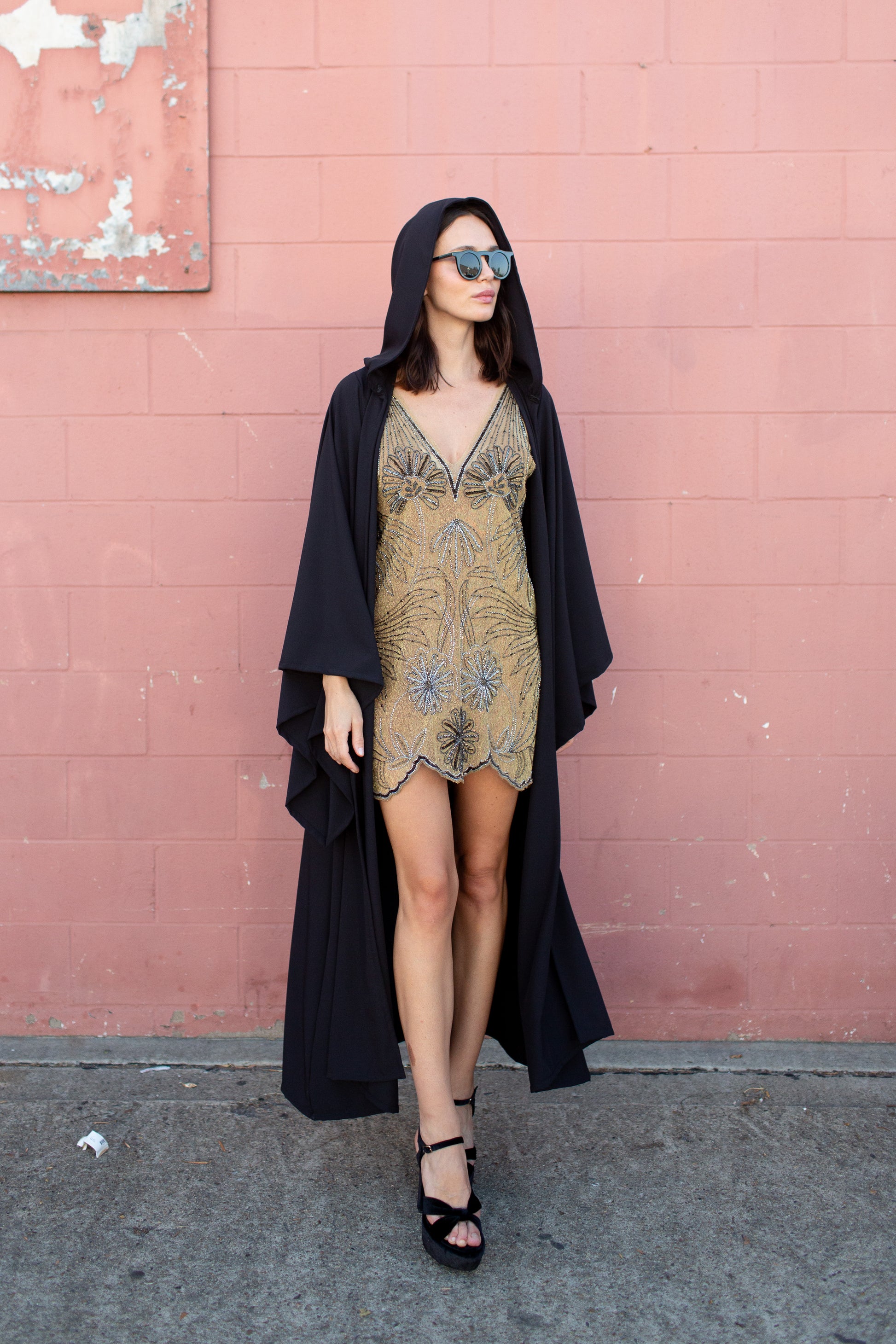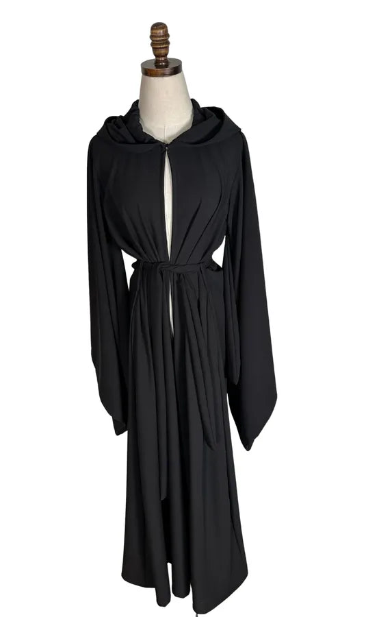 A hooded vision of mystery- this black rayon kimono drapes like liquid shadow, with wide sleeves and a dramatic hood that conceals more than it reveals. Minimal, monastic, and magical- the kind of piece worn by someone who know how to keep a secret!