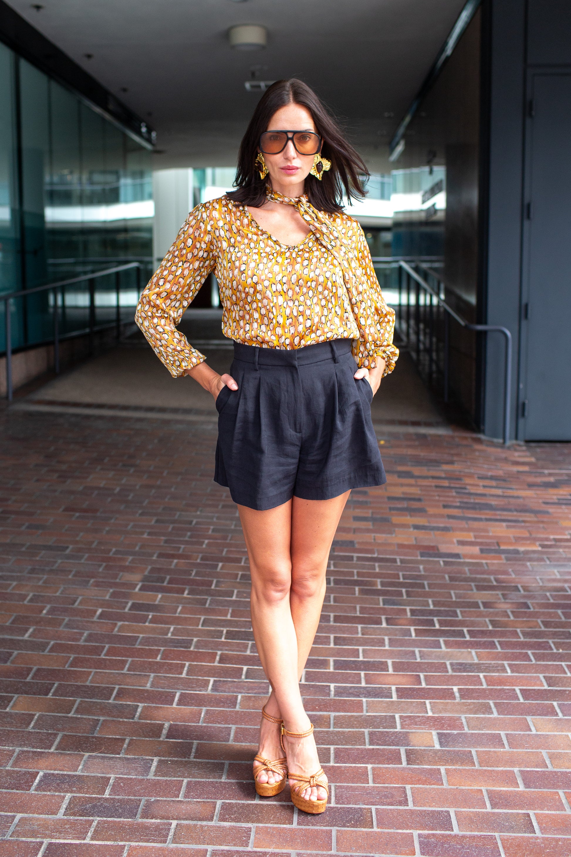 This limited edition glam rock inspired blouse is perfect from desk to dinner. Featuring a versatile bow front and ultrasoft and semi-sheer metallic-infused ocelot print inspired chiffon.