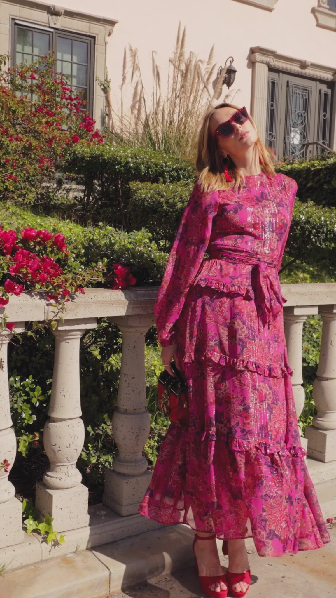 Turn heads in this beautiful yet understated floral maxi. Crafted with a soft, metallic infused fabric, it features high neck, bishop sleeves, tiered ruffle skirt and matching sash for a cinched waist. It's light, airy silhouette is a nod to the romantic and whimsical, and is an easy choice for special occasions or an everyday look.