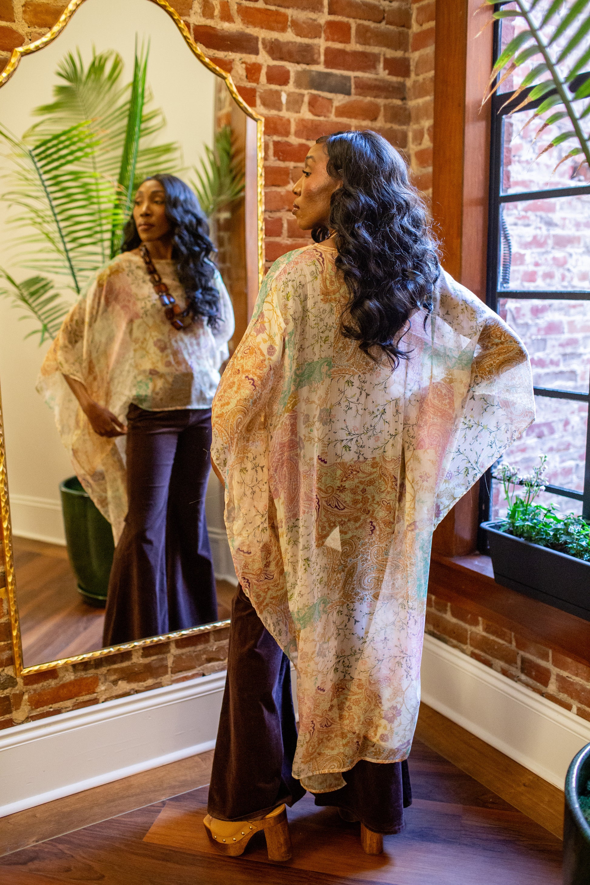 With the Peachy Poetry Float Top by Jennafer Grace you can indulge in the art of self-expression in this hi-lo scarf top. This exquisite garment is more than just a piece of clothing; it's a celebration of fabric in all its glory. This piece offers an airy fit designed to drape beautifully on all body types. The cape back floats behind for a dramatic effect and the creamy soft chiffon printed in a paisley and floral pastel carries this top from opera to dinner... The newest shape on the JG menu and is sure to be a collectors item.