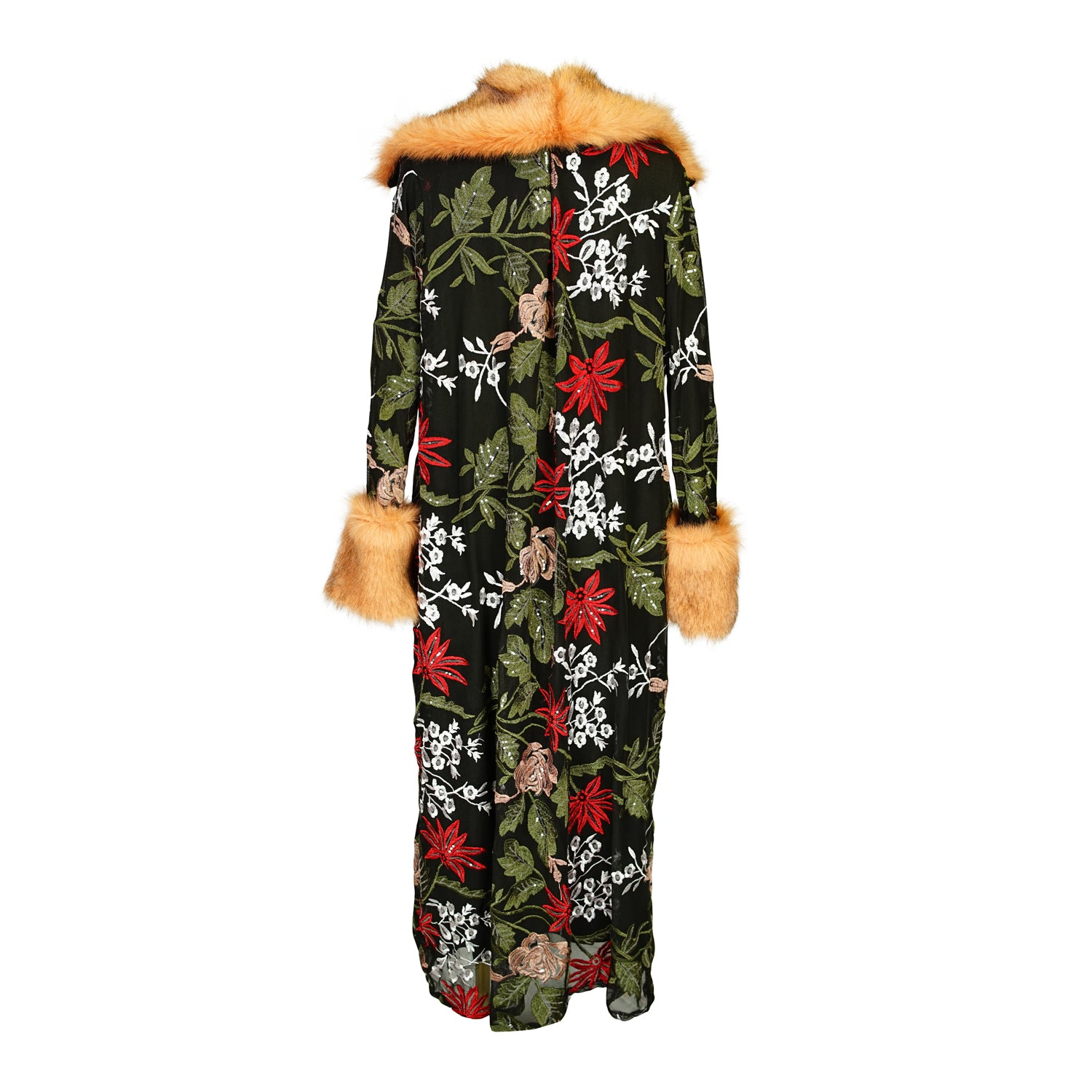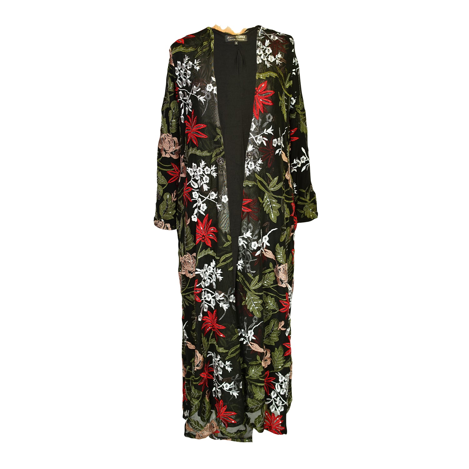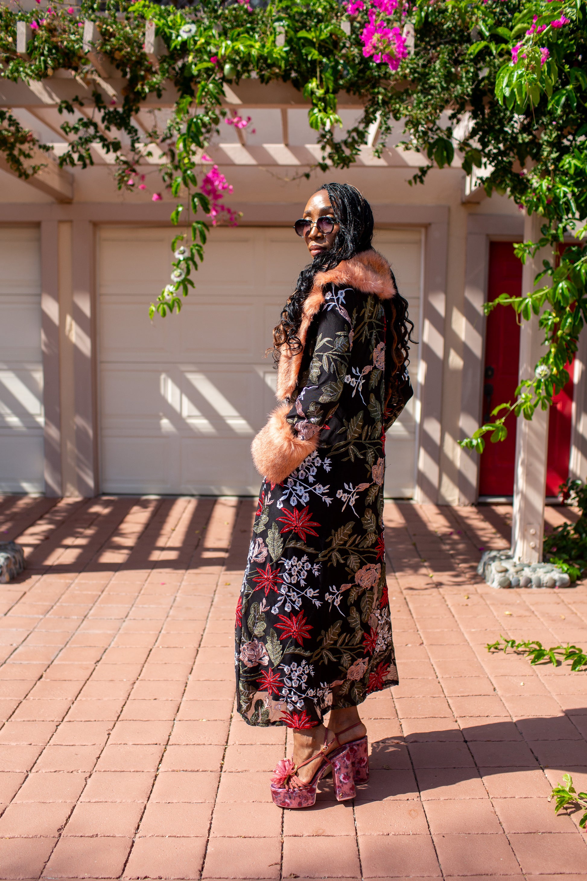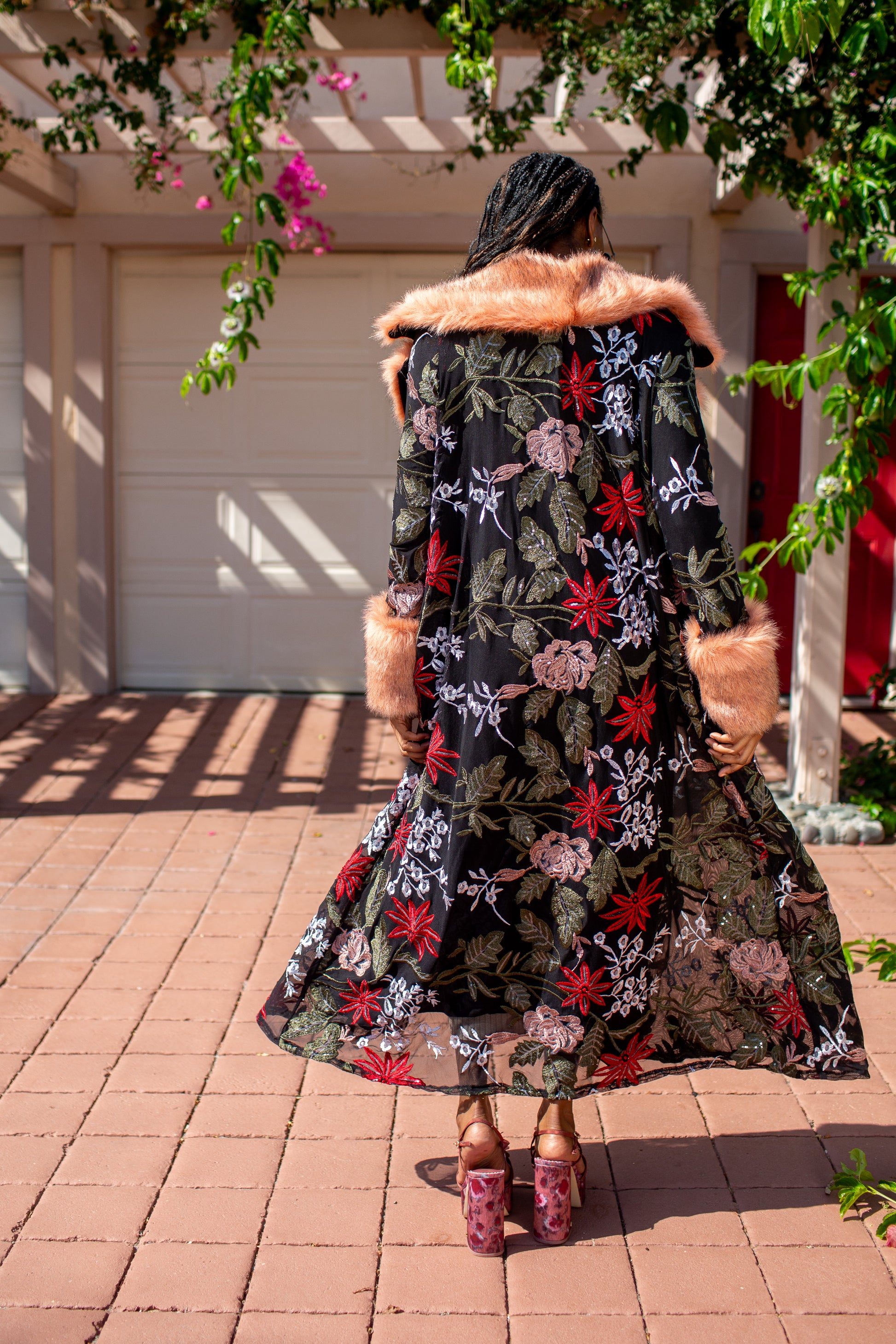 This spectacular dark boho coat was handmade in southern California. Made from a super soft floral embroidered mesh outer lined with a soft georgette, this piece features removable faux fur cuffs, collar, and in-seam pockets for the ultimate fusion of style and comfort.