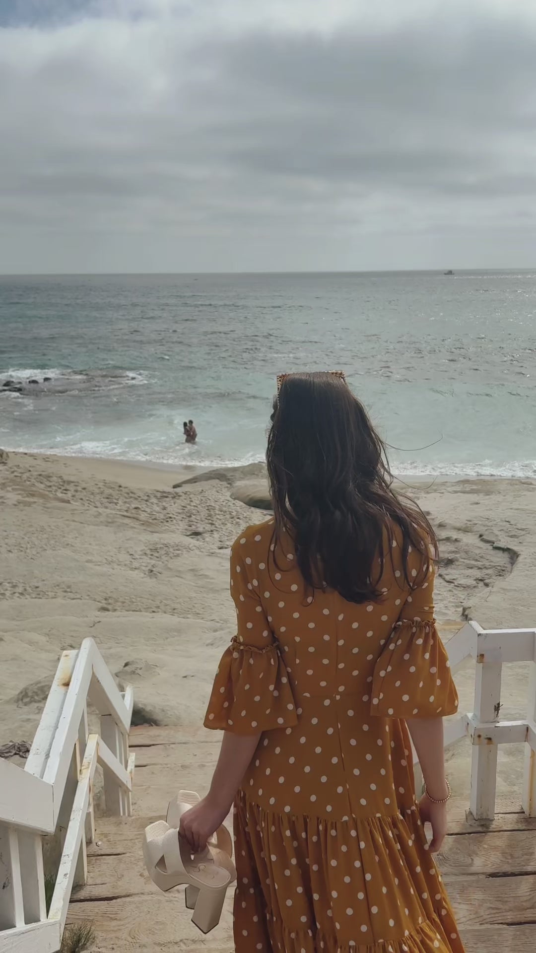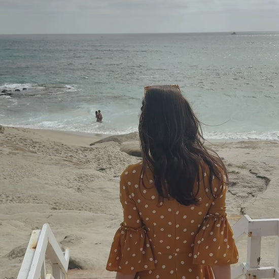 This brilliant mustard yellow dress is a love letter to summer romance. Made with a polka dot printed bubble crepe georgette, it features pockets, bell sleeves, and a full, tiered skirt. Bohemian splendor, handmade in San Diego, California.