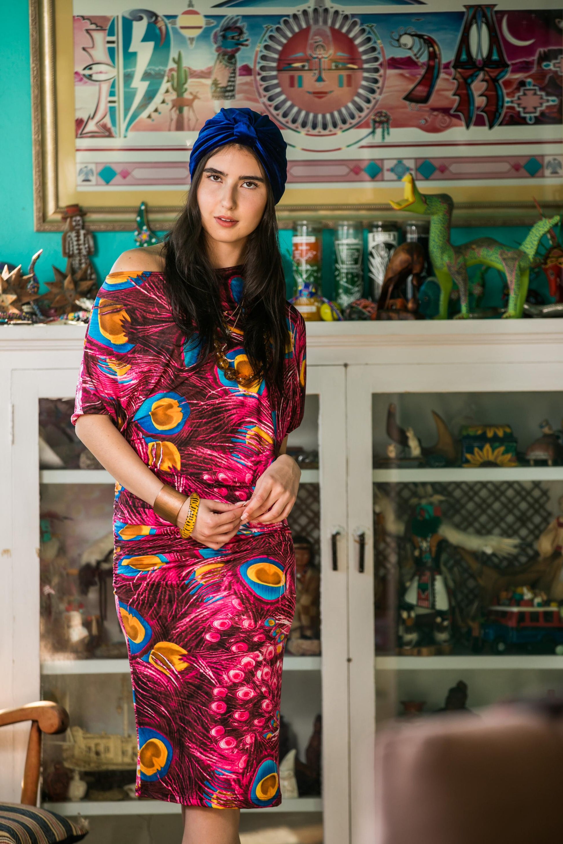 The Angle Dress is a JG signature piece combining simple and sexy for any body type! Made from luxe metallic jersey, featuring a fitted pencil skirt and light ruching at the hip to cover any of nature’s lumps and bumps. The angled sleeves can be arranged for a peek of shoulder and bra strap - this dress is an easy statement silhouette and the perfect base for amazing jewelry. Machine washable! XS: 0-2, S: 4-6, M: 8-10, L: 12-14, XL: 16/18