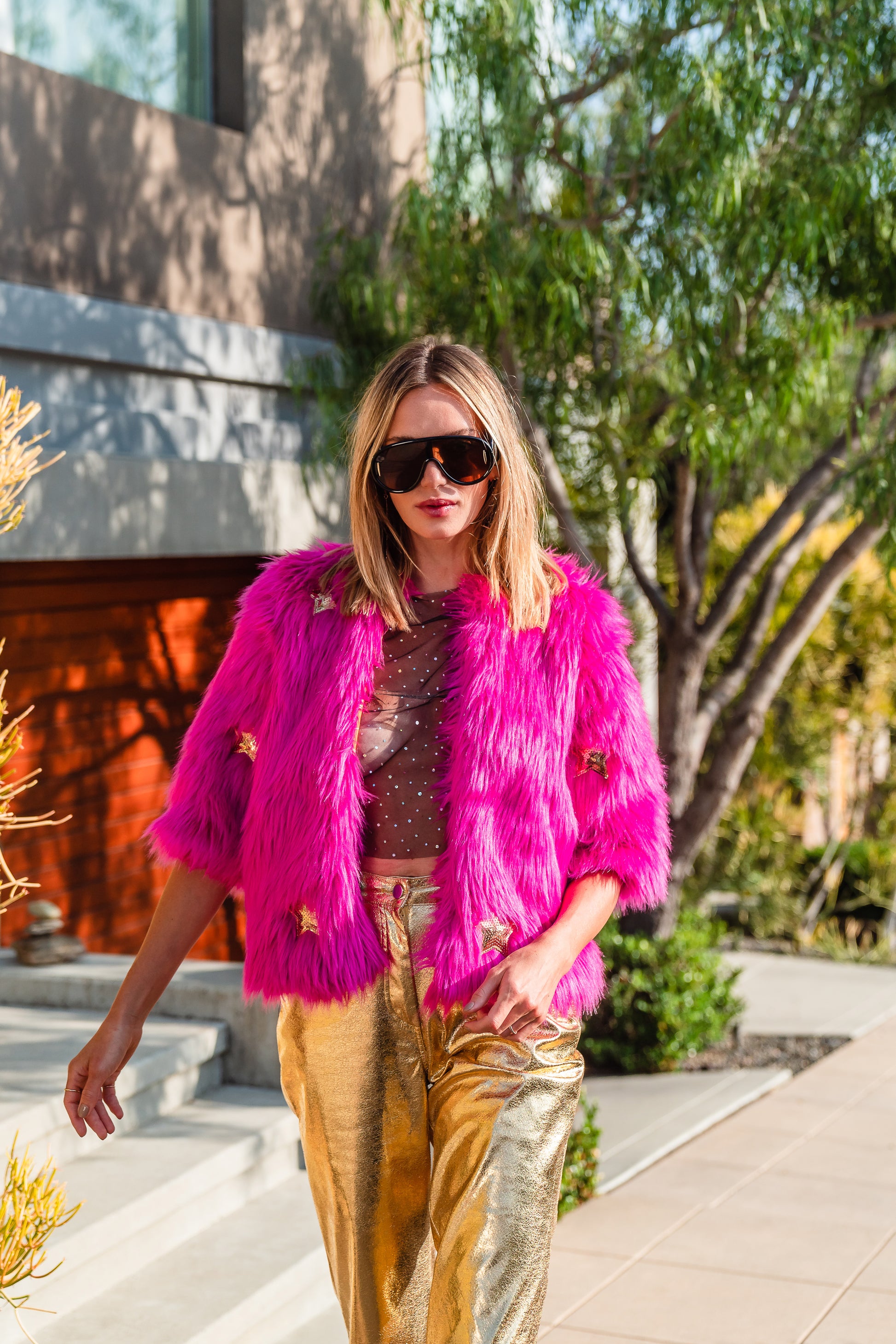 The out-of-this-world Planet Queen jacket is hand crafted with stunning UFO and gold star patches on ultra soft synthetic all faux fur. Featuring pockets and a bright, cheerful rayon lining! Style your look for casual funk, or red-carpet ready.