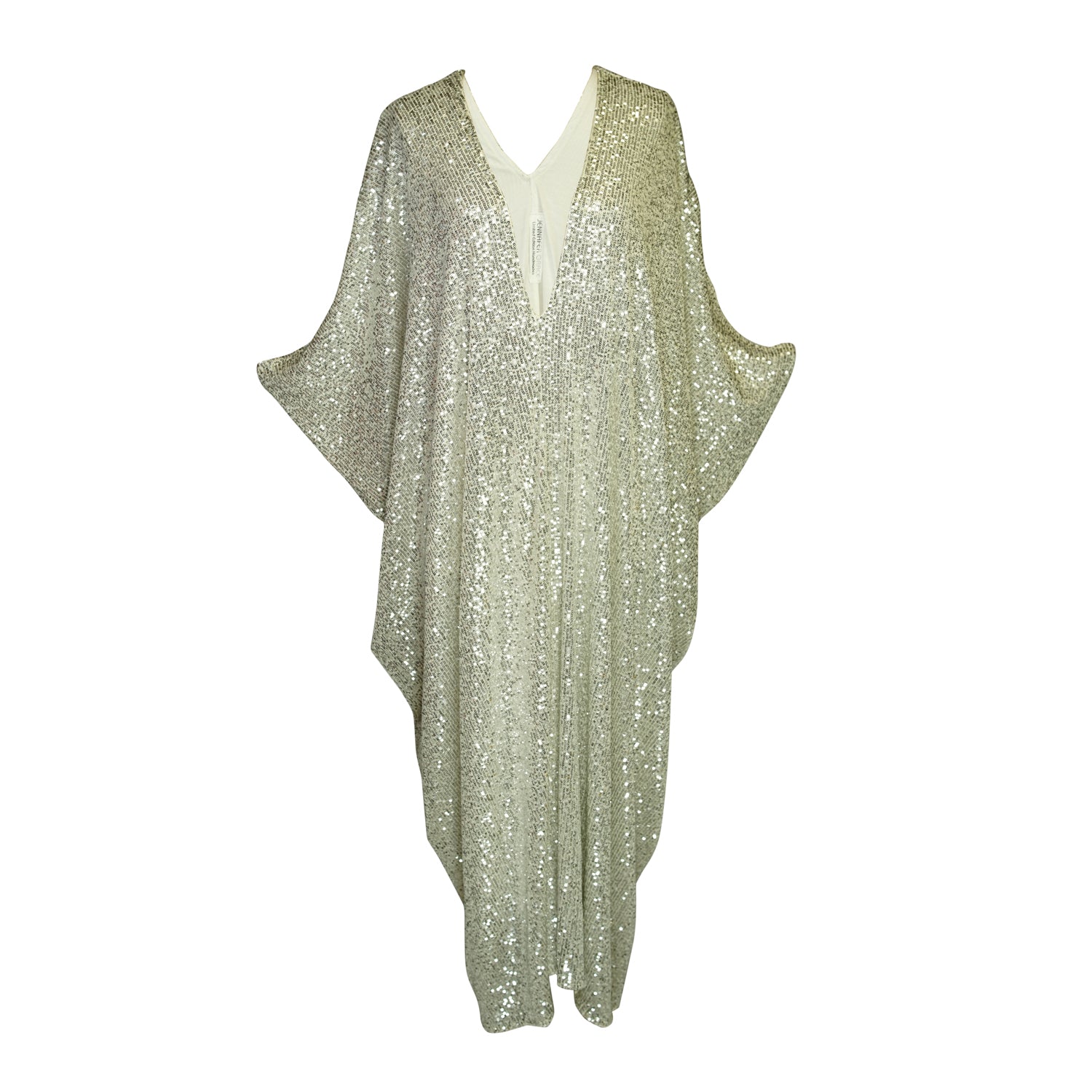 This monochromatic caftan is the answer to glam layering. Made with a stunning platinum silver sequined soft mesh fabric and lots of love. Bohemian splendor, handmade in California.