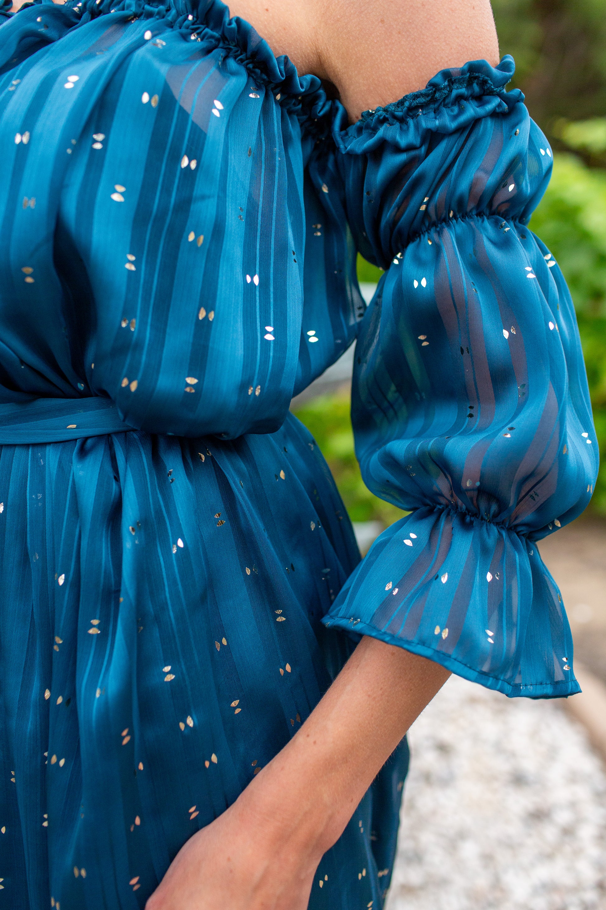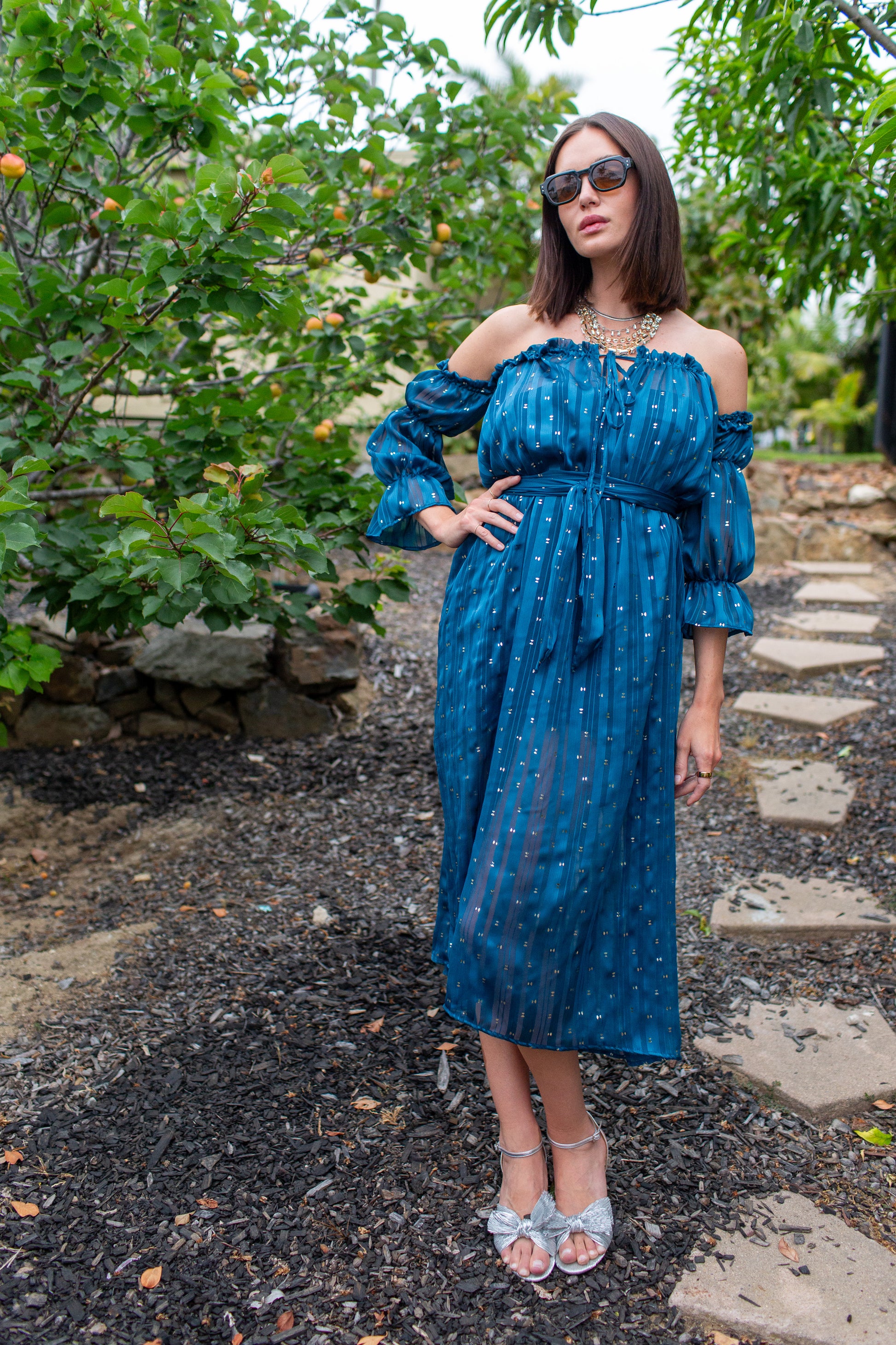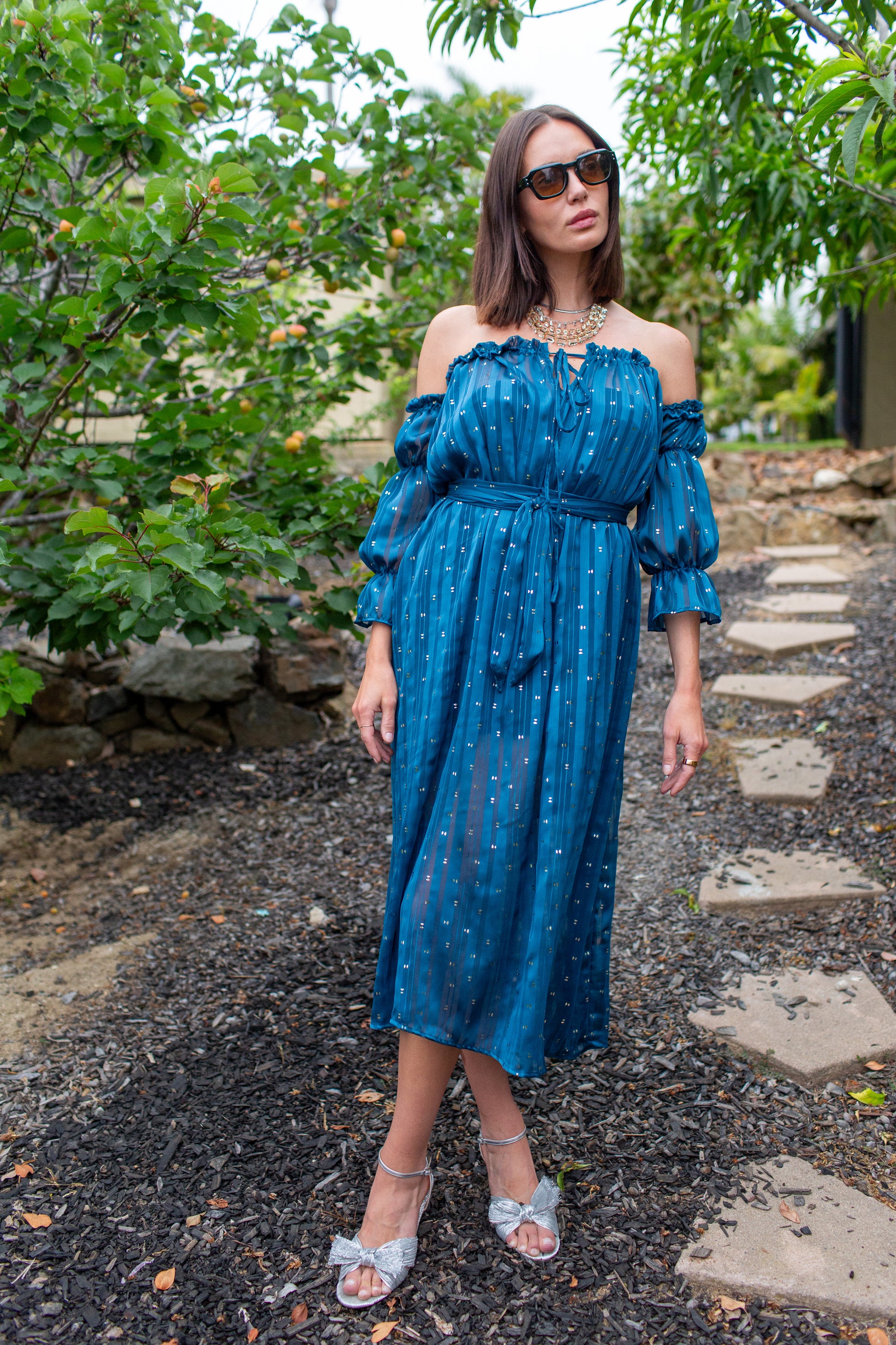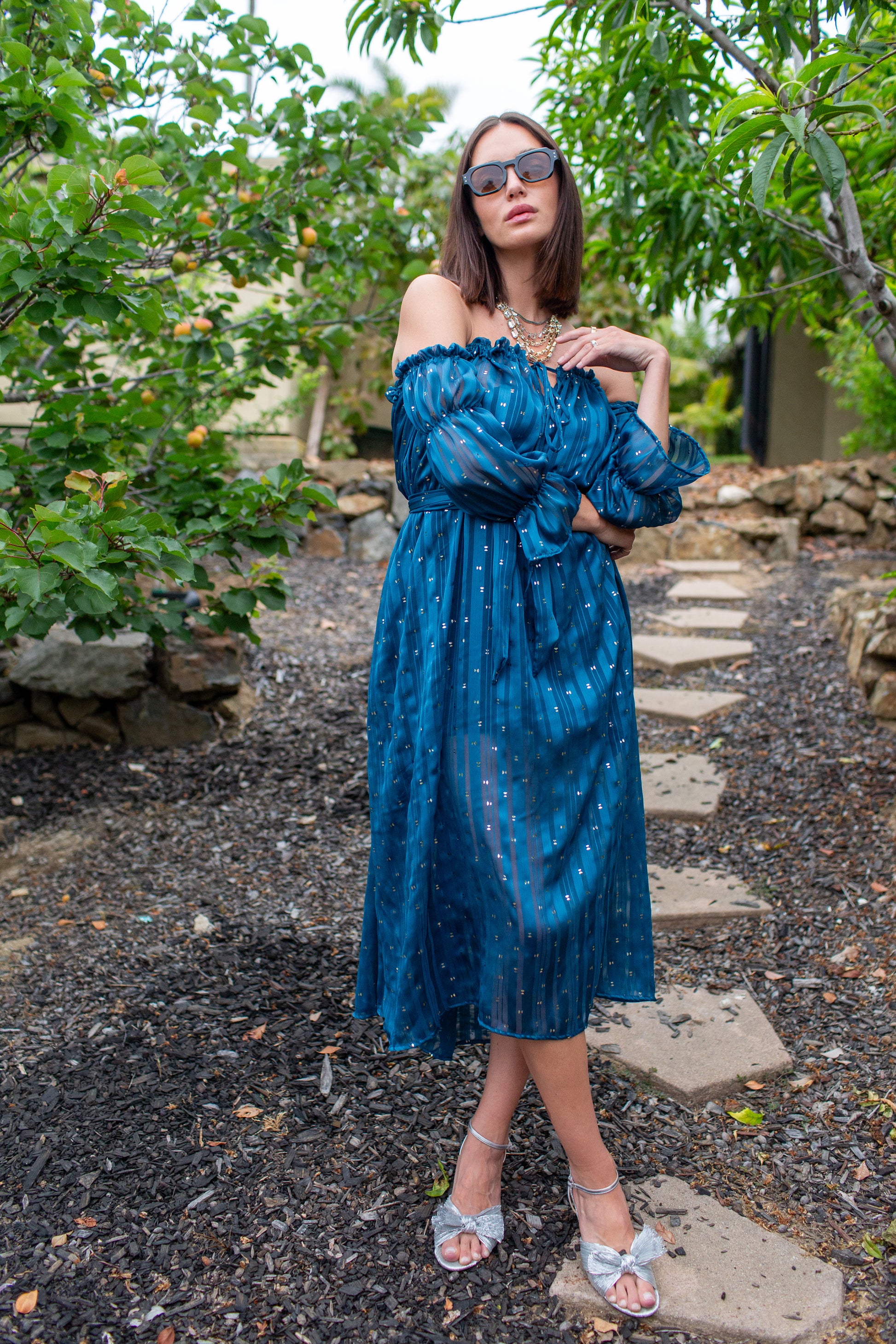 The striped deep teal chiffon and silver speckles are pure alchemy: sparkling light catching beacons that flicker like starlight on the dance-floor. She doesn't just shimmer she speaks!