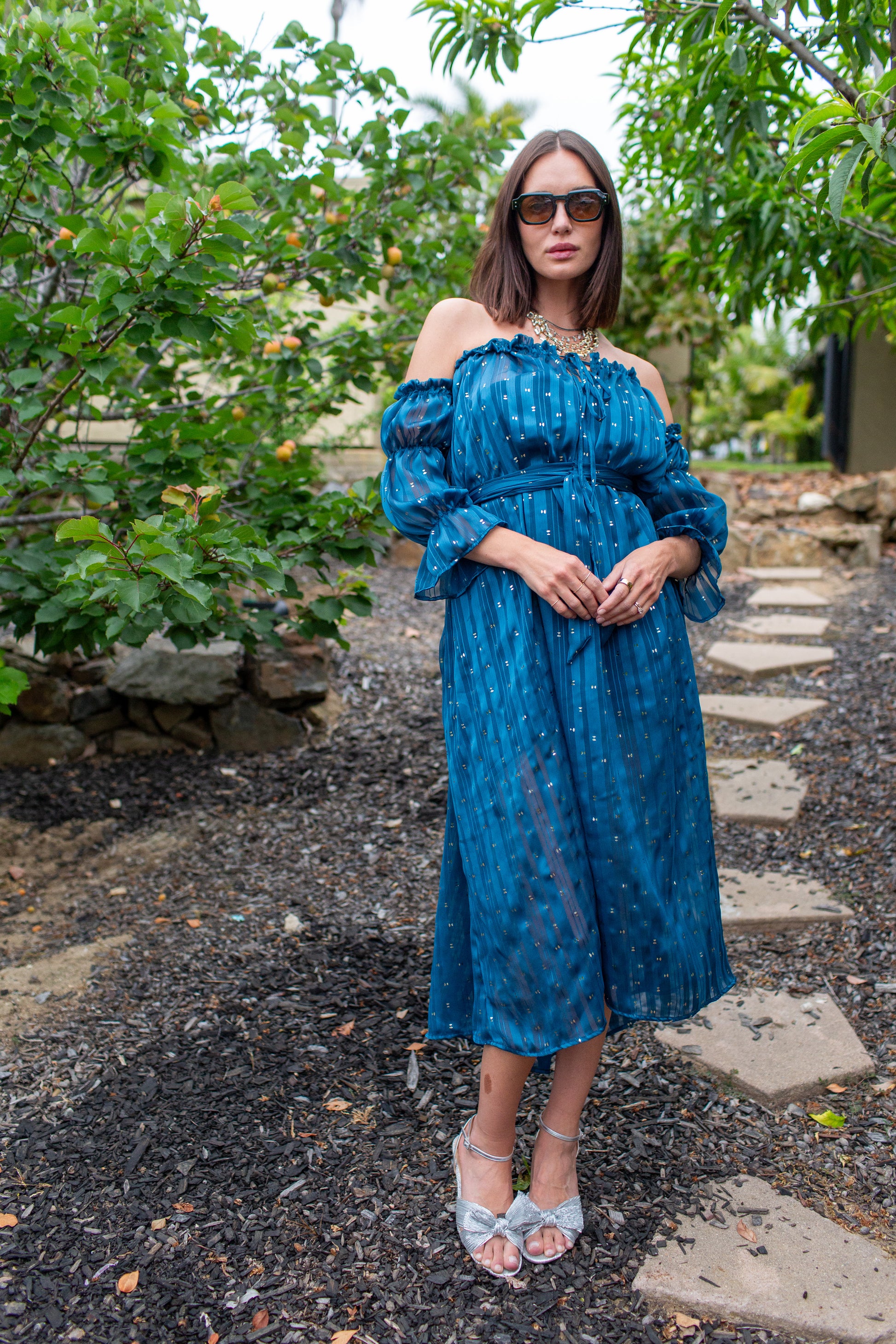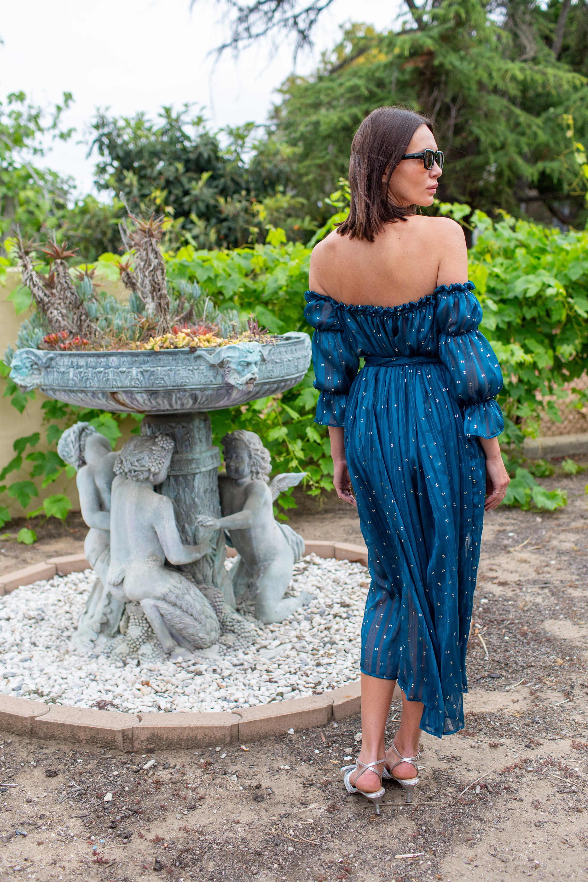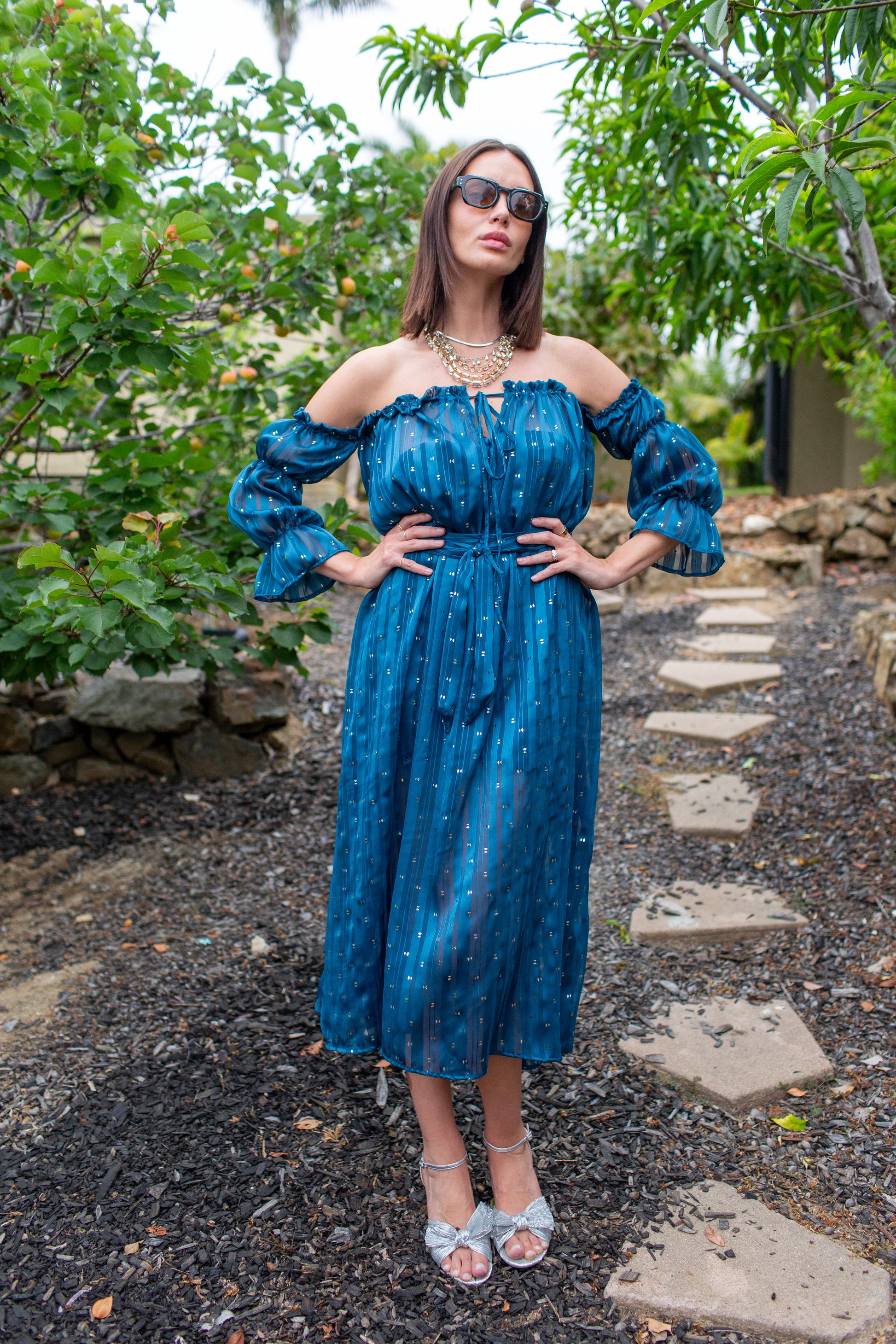 The striped deep teal chiffon and silver speckles are pure alchemy: sparkling light catching beacons that flicker like starlight on the dance-floor. She doesn't just shimmer she speaks!