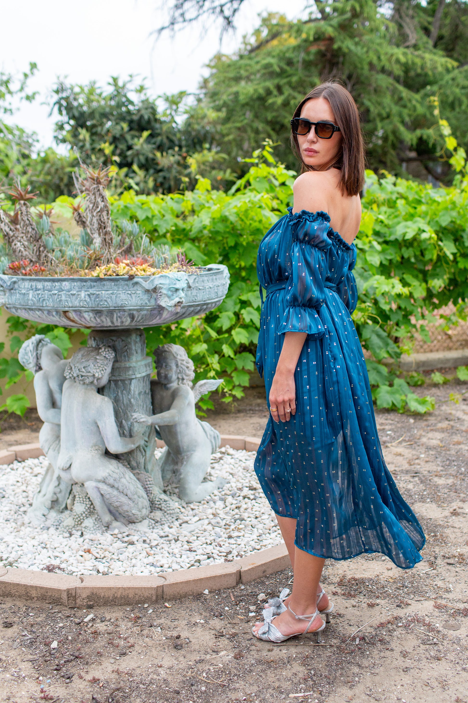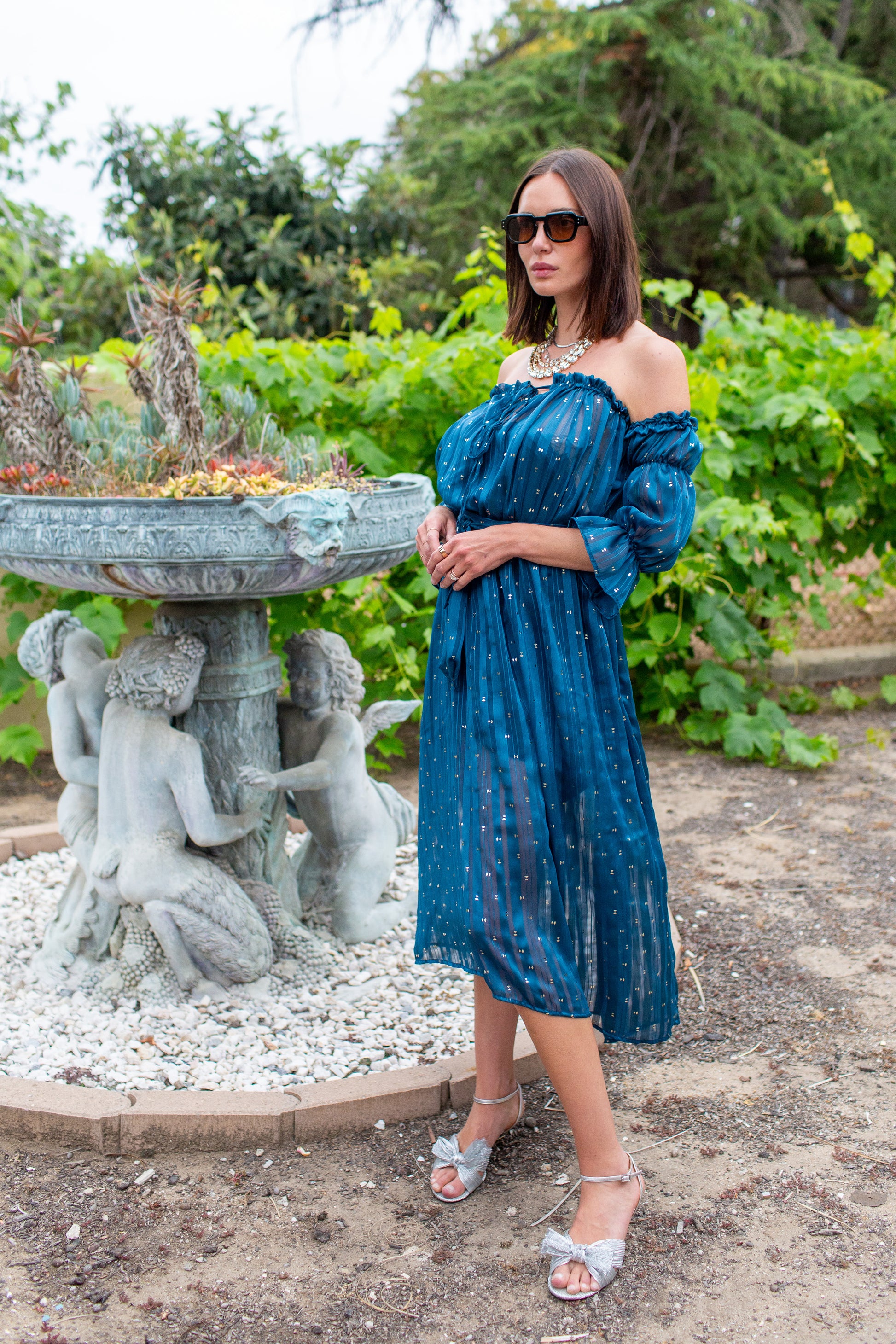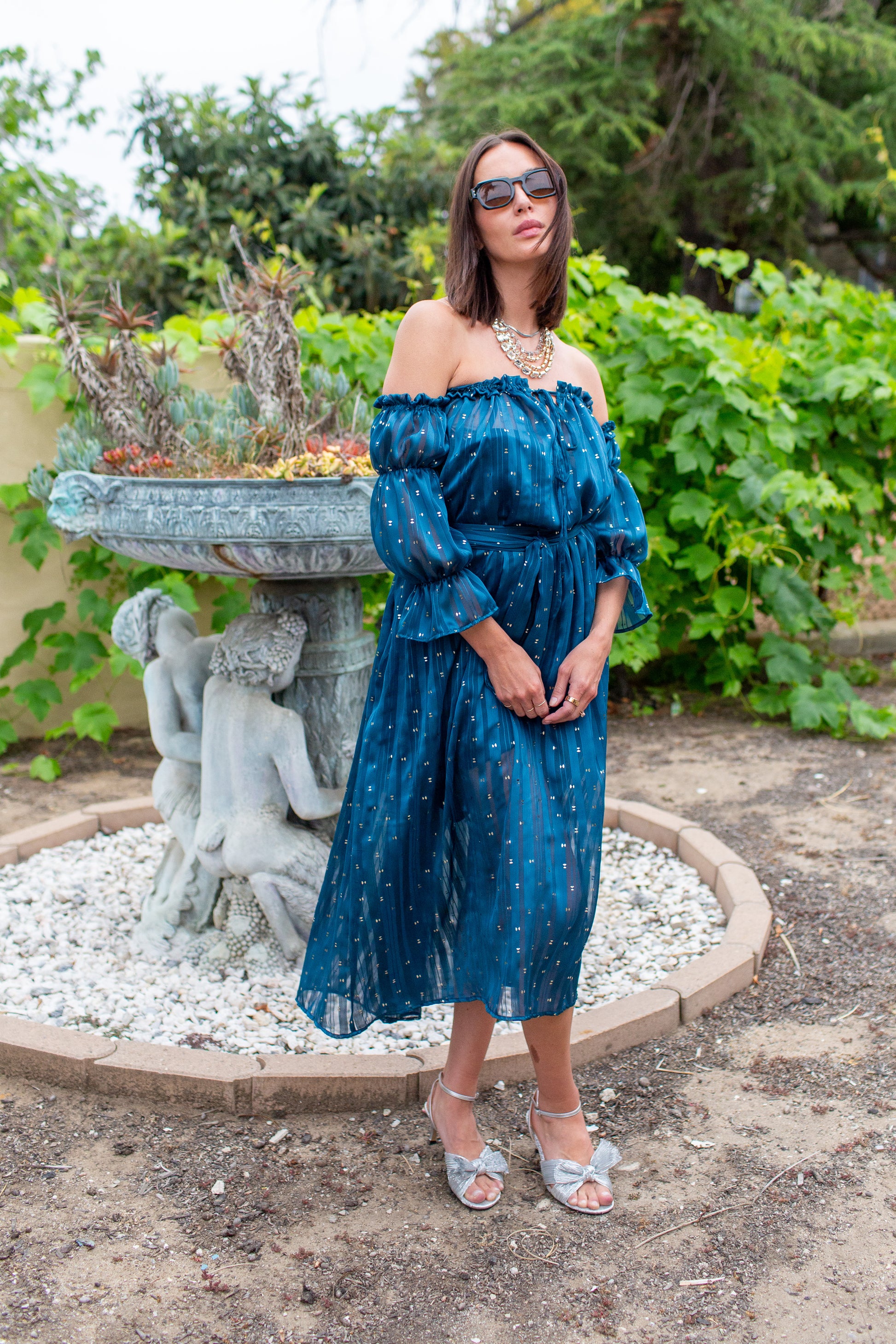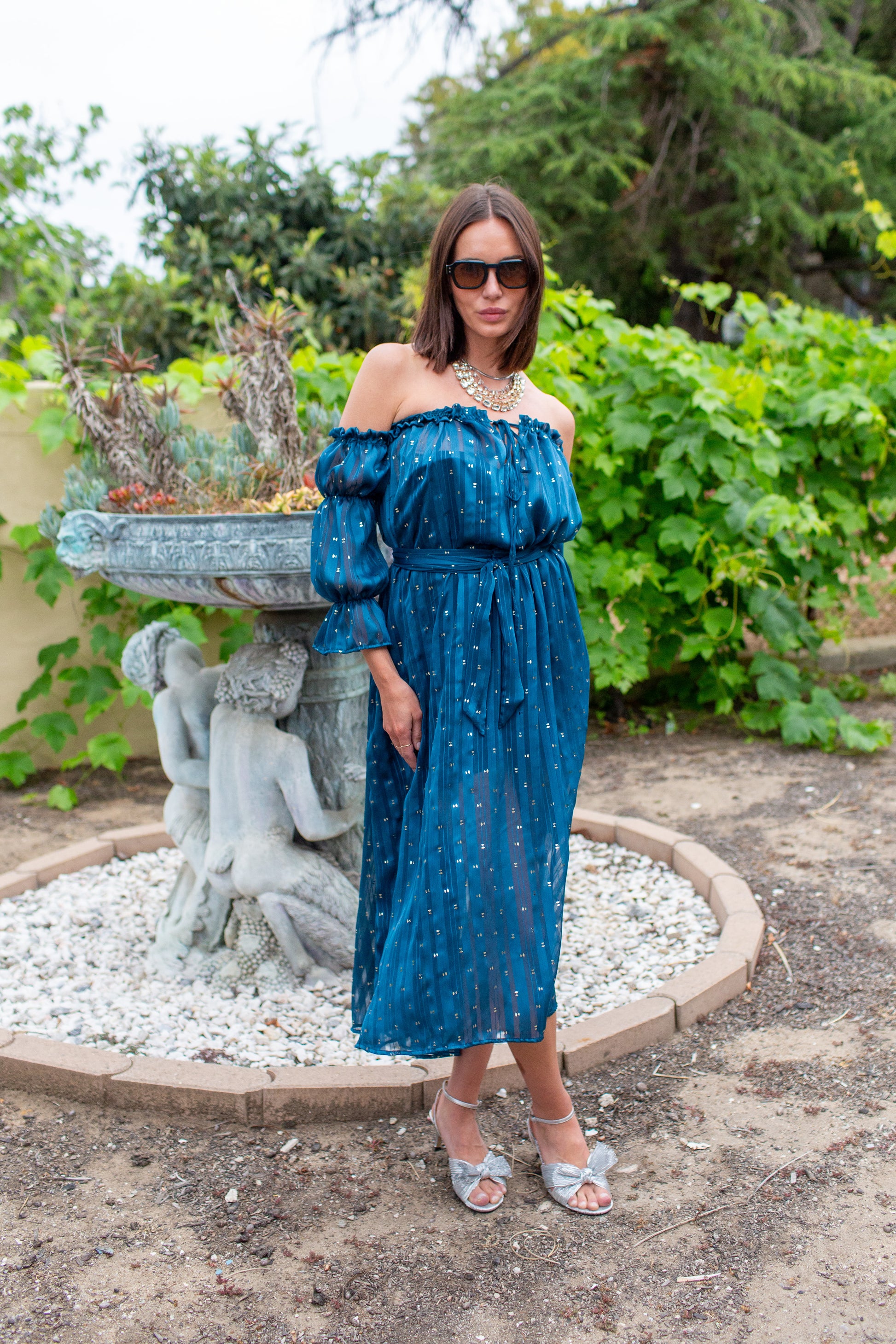 The striped deep teal chiffon and silver speckles are pure alchemy: sparkling light catching beacons that flicker like starlight on the dance-floor. She doesn't just shimmer she speaks!