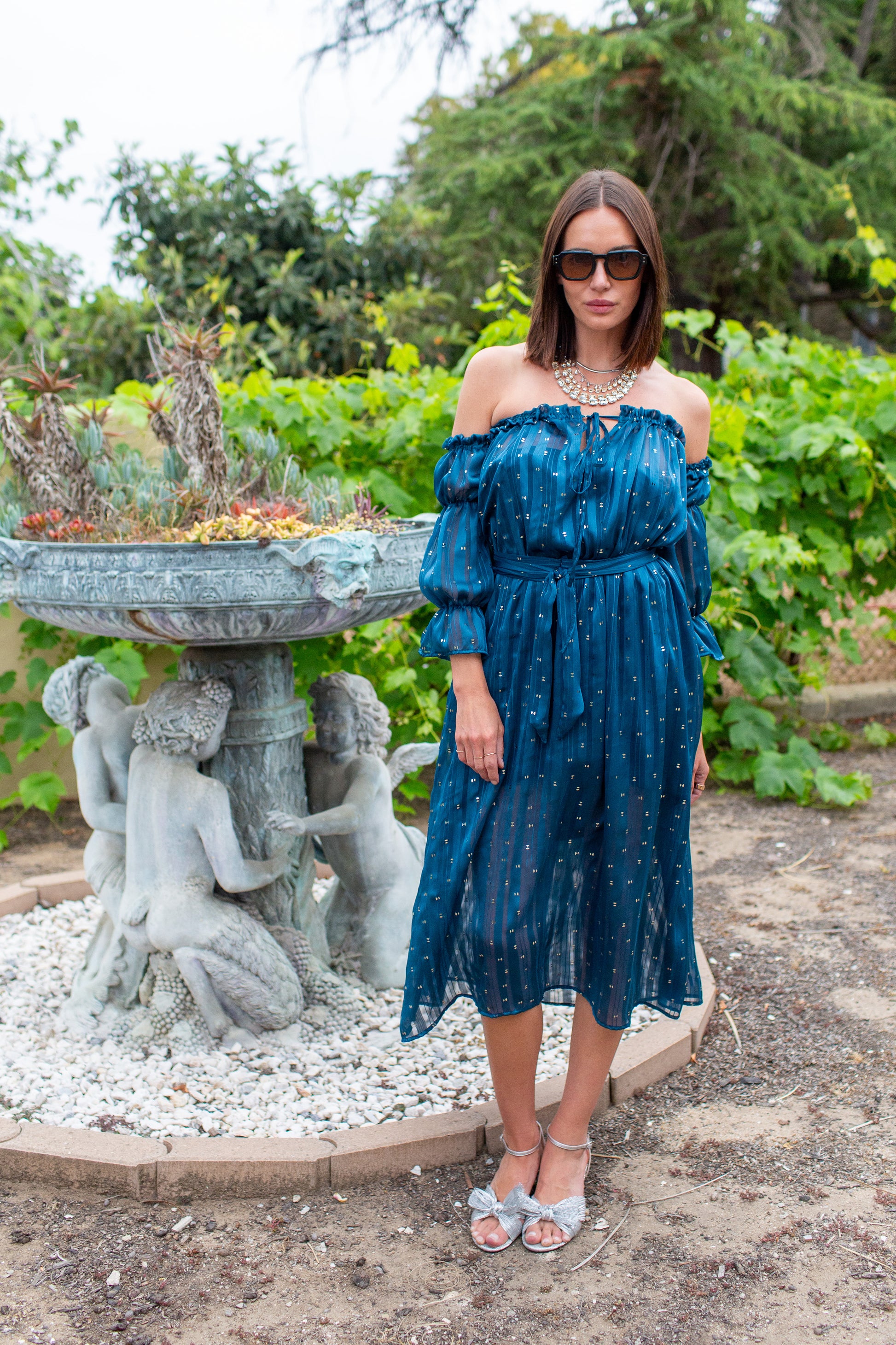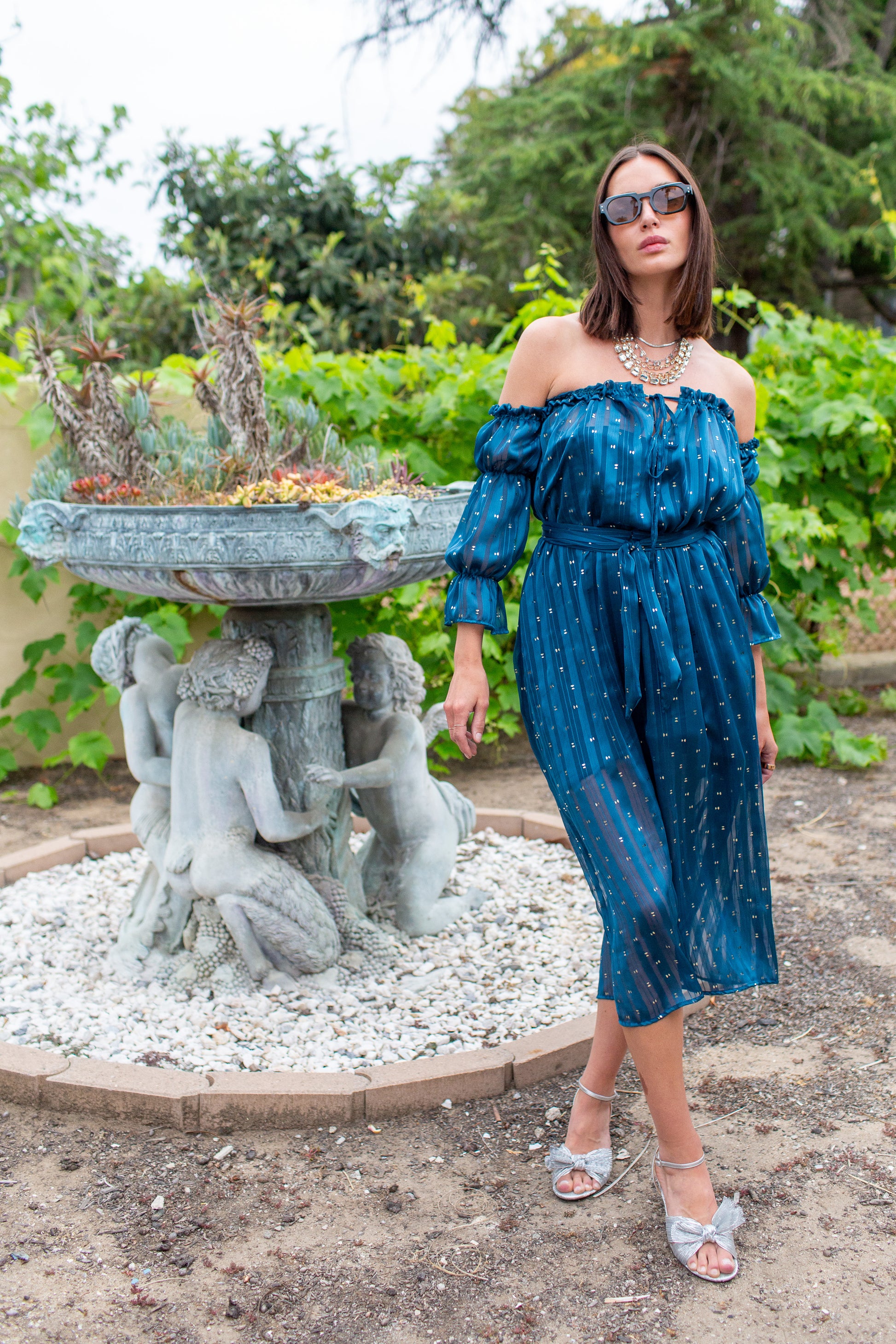 A study in contrasts- ease and glamour, structure and softness. This off the shoulder silhouette floats effortlessly from a ruched drawstring neckline, and anchored by voluminous peasant sleeves and a free fluid body. Functional pockets add utility, while a self tie belt invites you to define the waist, or not.