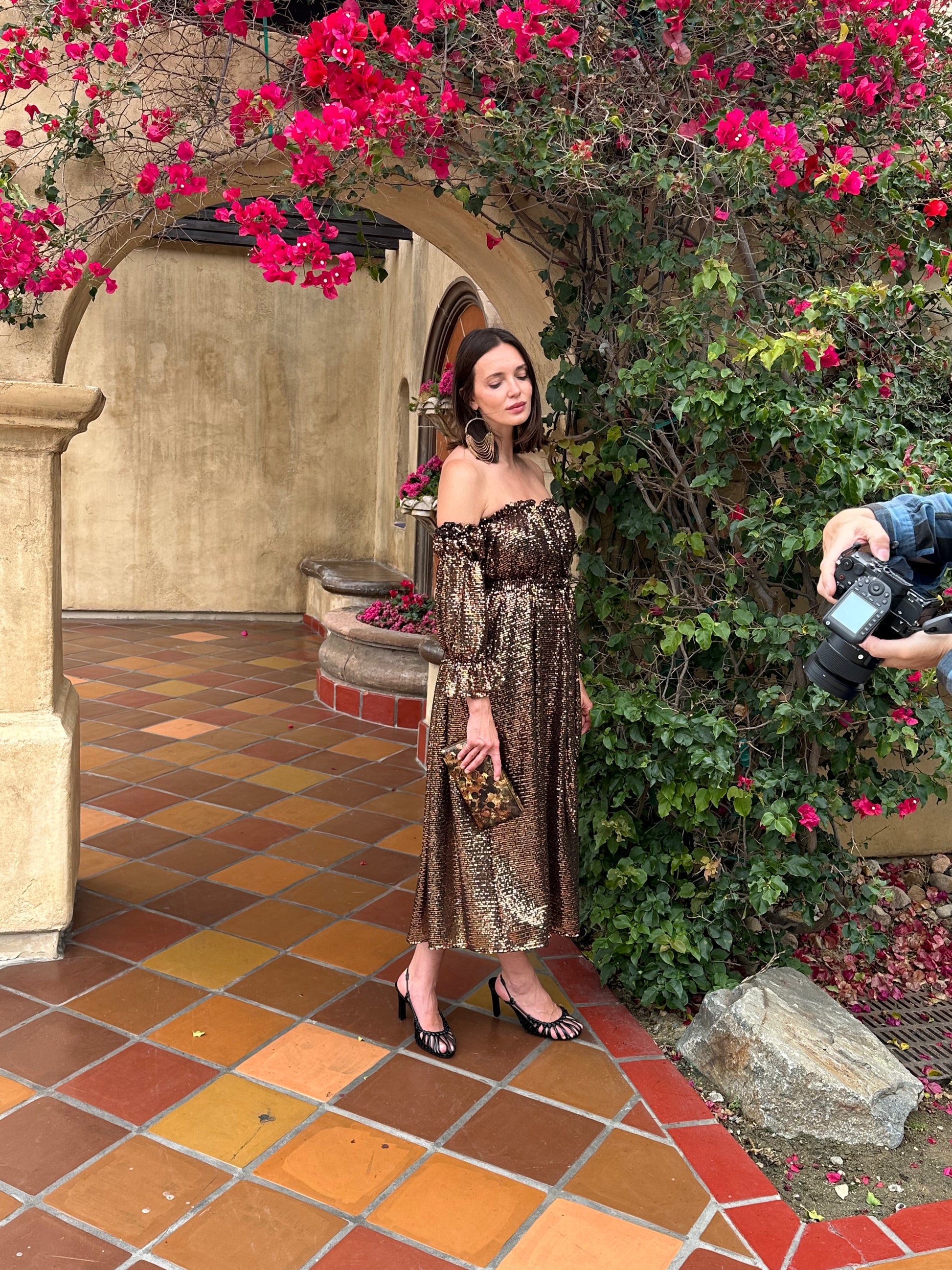 The copper sequins are pure alchemy: molten light catching discs that flicker like firelight on the dance-floor. She doesn't just shimmer she speaks!