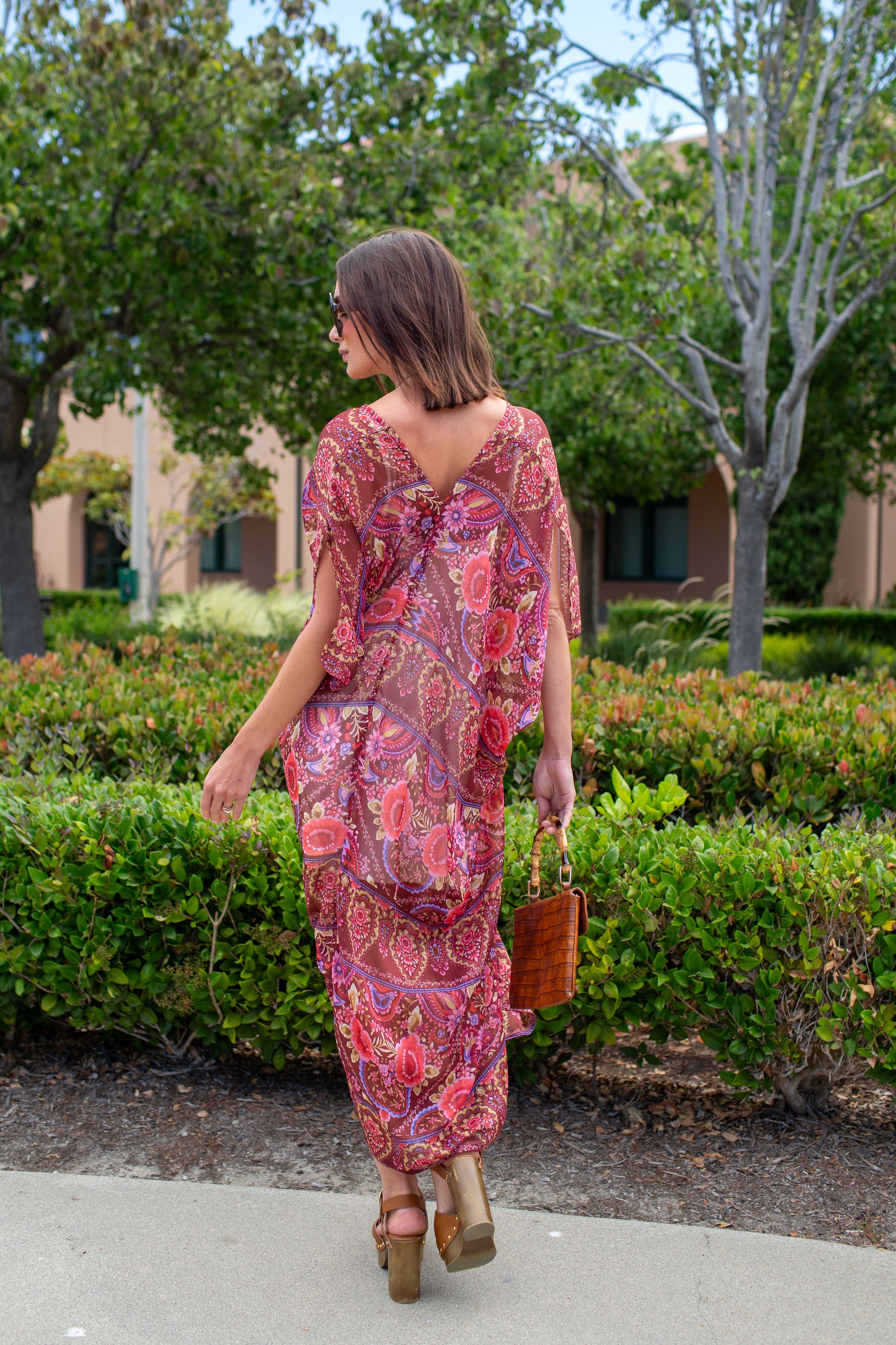 The Lorraine Caftan by Jennafer Grace features a bohemian rose and ruby hued paisley print, adding a unique and stylish touch to this versatile garment. This exquisite garment is more than just a piece of clothing; it's a celebration of fabric in all its glory. Crafted with generous amounts of intricately patterned rayon chiffon and lots of love, this piece offers an airy fit designed to drape beautifully on all body types.