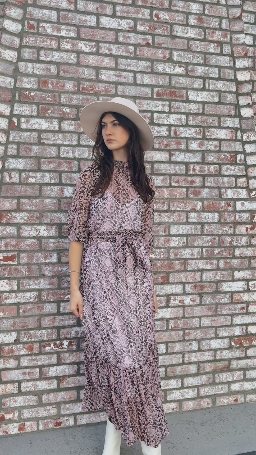 This elegant, vintage-inspired gown is homage to a dreamy time gone-by. With a high neck ruffle collar, wonderfully full bishop sleeves, and slim matching sash and slip, this bold snake print maxi will turn heads.