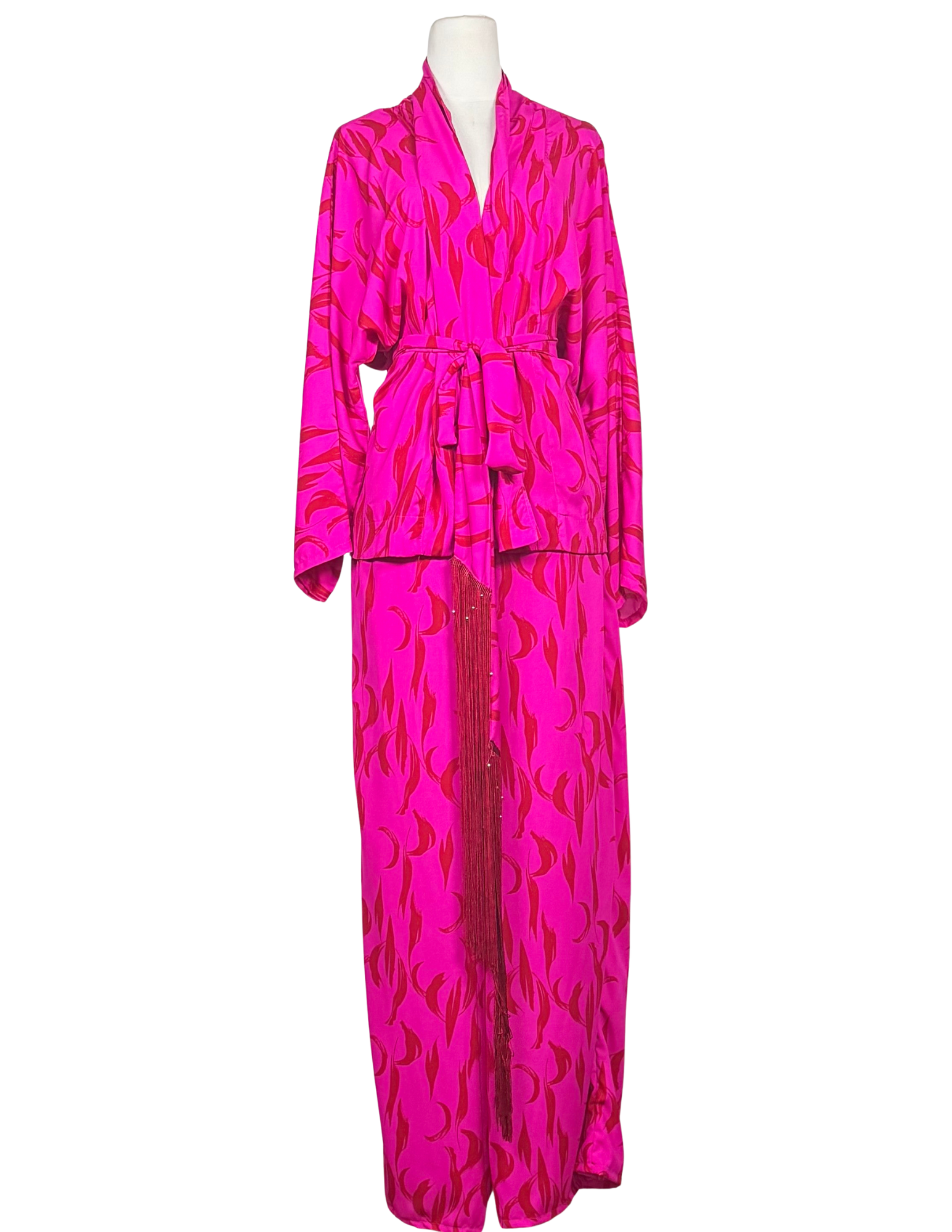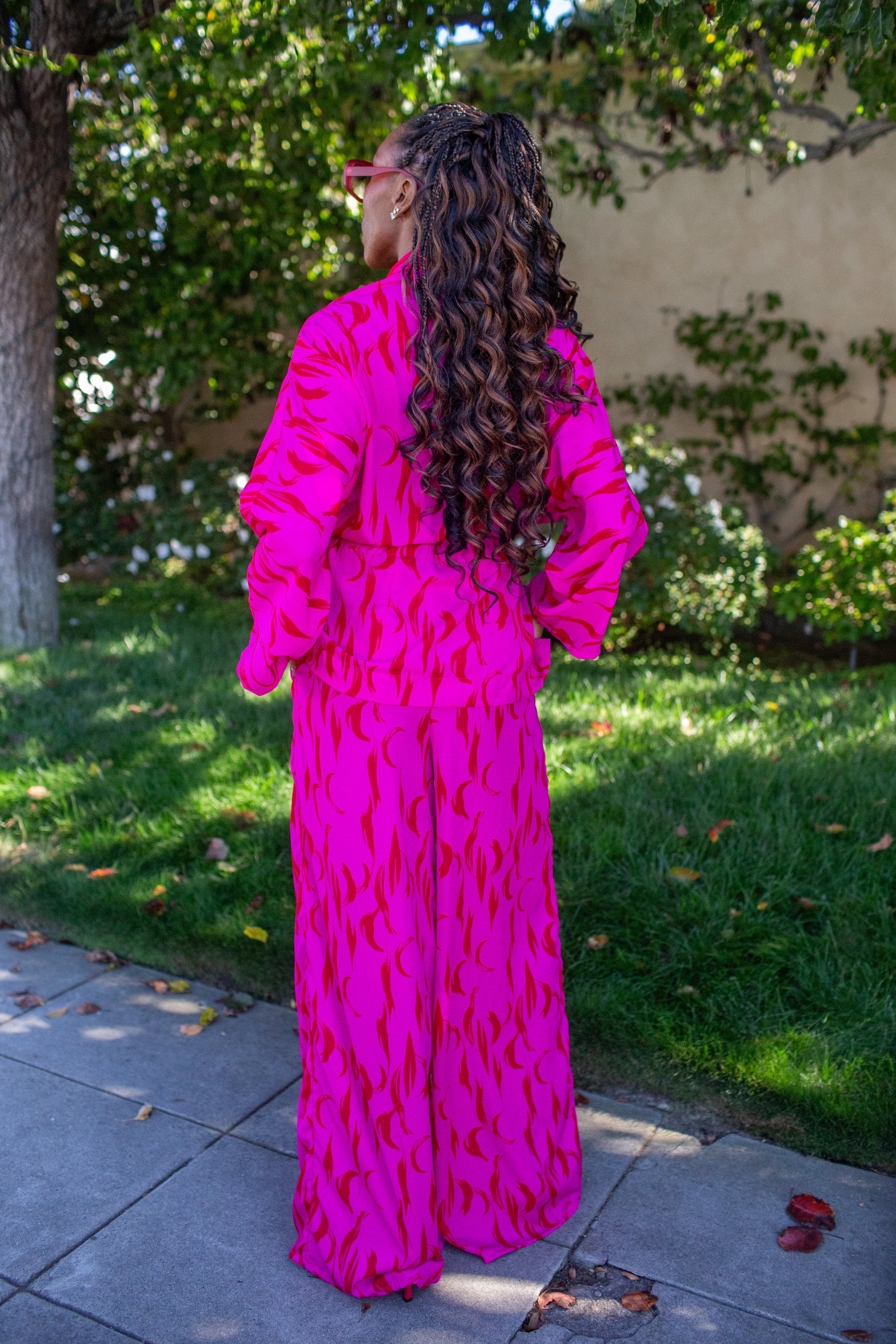 Slip into effortless power dressing with the Rouge Reverie Dolman Palazzo Set by Jennafer Grace -a striking two piece that pairs our signature dolman sleeve wrap top with flowing palazzo pants. Rendered in a bold pink and red abstract flame print she's equal parts firey and fluid, draping the body with dramatic ease. The wrap silhouette lets you cinch the waist with a tasseled belt, for a sculpted look while the wide leg pant moves with goddess like flow. Whether worn together as a head turning ensemble or styled separately for endless versatility the Monochrome Serpent Set is a statement in motion- wild, unapologetic and undeniably chic.