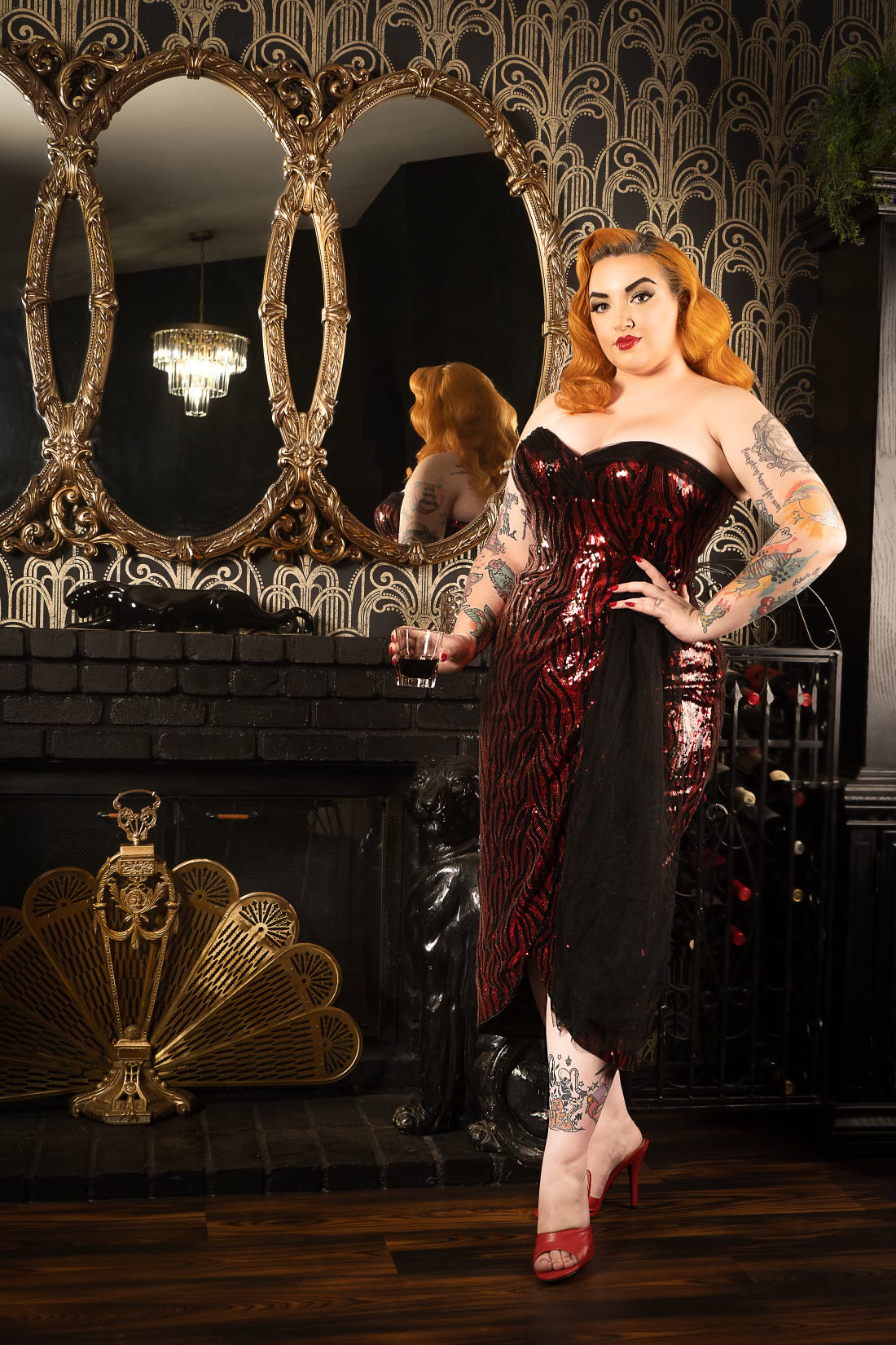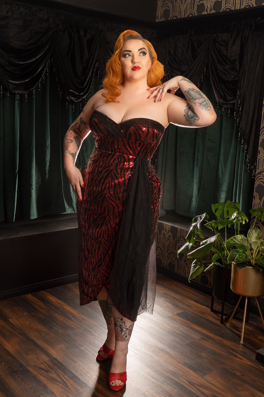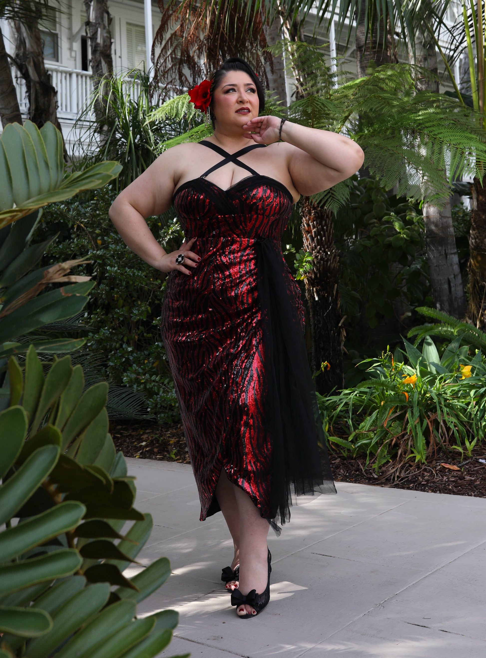 Introducing "The Girl of My Dreams Dress" - a mesmerizing tribute to the iconic tiger print dress that stole hearts when worn by Marilyn Monroe in "The Seven Year Itch"! Crafted from fully lined Red and Black zebra sequins, this sensational show-stopper boasts a comfortable medium stretch that'll hug your curves like a dream. The sweetheart-shaped bust line features delightful tulle details and comes with removable straps for a touch of versatility. The skirt has a ravishing wrap front and features a removable voluminous tulle skirt that'll make you feel like a true Hollywood starlet!
