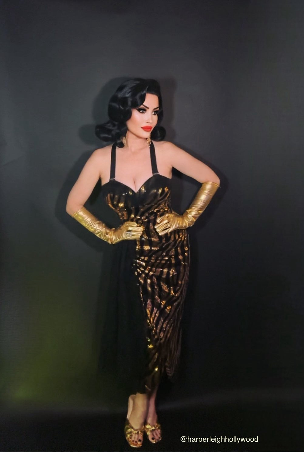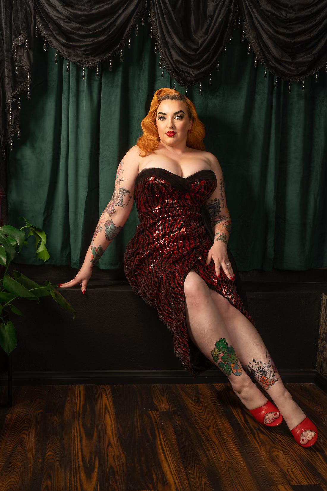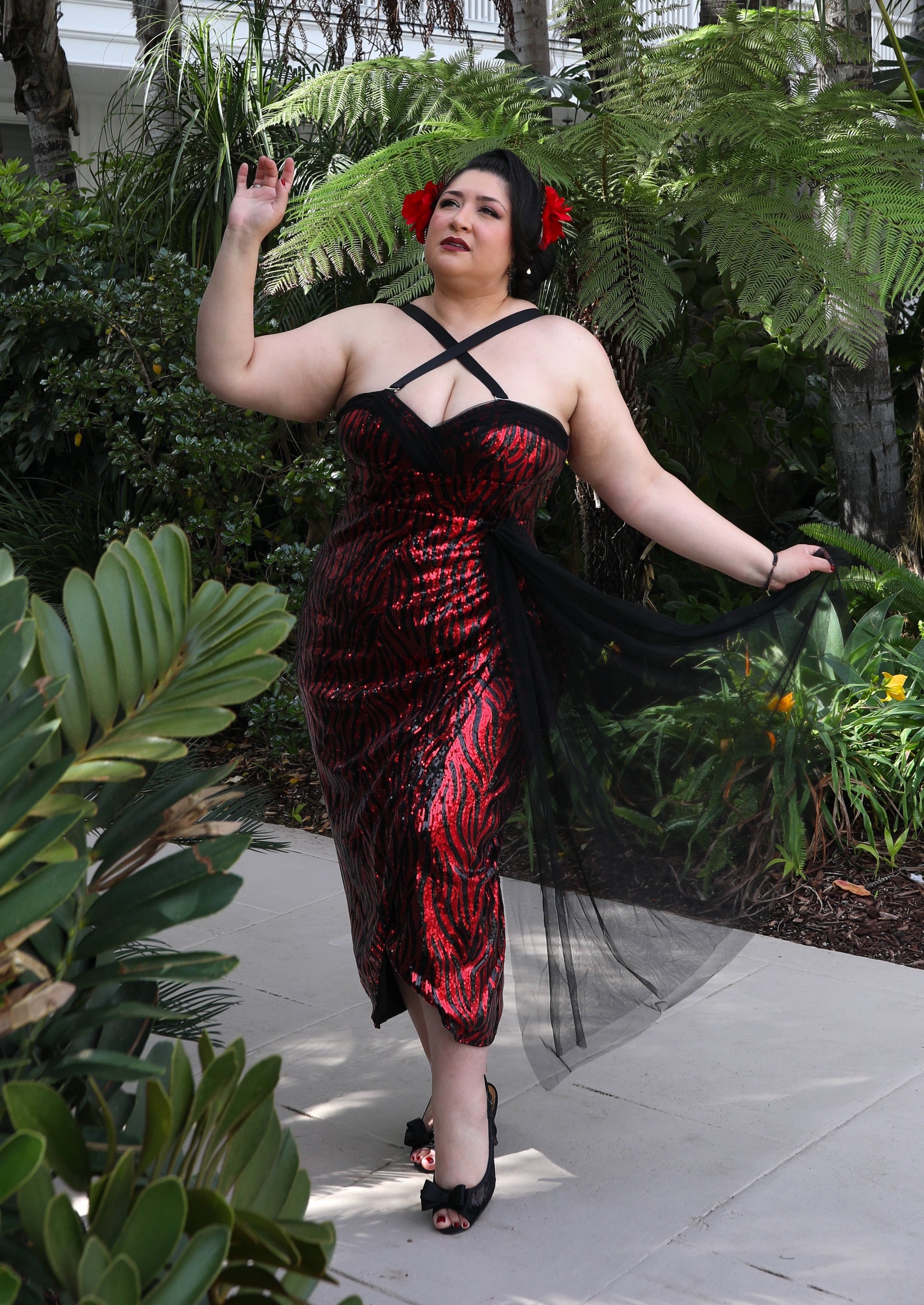 Introducing "The Girl of My Dreams Dress" - a mesmerizing tribute to the iconic tiger print dress that stole hearts when worn by Marilyn Monroe in "The Seven Year Itch"! Crafted from fully lined Red and Black zebra sequins, this sensational show-stopper boasts a comfortable medium stretch that'll hug your curves like a dream. The sweetheart-shaped bust line features delightful tulle details and comes with removable straps for a touch of versatility. The skirt has a ravishing wrap front and features a removable voluminous tulle skirt that'll make you feel like a true Hollywood starlet!
