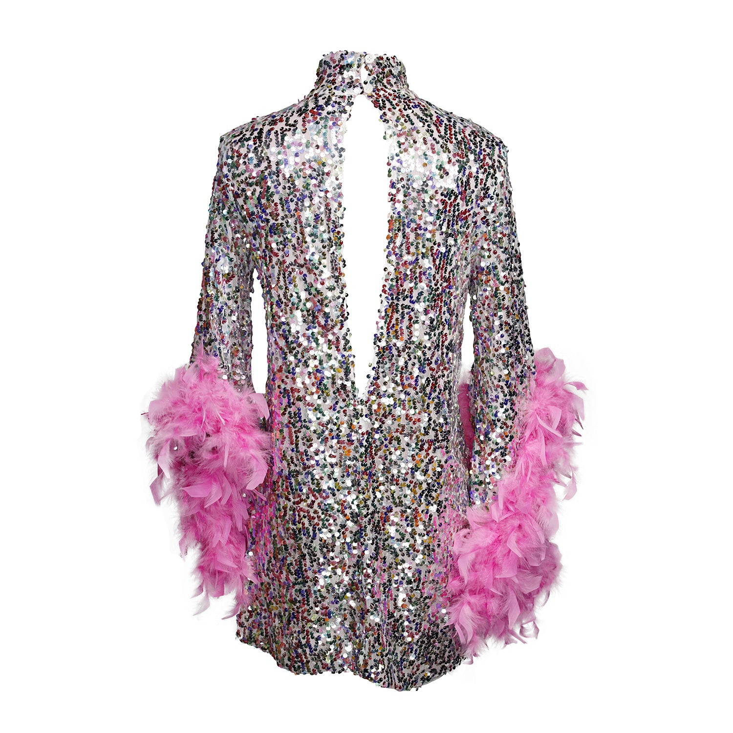 This shimmering rainbow of pastels mod mini dress has it all - glittering sequins, delicate mock neck, and long bell sleeves cuffed with rich pink feathers. An ode to the bold expression of the 1960s, this piece is a statement addition to any wardrobe.